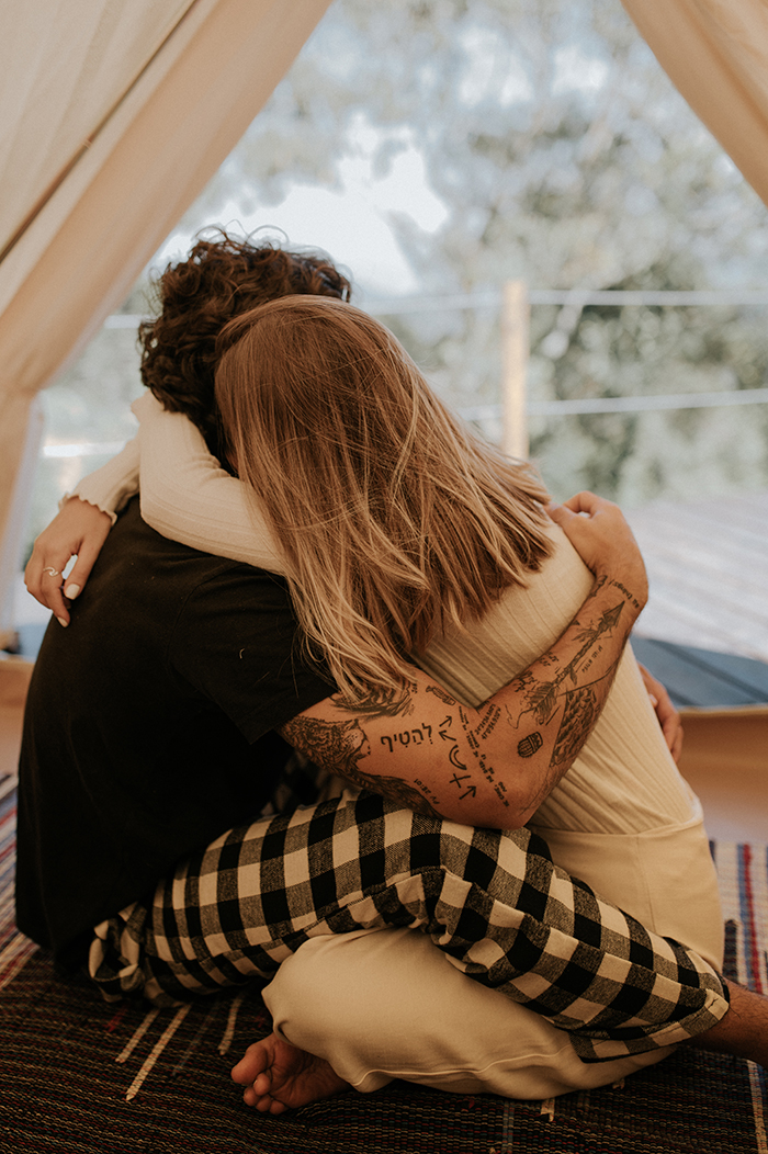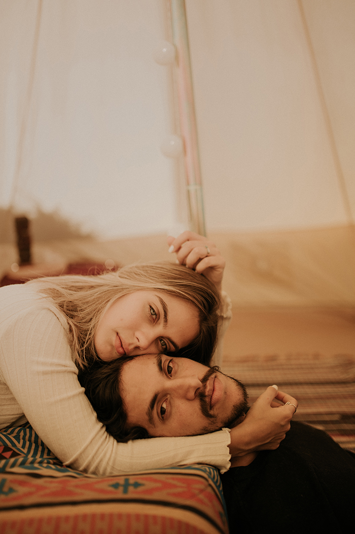 Os dois gostam muito dessa vibe de camping, e quando a fotografa encontrou o espaço na internet, achou que seria a cara deles e que os representaria muito bem. Concordaram e viram que ele tinha muito a essência deles e seria algo diferente. É um local com muito contato com a natureza e é uma experiência incrível no alto da montanha.