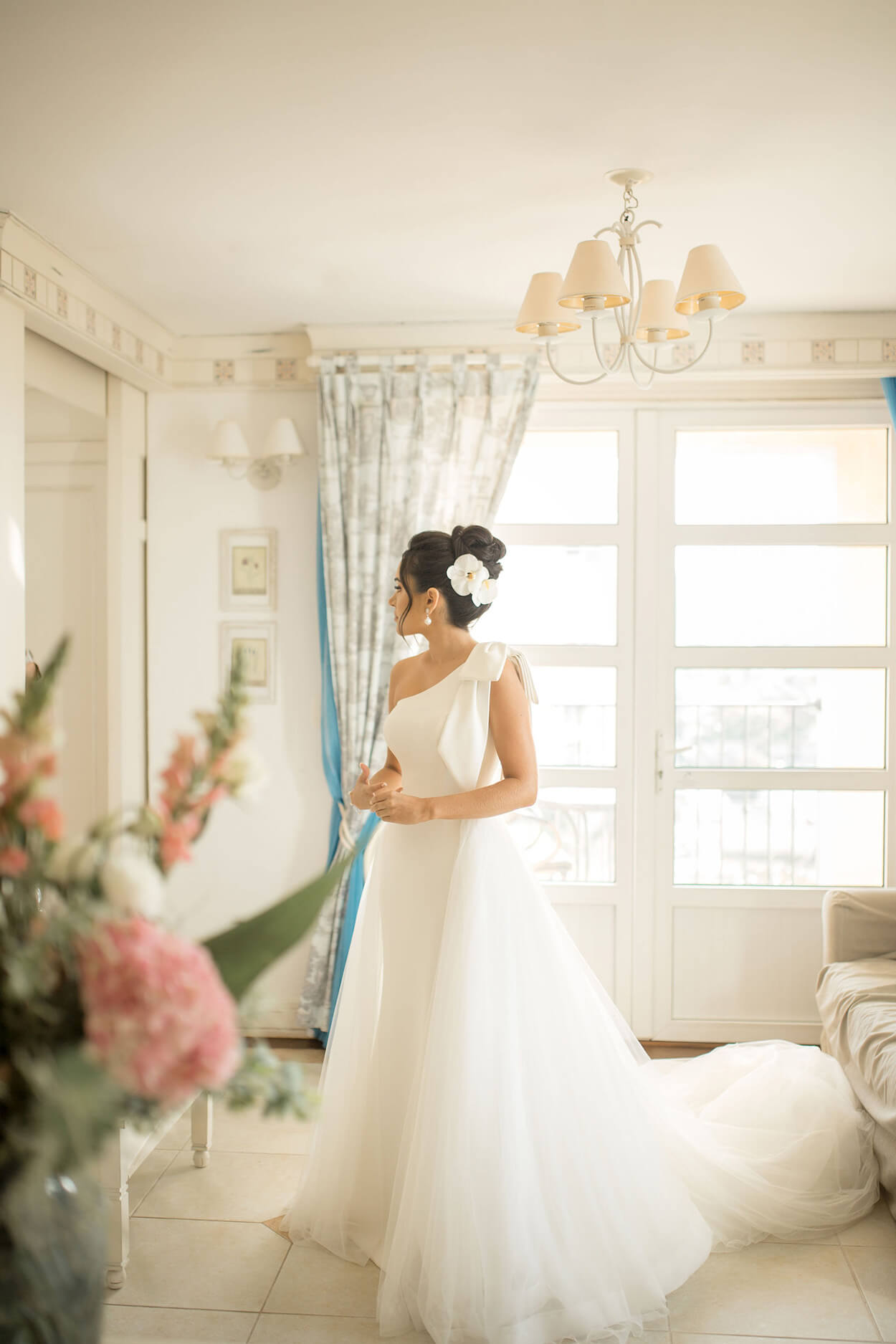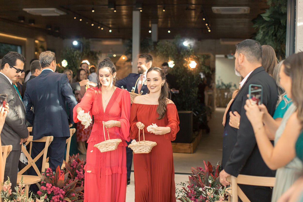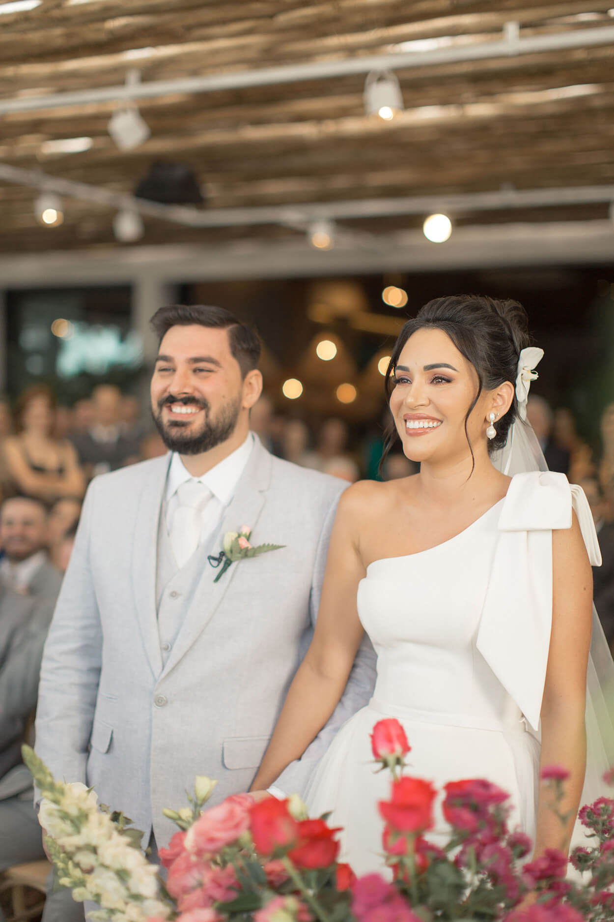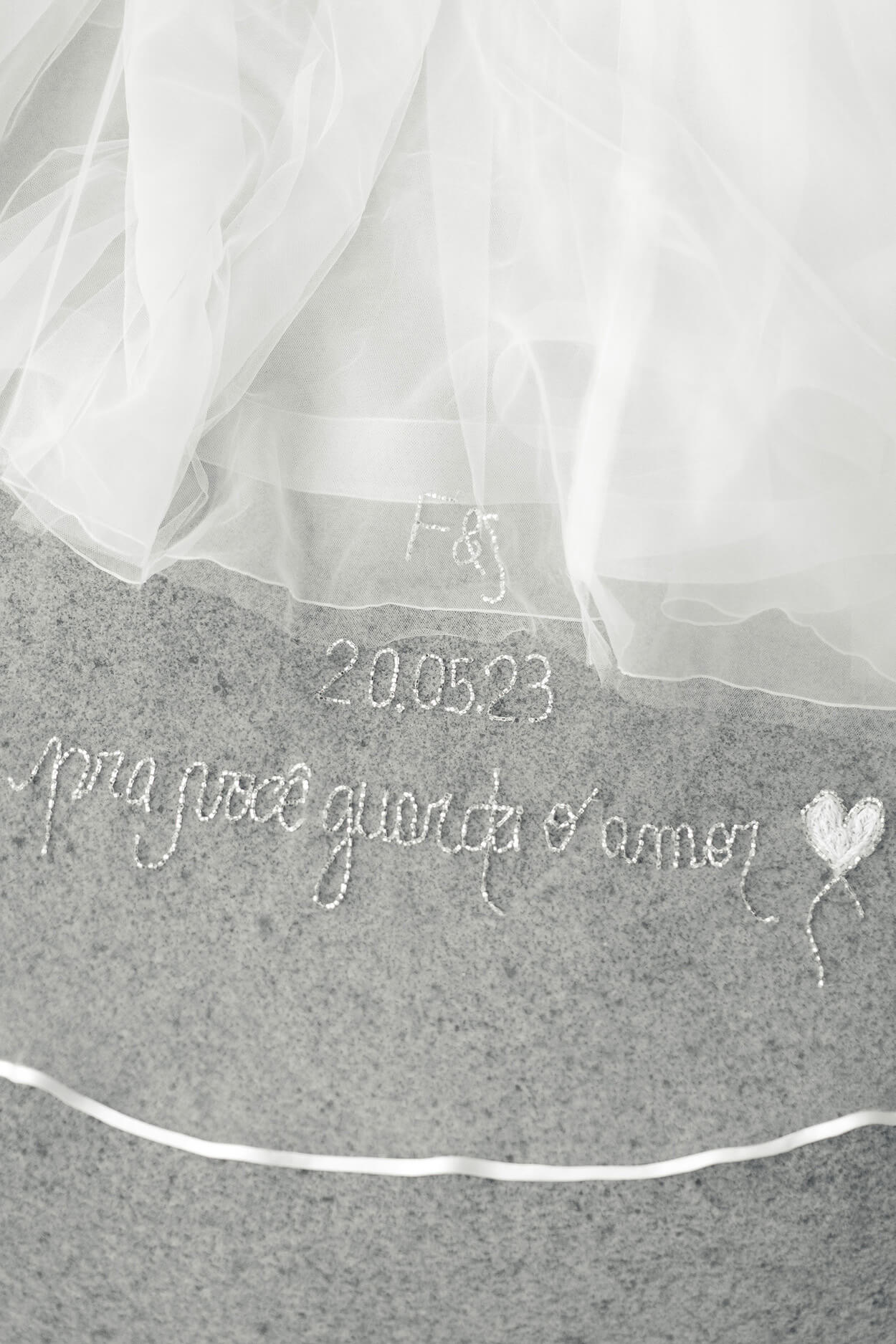 Agora me fala, a Flávia é ou não é o exemplo perfeito de noiva chique e minimalista? Para fechar, o vestido dela é finalizado com a delicadeza e feminilidade de um laço no ombro, um dos elementos tendências para vestido de noiva desse ano, aliás outra tendência lindona que a noiva apostou foi no véu bordado que veio com as iniciais do casal, a data do casamento e a fras “pra você guardei o amor”.