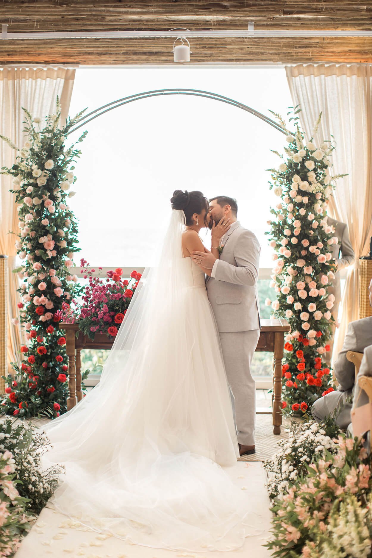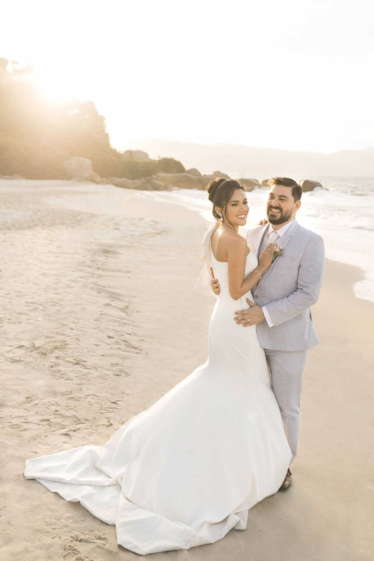 noivos prestes a se beijar à beira mar de praia em florianopolis