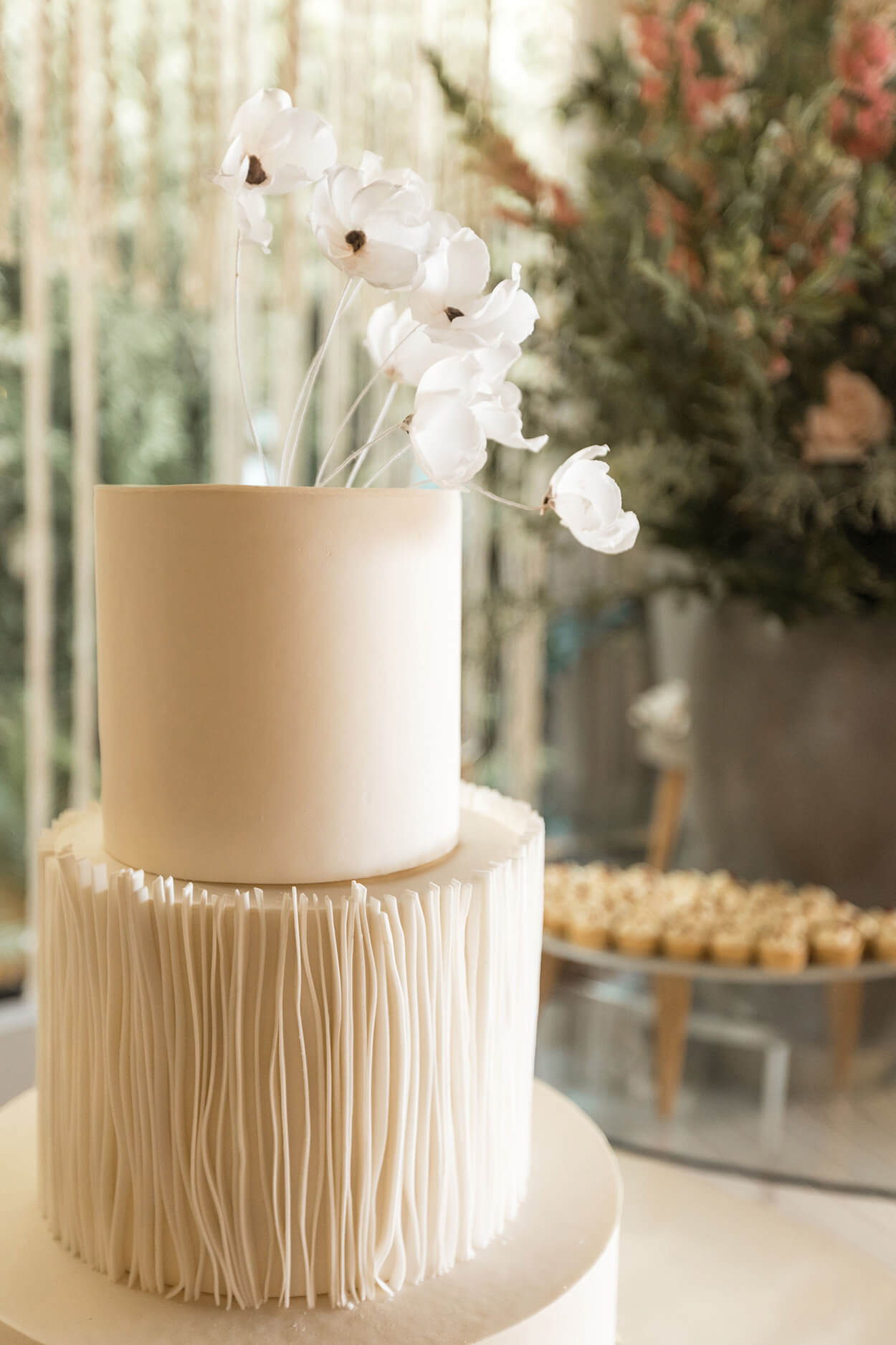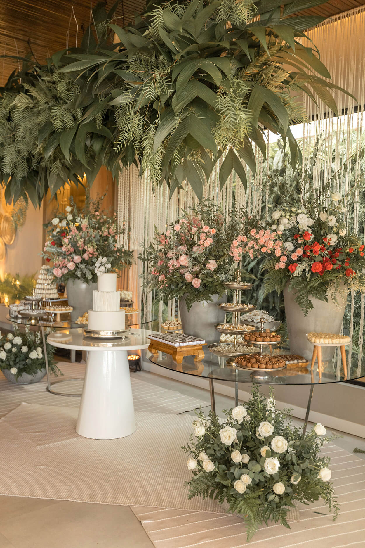 Falando nisso, nós amamos quando o decorador investe em arranjos pendentes para dar um charme especial sobre a mesa do bolo.