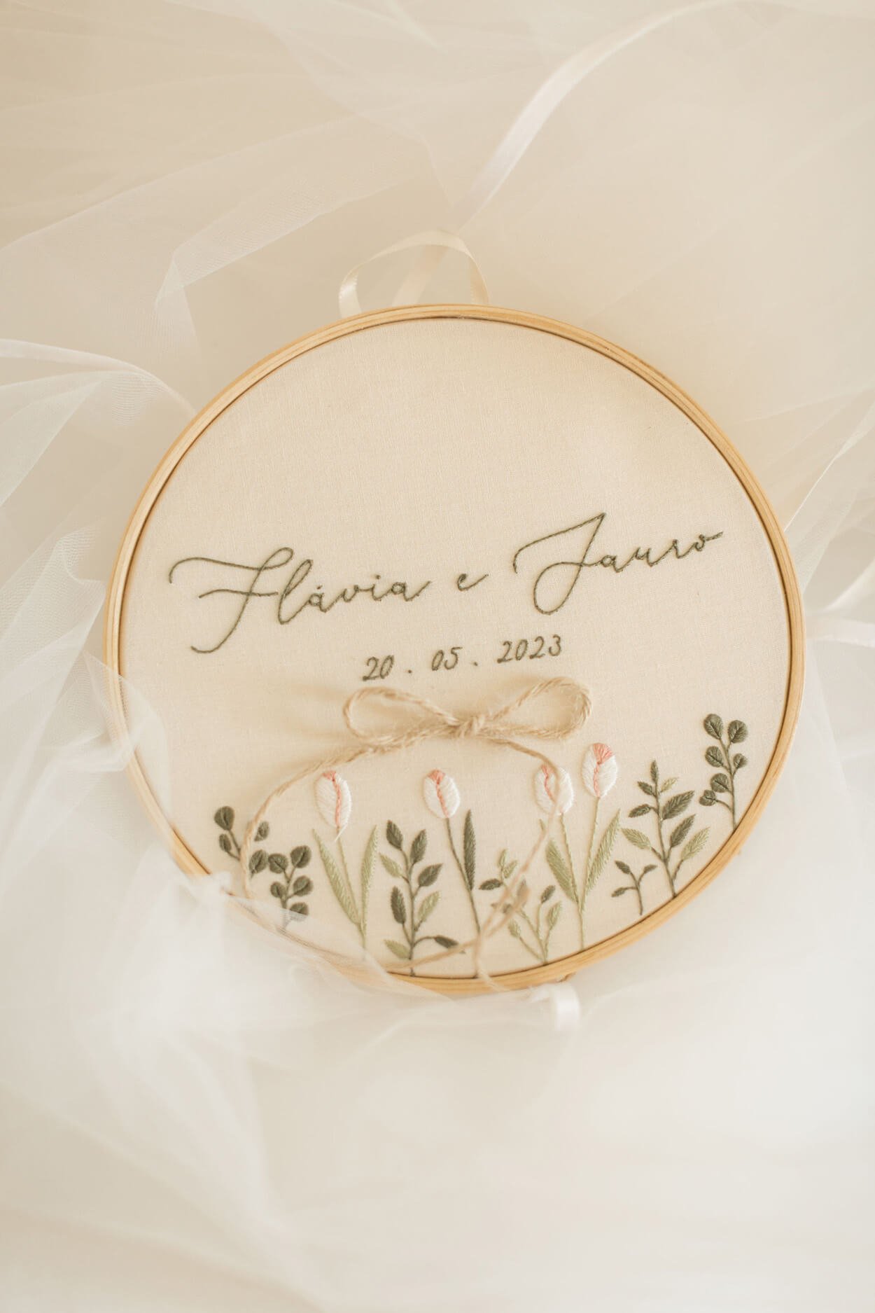 mulher idoa com cabelo branco preso e vestido rosê levando o porta alianças bordado