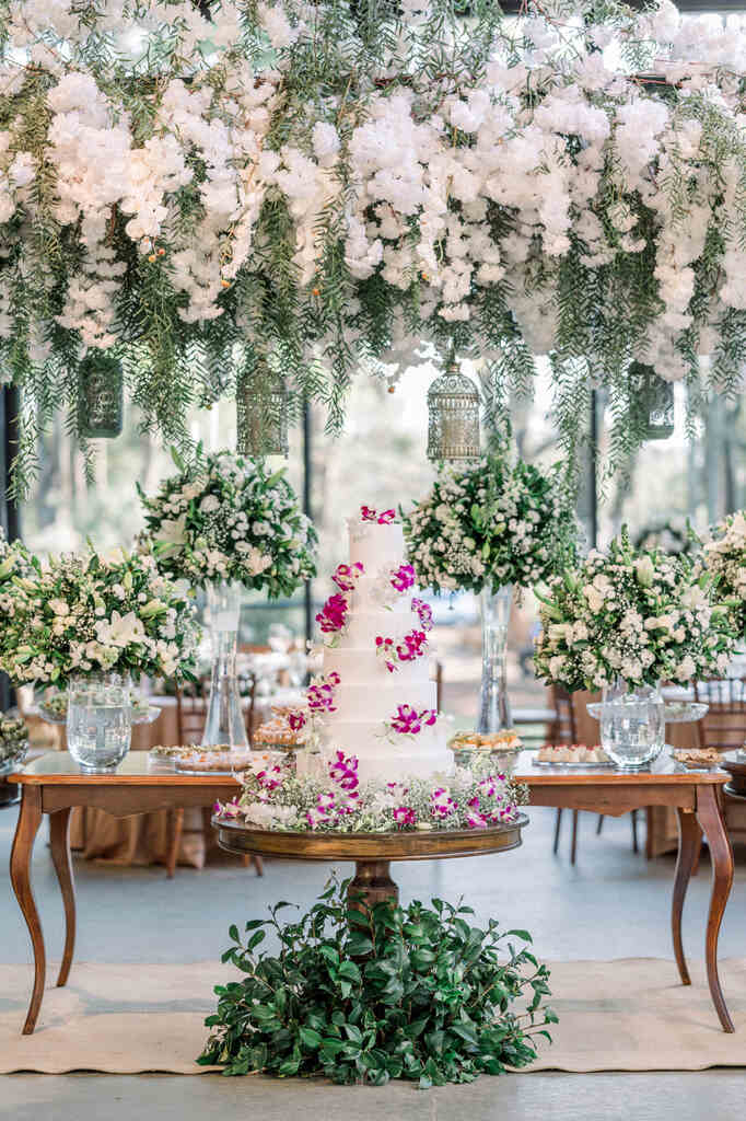 A proposta foi uam decoração clássica e elegante e apenas um toque da cor favorita da noiva no bolo e também no buquê de cascata de mini orquídeas.