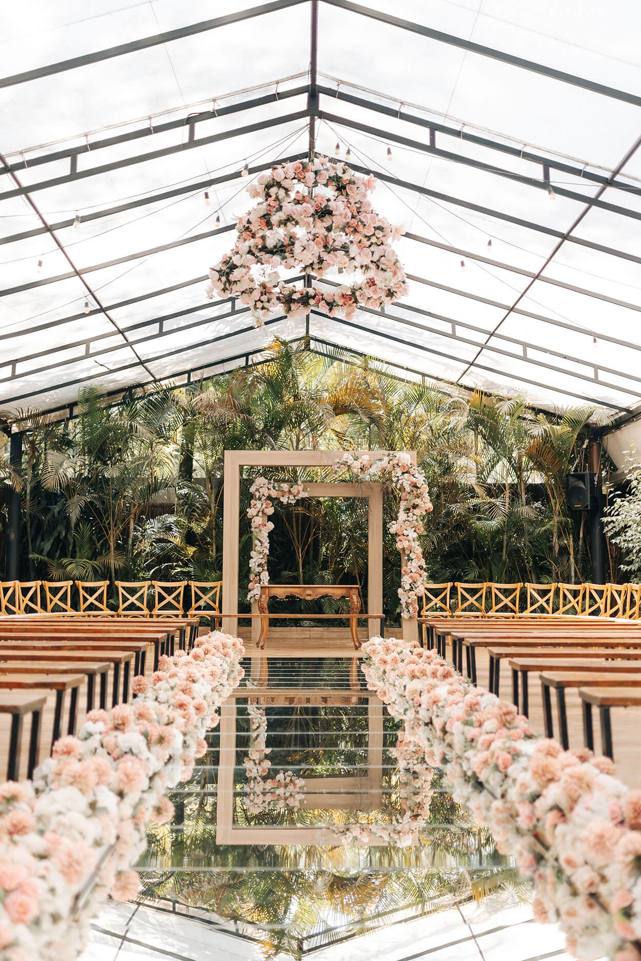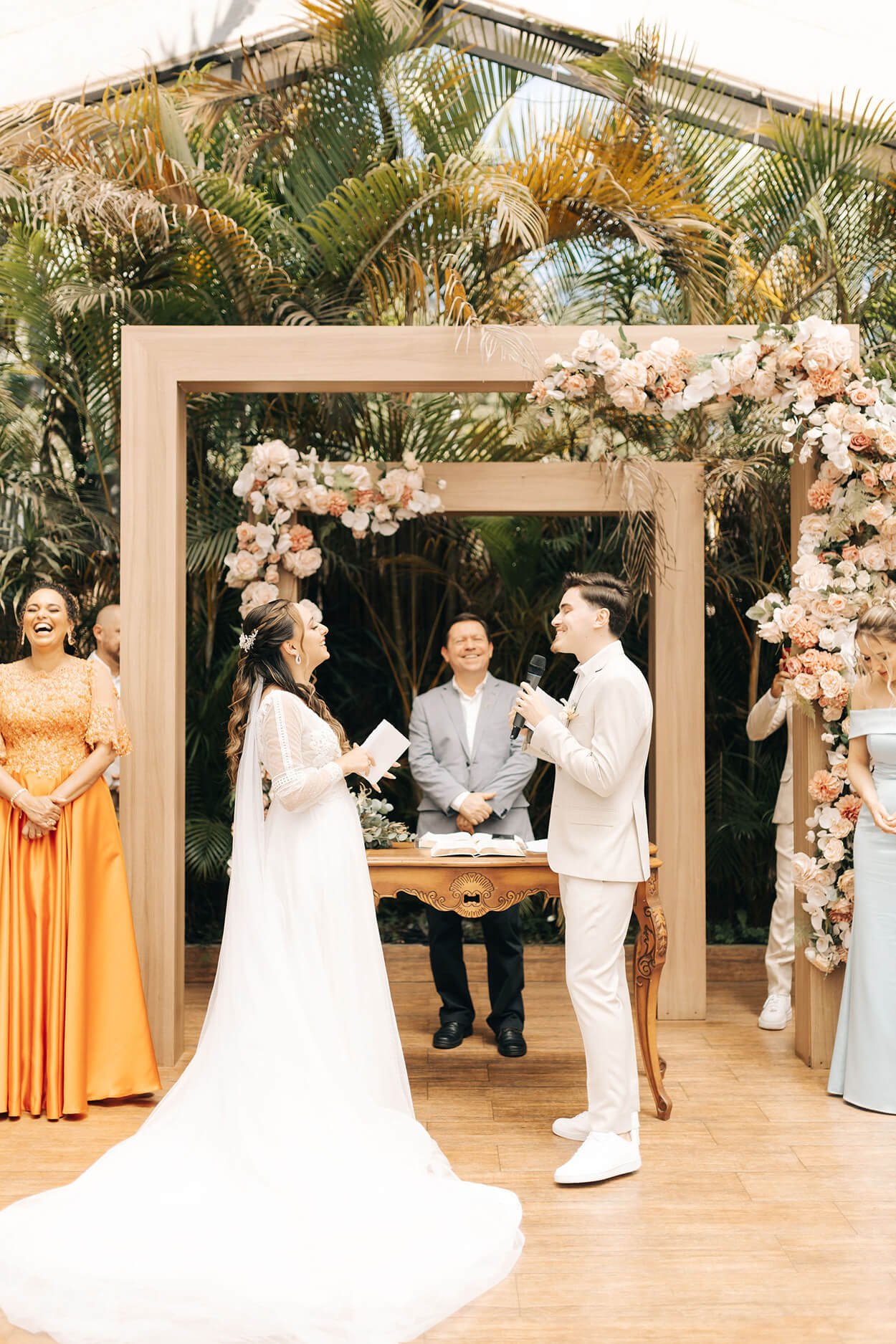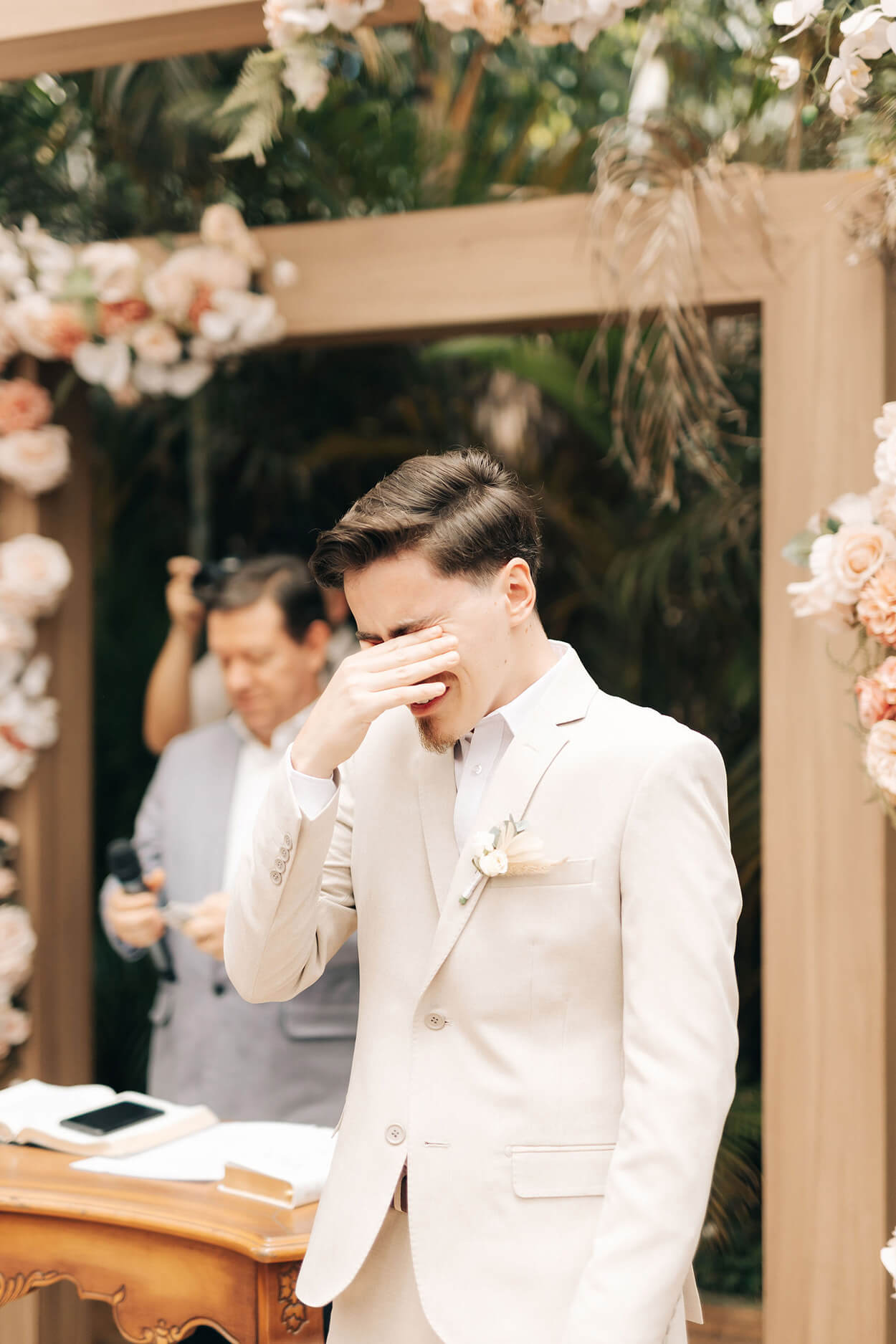 Tem coisa mais linda do que essa reação do noivo? O Junior Souza tem uma sensibilidade incrível, por isso, sempre capta os momentos mais emocionantes da cerimônia. O altar foi todo decorado com rosas e orquídeas, e nós adoramos esses arranjos pendentes!