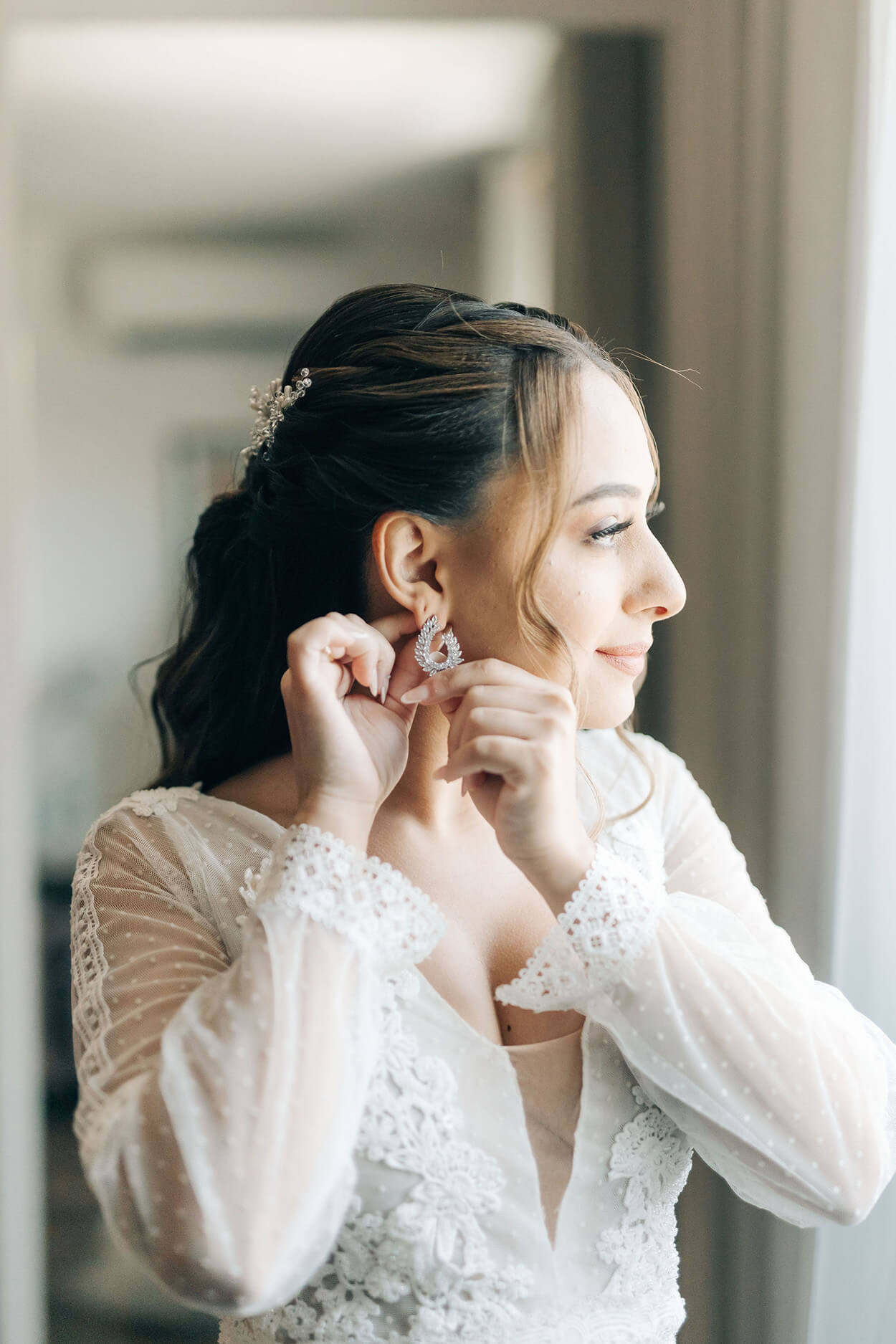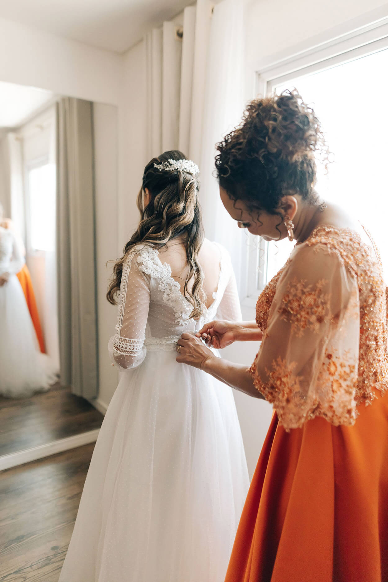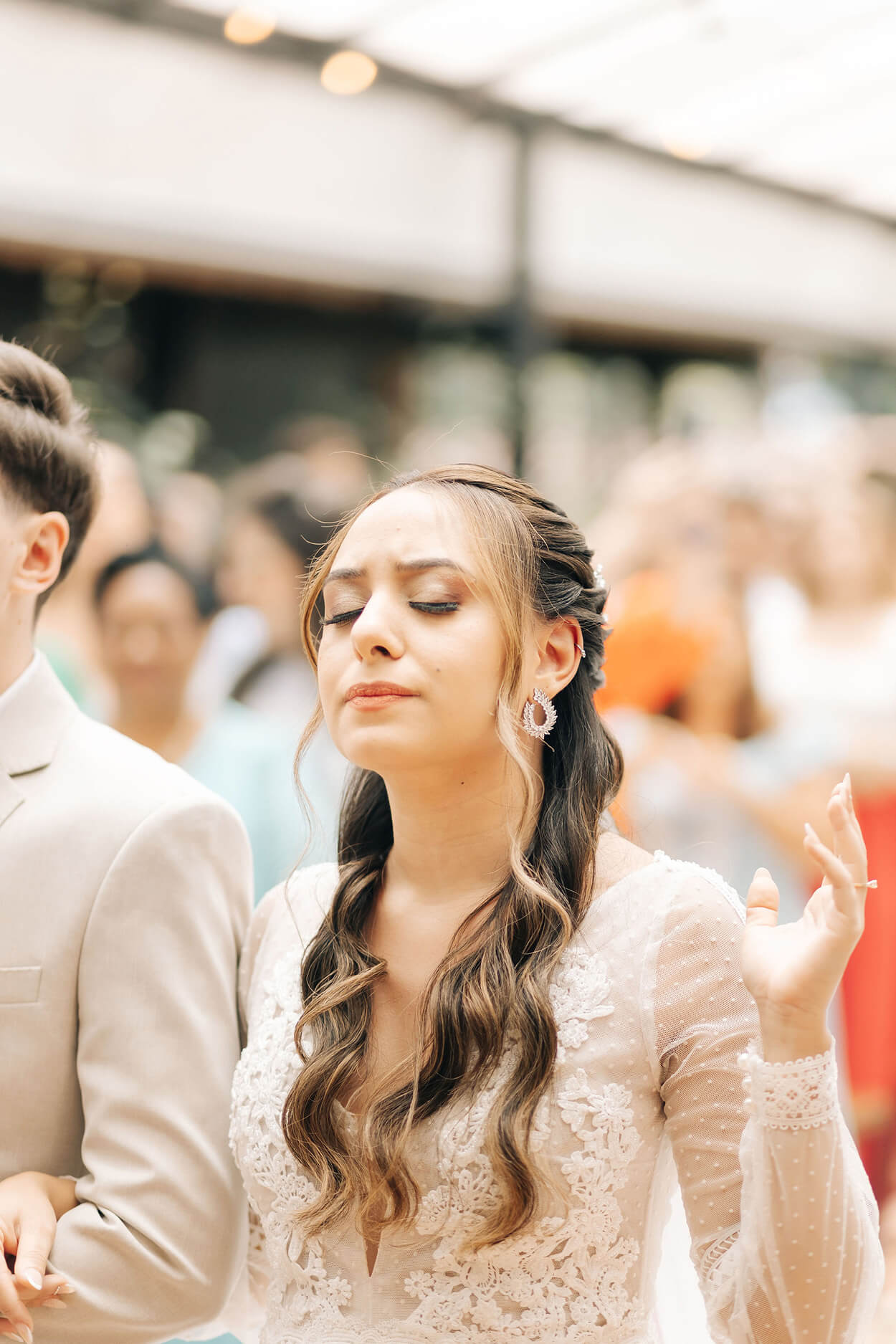 Mesmo sendo um casamento tradicional, a Noelle escolheu um vestido mais leve, afinal, ela queria algo sem muito brilho, simples mas bonito. Repare que as mangas e todo o corpo do vestido conta com tecido com poás discretos. Já o buquê é uma releitura do formato redondo.