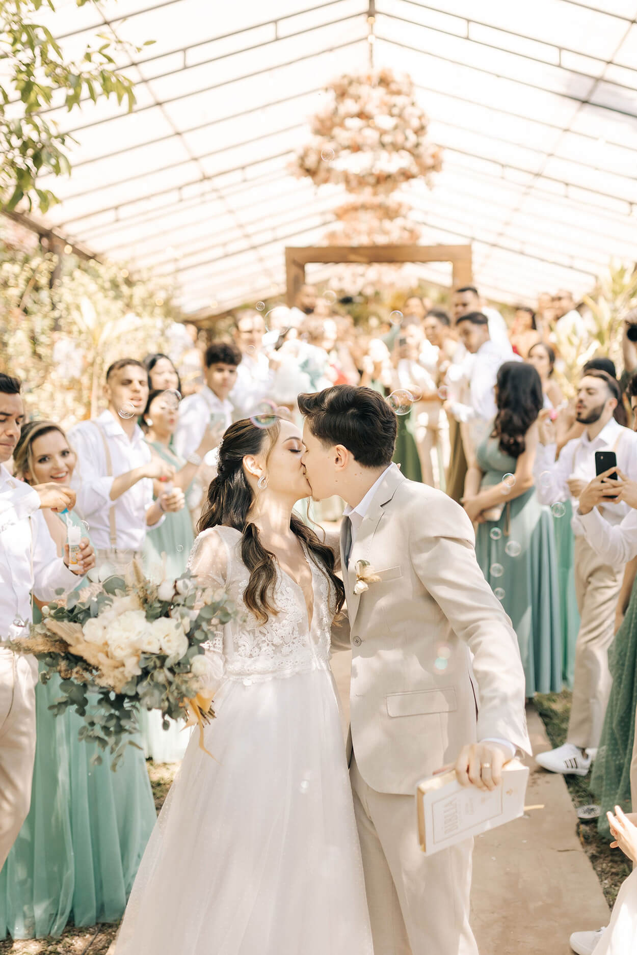 A gente sabe que escolher os padrinhos dá até aquele friozinho na barriga, mas parece que a Noelle e o Igor tiraram isso de letra. Eles escolheram pelo menos 12 padrinhos! Os padrinhos usaram exatamente os mesmos trajes: camisa, calça com suspensórios e tênis branco. Por outro lado, as madrinhas puderam variar nos tons, assim os vestidos variaram entre o azul claro até o verde sage.