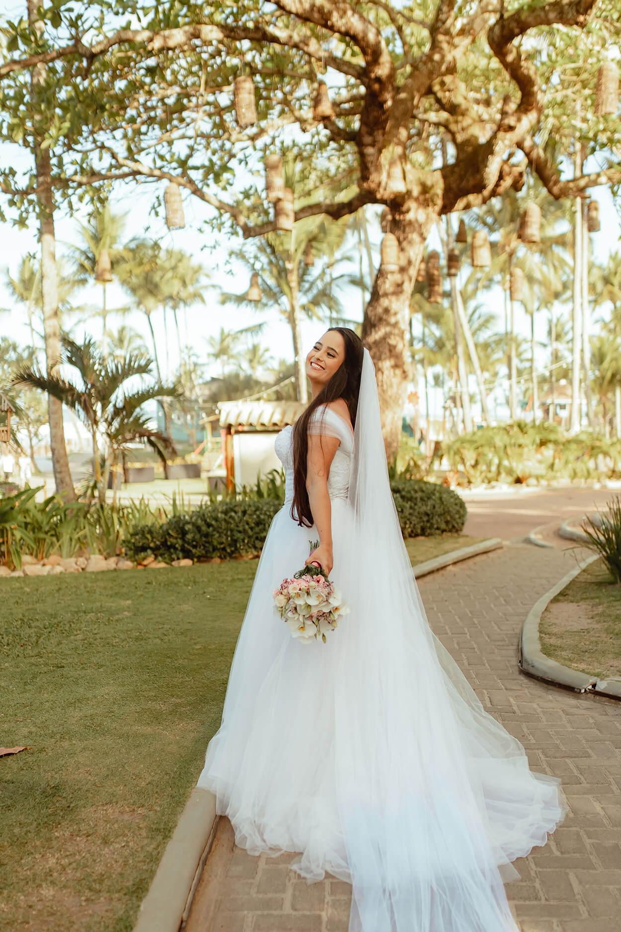 E podemos notar a influência romântica na saia e mangas em tule. Para completar, o buquê é uma mistura de delicadas flores rosas com orquídeas brancas.