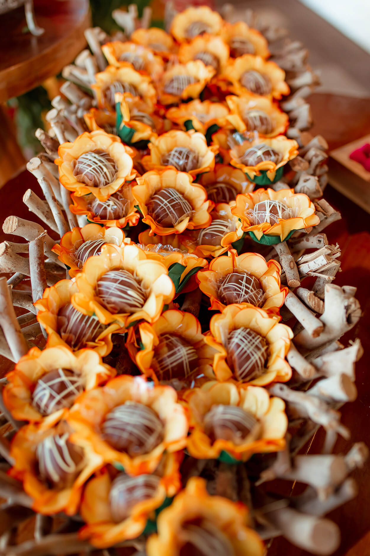 Repare que tudo é muito orgânico, com detalhes como os sousplats, bandejas, suporte para bolo e as luminárias que remetem ao estilo mais rústico.