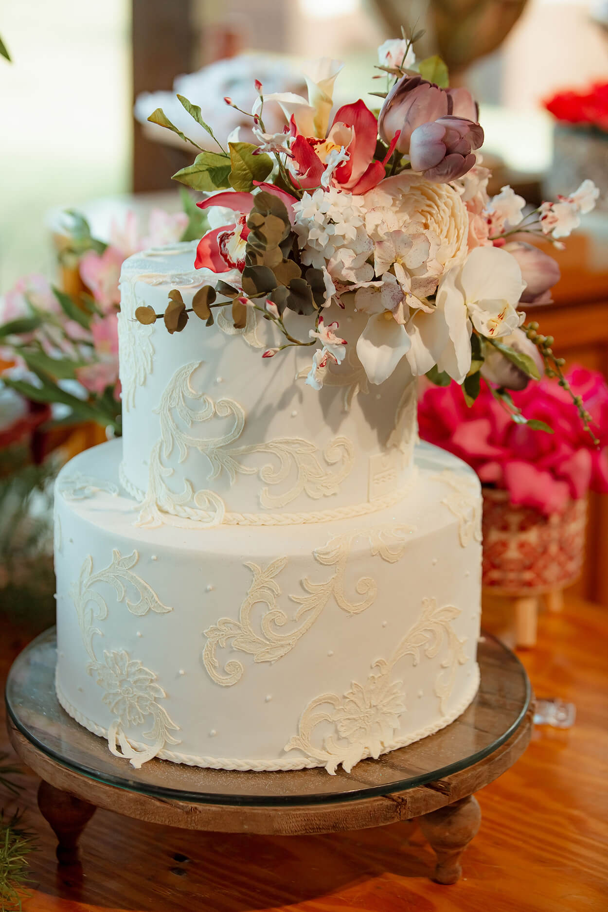 O bolo redondo é sempre uma boa pedida! Mas aqui ele ganha uma aparência diferenciada graças à textura que imita bordados e um topo floral para ninguém por defeito.