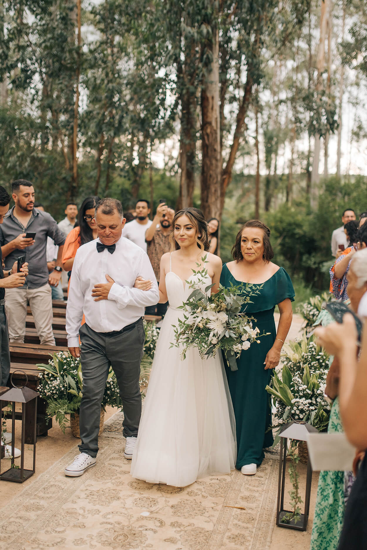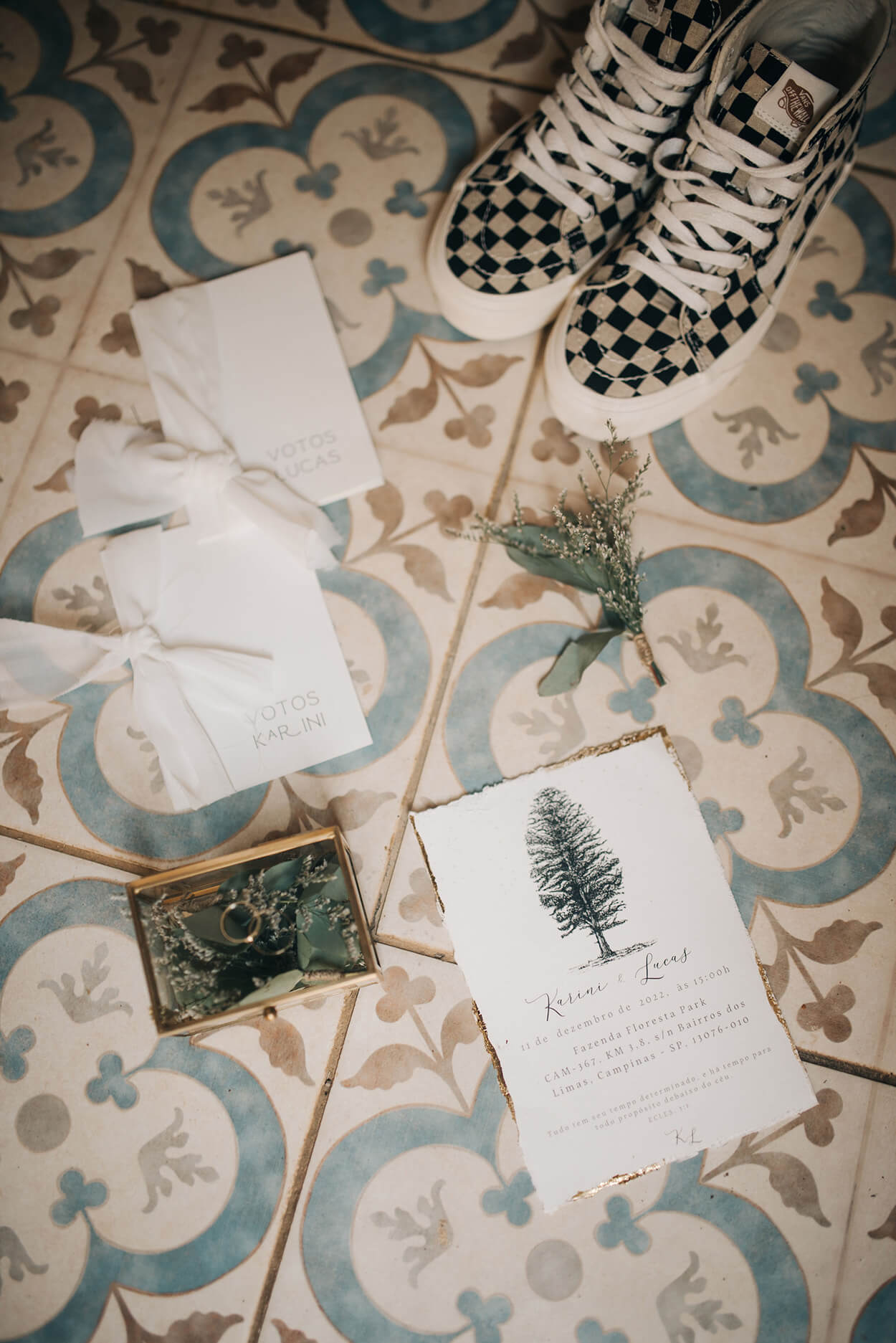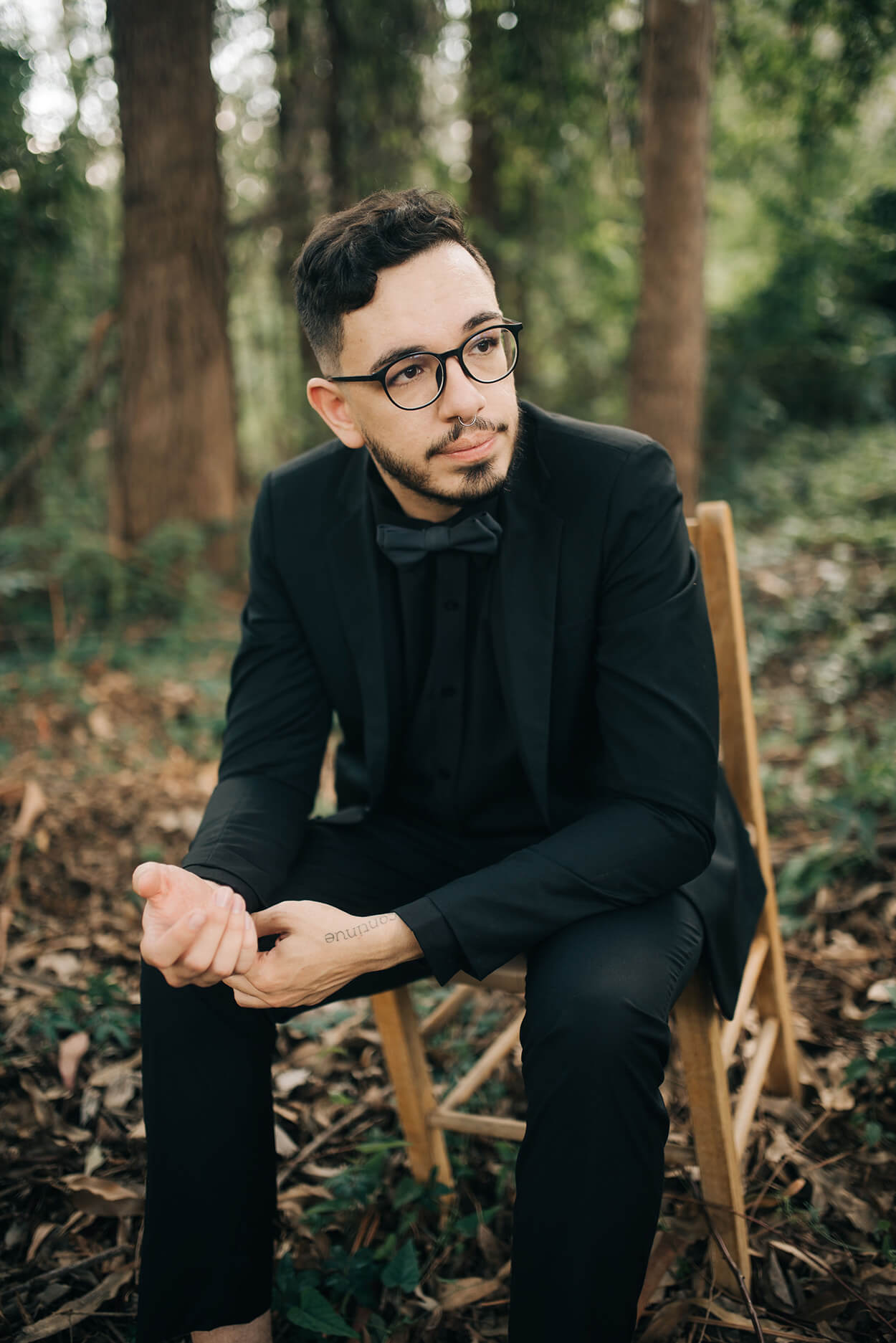A paleta toda verde e branca do casamento abre a possibilidade de várias cores para o traje do noivo. Ficaria lindo um terracota, bordô ou até um terno azul. Mas o Lucas fez uma escolha mais ousada: o traje all black!