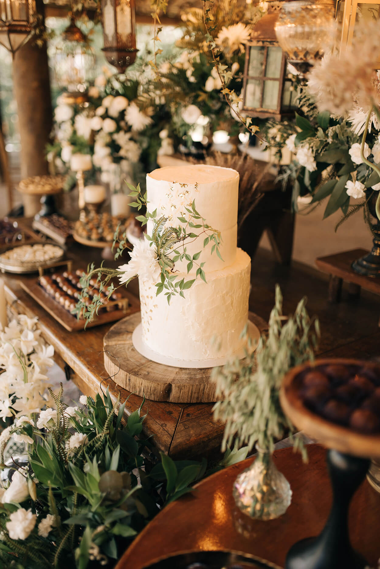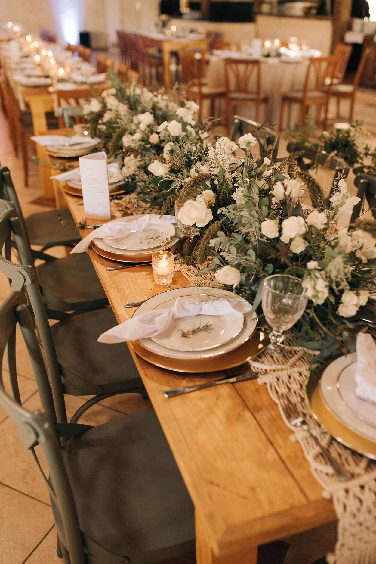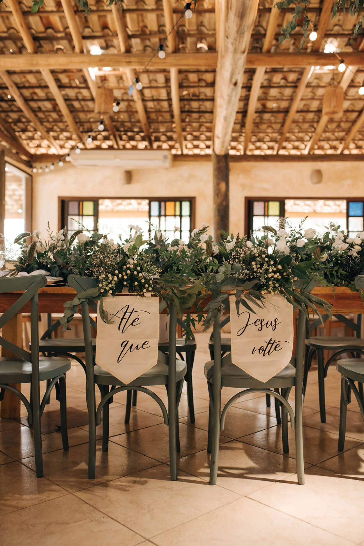 A mesa posta é uma das nossas partes favoritas da decoração! O salão rústico recebeu mesas com cadeiras clássicas repaginadas com um belo sage green. Além disso, o centro conta com uma passadeira de macramê e um arranjo volumoso com flores brancas.