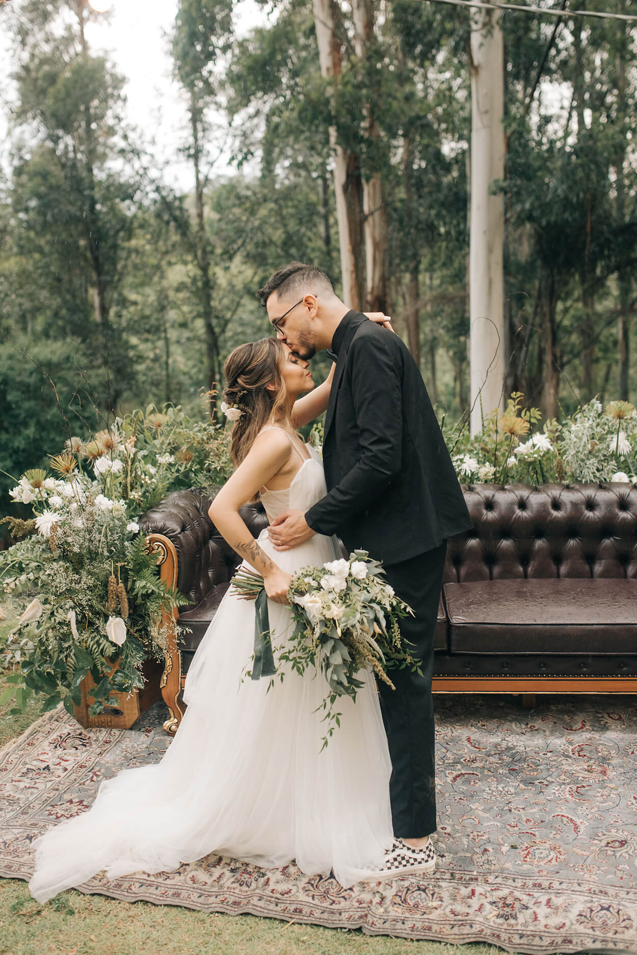 A paleta toda verde e branca do casamento abre a possibilidade de várias cores para o traje do noivo. Ficaria lindo um terracota, bordô ou até um terno azul. Mas o Lucas fez uma escolha mais ousada: o traje all black!