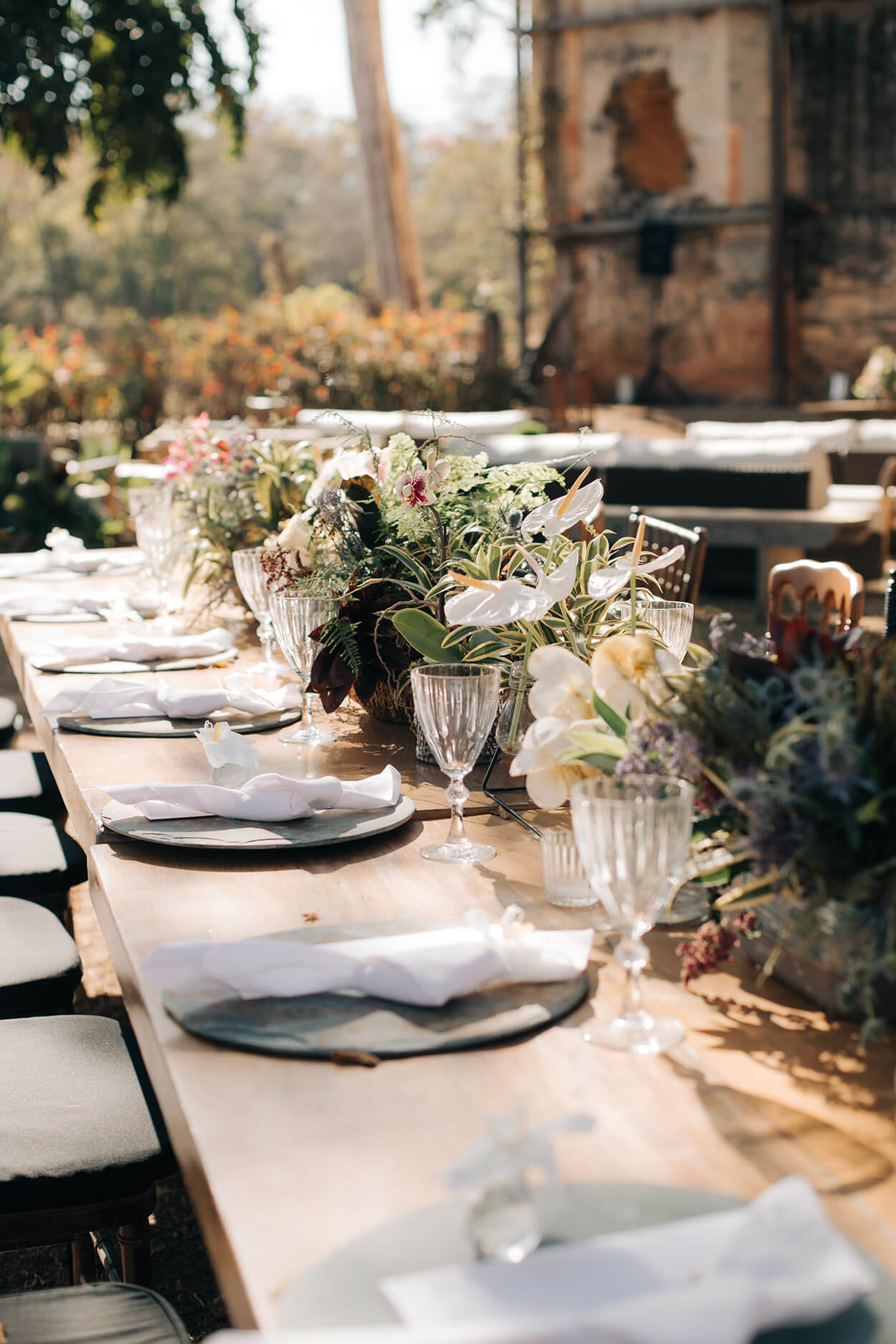 Mesa de madeira rústica posta e com pequenos arranjos de flores rosa, branco laranja e roxo na mesa