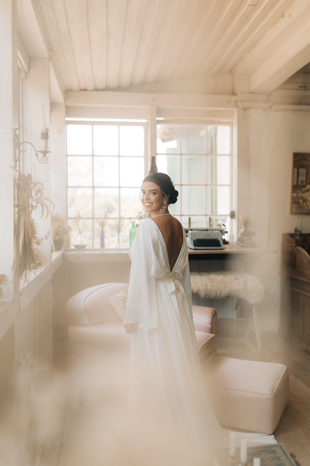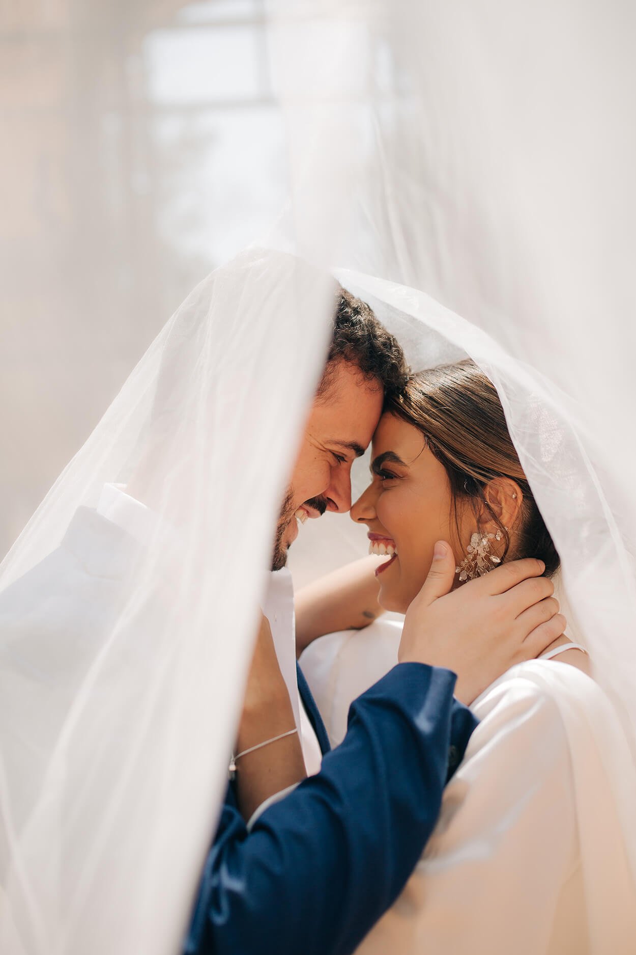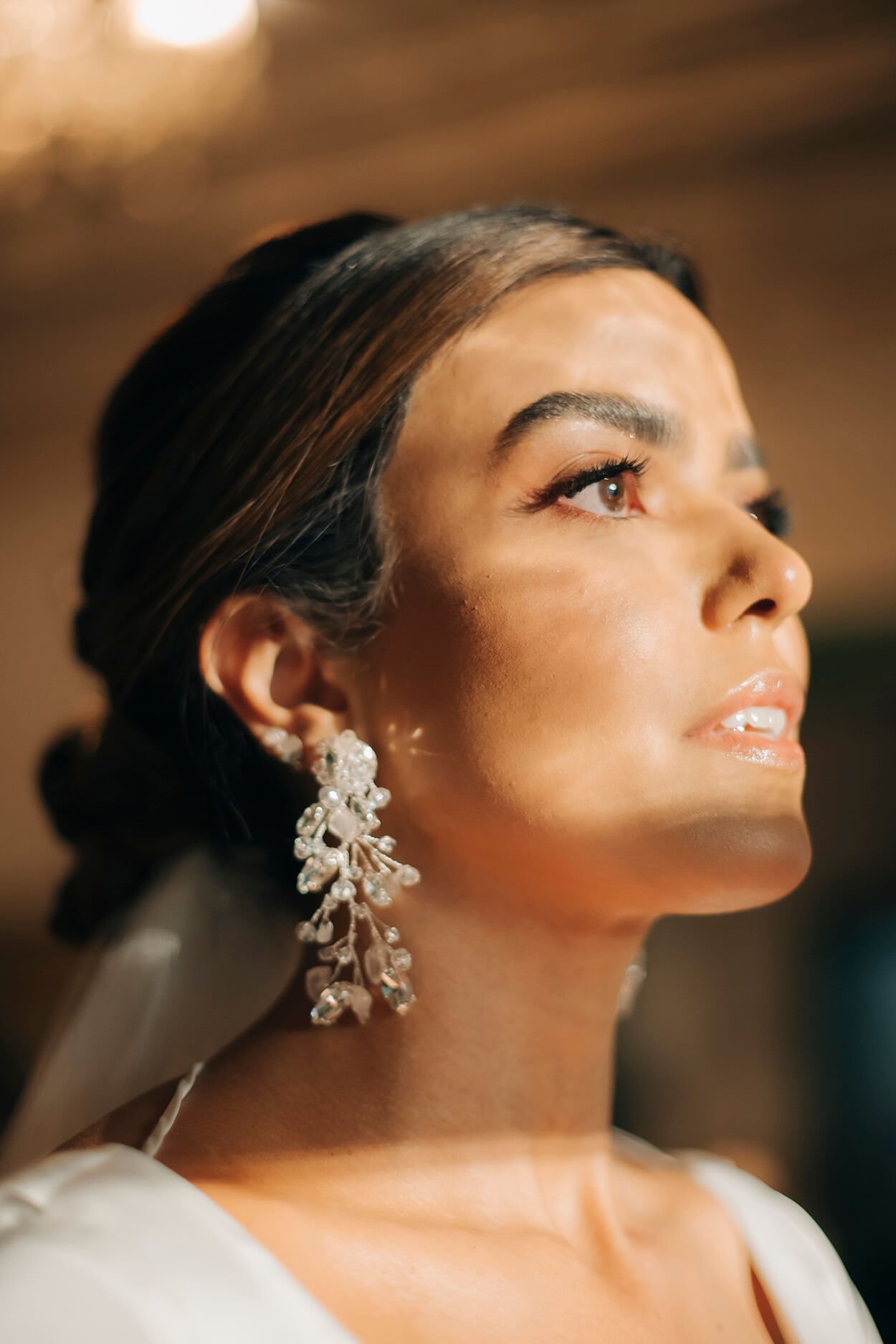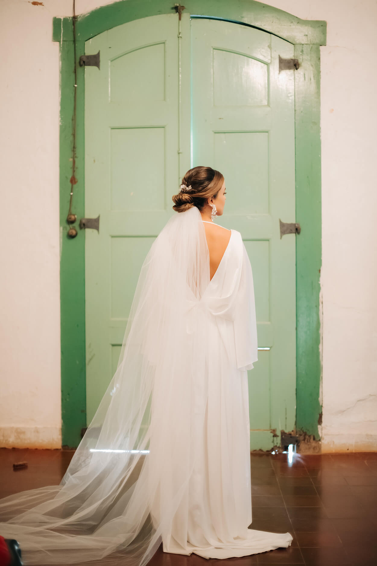 O mais legal é que a escolha do espaço combinaria perfeitamente com um vestido boho, cheio de rendas e delicadezas. Assim, nos surpreendemos ao ver esse modelo leve, minimalista e com ares modernos. A noiva ficou ainda radiante com uma make simples, porém iluminada. Por outro lado, a beleza contrasta com o brinco maxi cheios de quartzo, elaborado pela Nat co. Bride. O acessório para cabelo também é assinado pela marca.