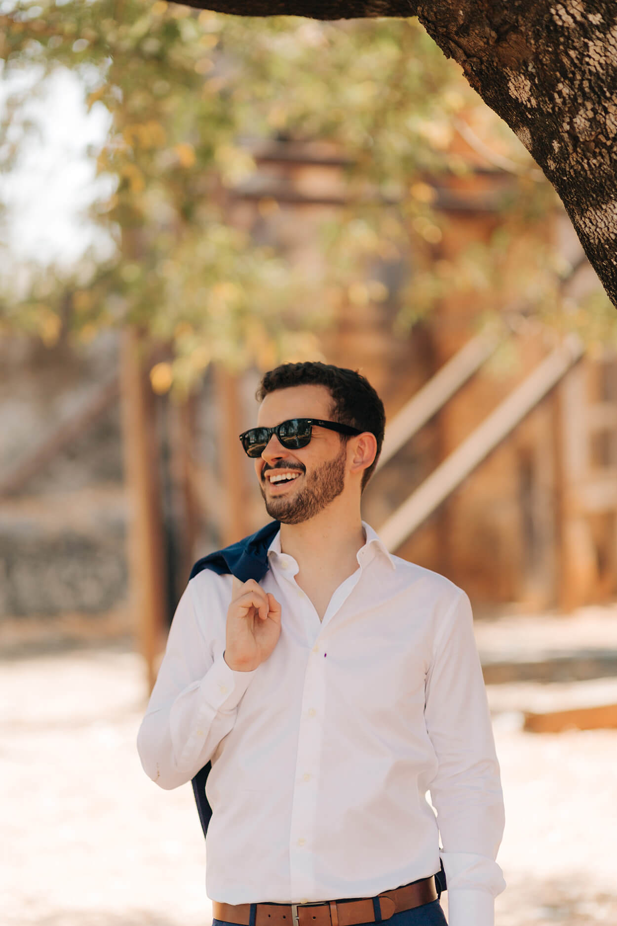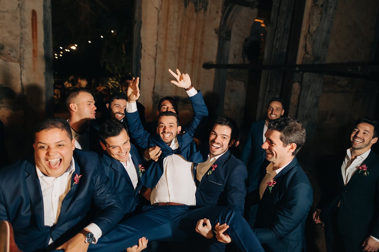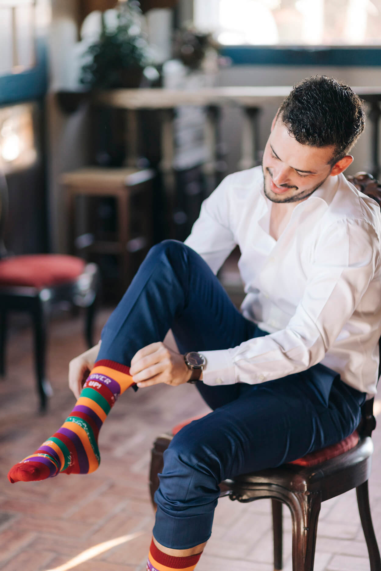 Já começamos com tudo! Quem viu o noivo assim no altar, jamais imaginaria que ele está usando um par de meias bem coloridas. A personalidade criativa e descontraída dos dois apareceu também no convite dos padrinhos. Além de um monóculo com fotos e uma caritura, os padrinhos ganharam meias personalizadas e um short com a caricatura dos noivos.