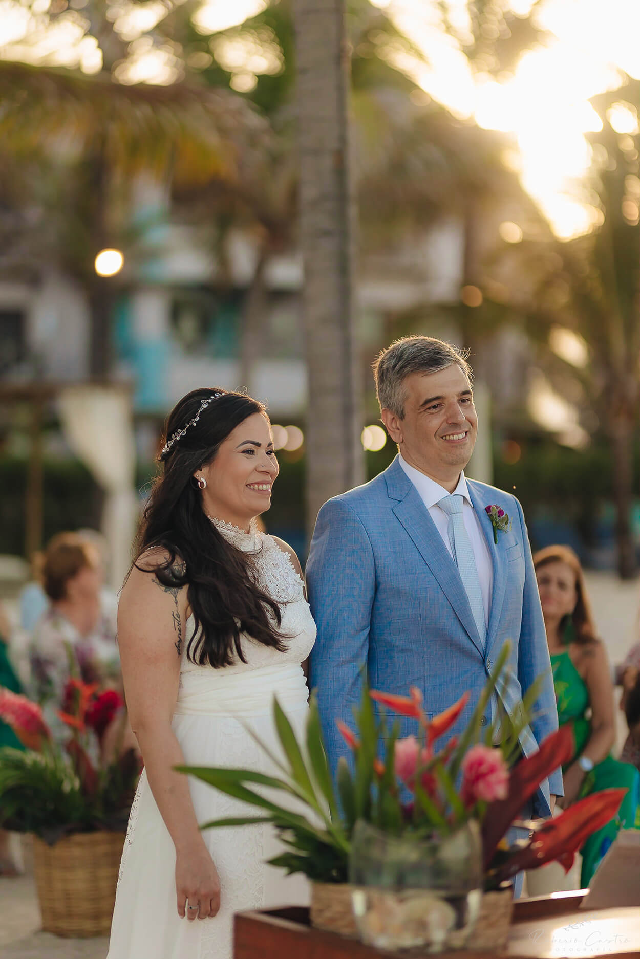 Fica claro a escolha do noivo por um visual um pouco mais formal para uma festa pé na areia, mas que não chega a passar do ponto. Enquanto isso, a noiva também seguiu a proposta com um vestido mais fechado, com a gola tipo halter neck. Já o penteado tem uma pegada mais comportada mas que ganha ares de delicadeza com a tiara.