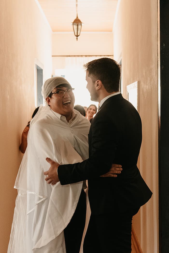 O Gustavo fazendo uma surpresa no final dos votos, tocando e cantando a música “Caneta e Papel” de Os Arrais. Foi uma música que marcou o relacionamento dois dois e é cheia de significado.