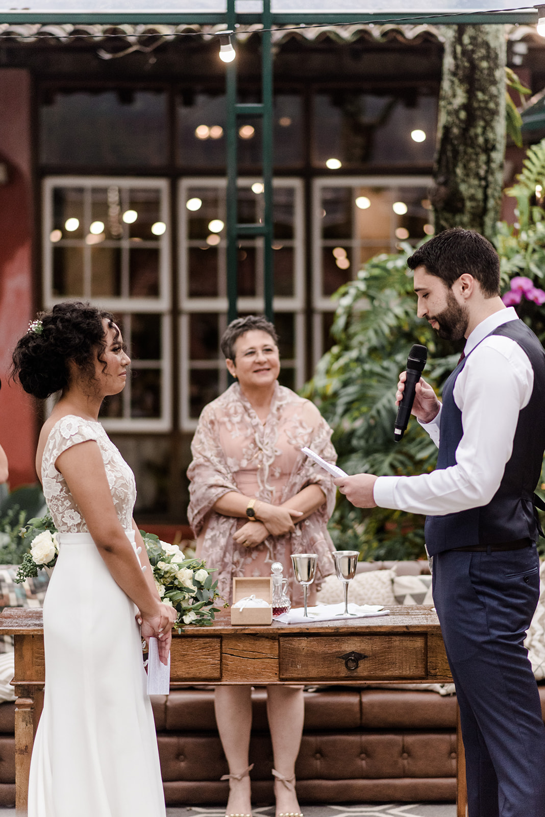 Durante a semana a Bárbara e o Leo conversaram com a assessora, e ali já começaram a desenhar um plano B. “Para a nossa surpresa, o plano B foi o que tornou a cerimônia ainda mais especial e intimista, pois, como estávamos em um local mais fechado, conseguimos ouvir todas as reações, comentários e risadas dos nossos convidados logo atrás.”