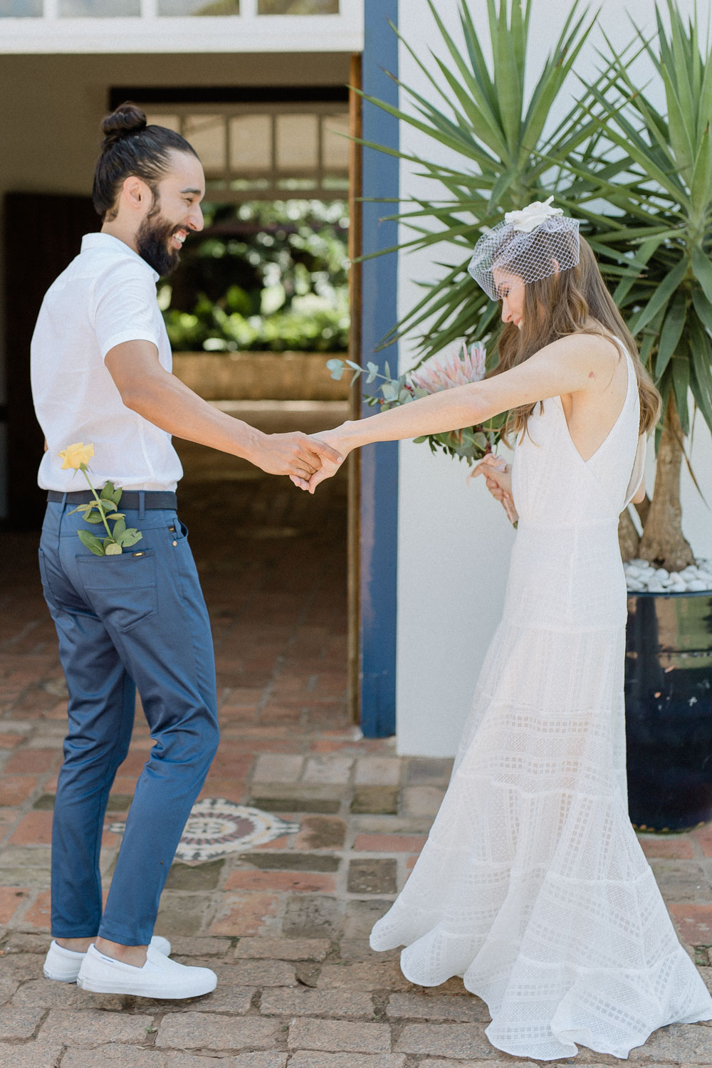 Dá inclusive para fazer variações do first look, como o first touch e o blind date. No first touch os noivos apenas se tocam e não se vêem, e no blind date, onde somente a noiva vê o noivo. Para saber mais sobre essas versões; nós temos um post bem completinho com todas as dicas para arrasar nas fotos do grande dia, passa lá para dar uma lida.
