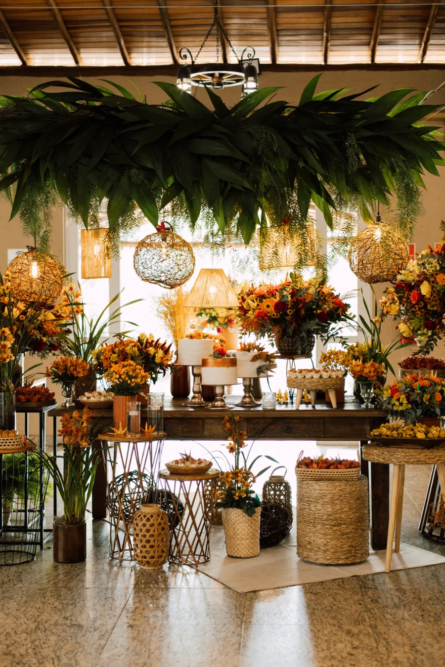 espaço de casamento com flores com cores quentesmesa de bolo rústica