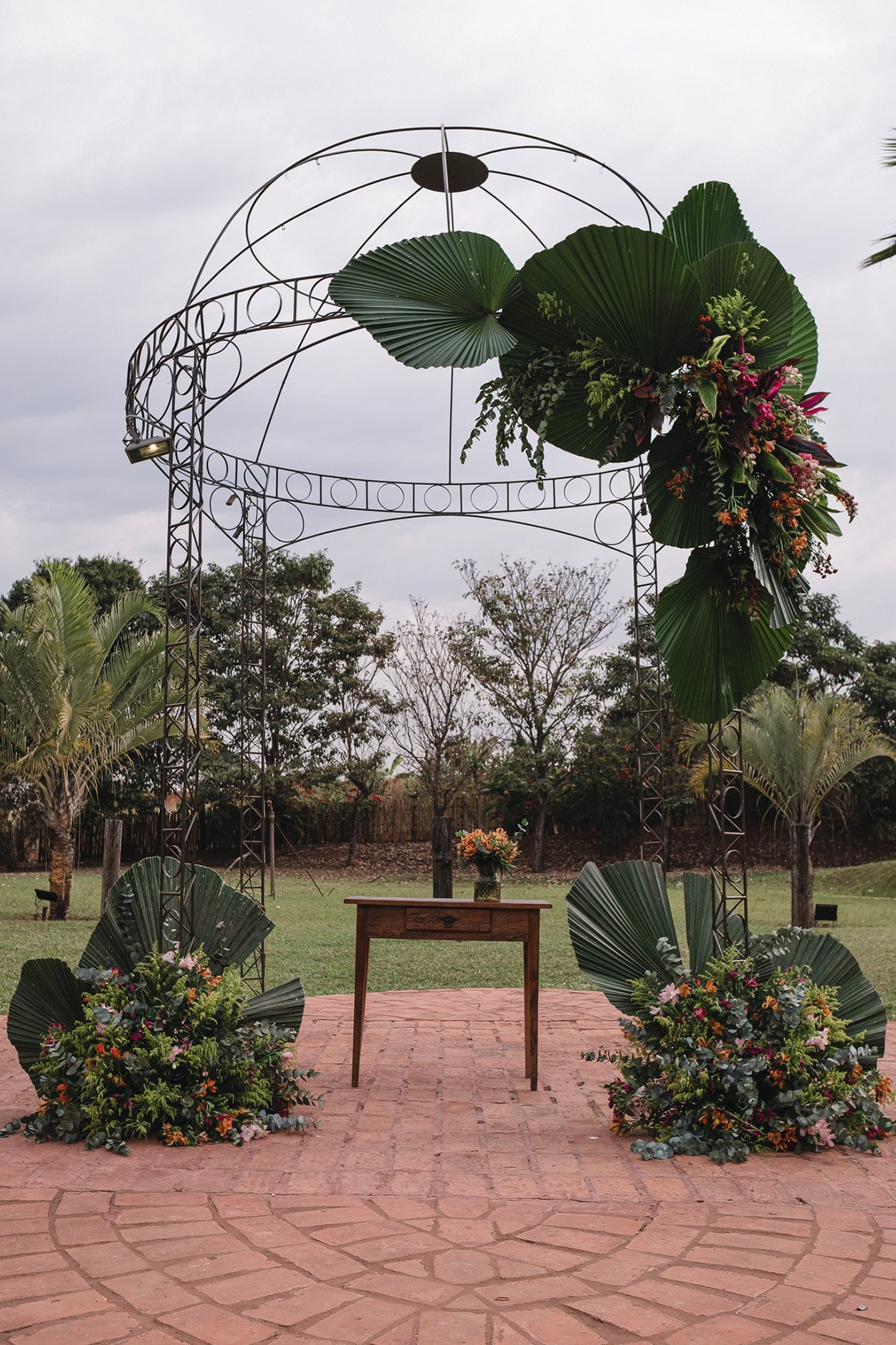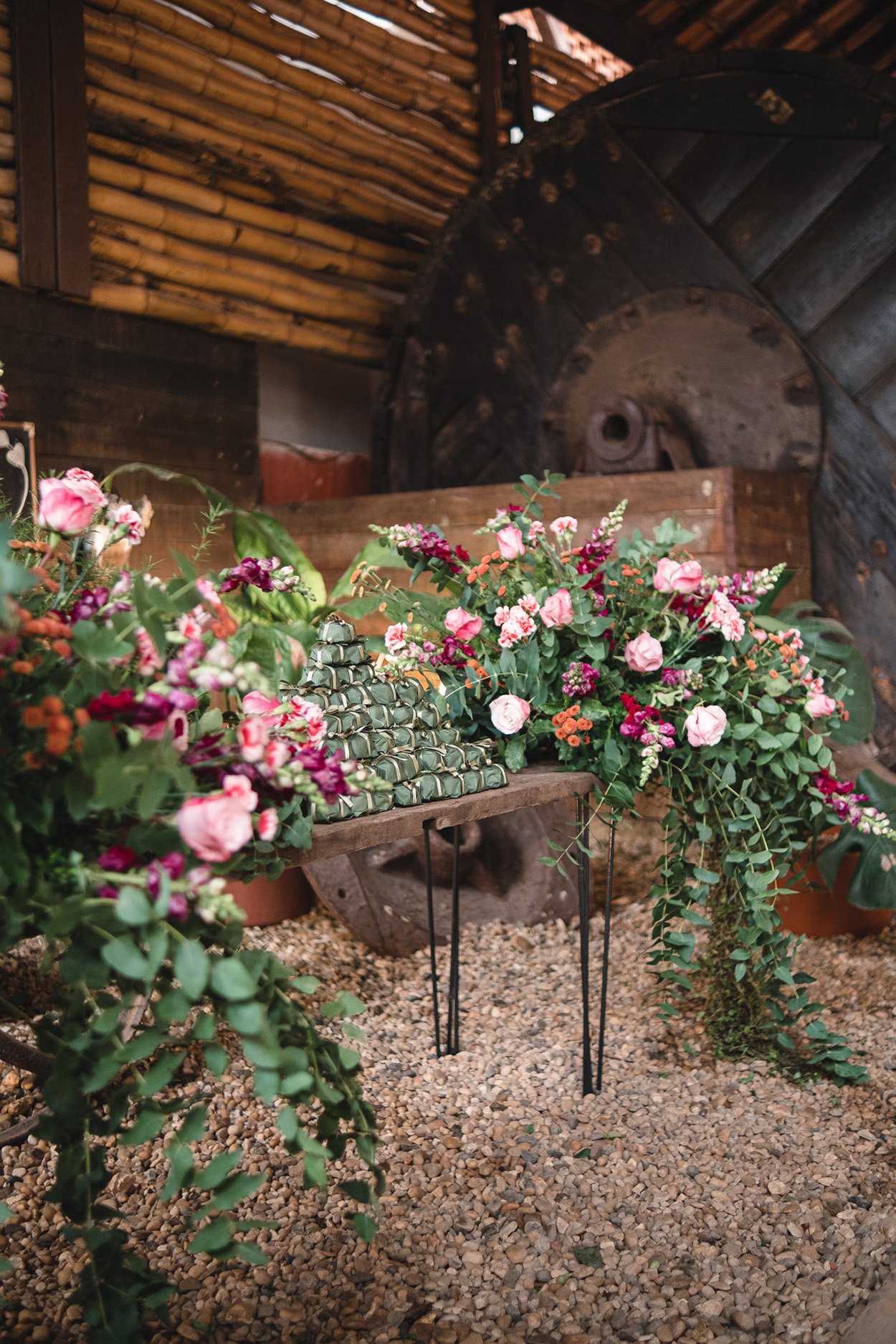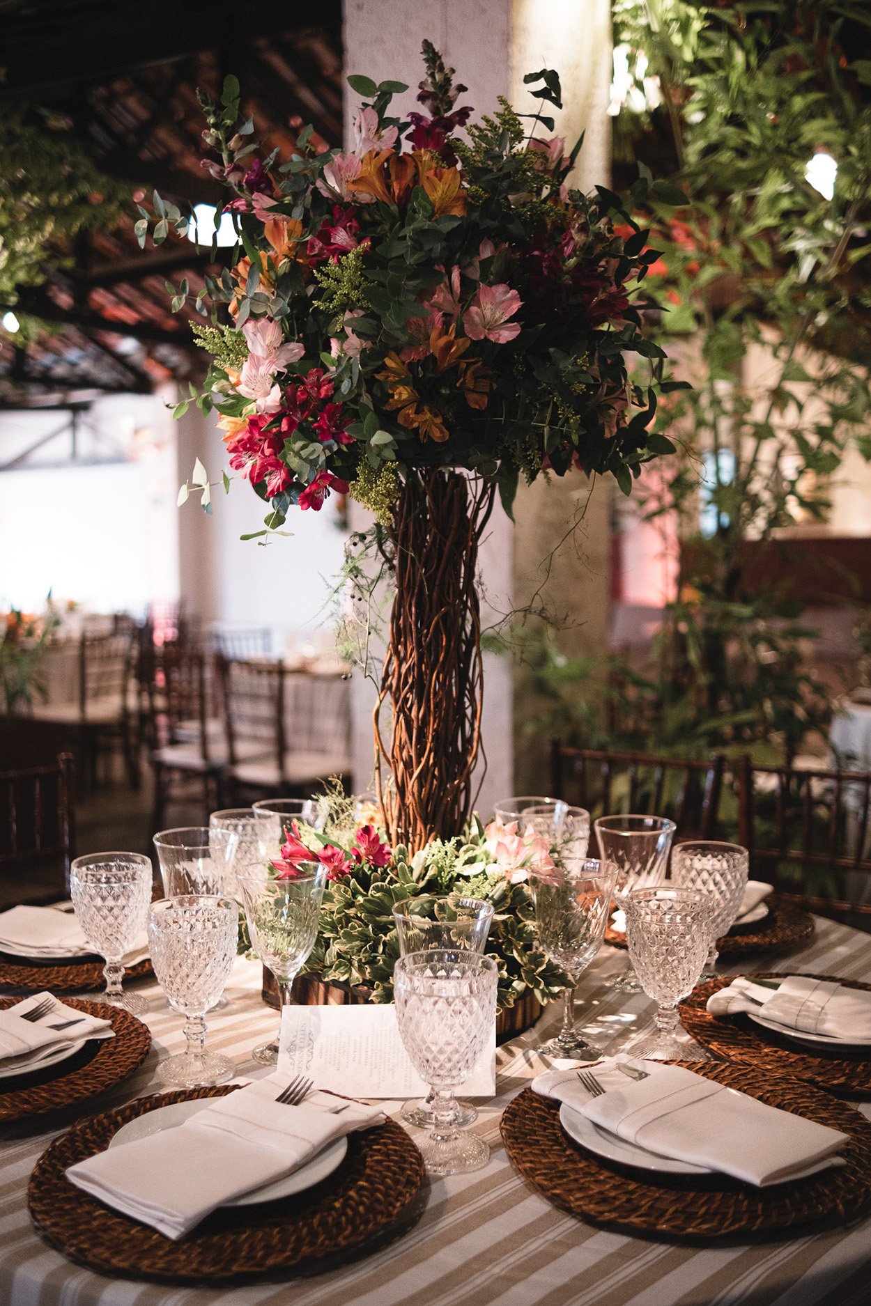 A decor abusou do greenery com arranjos que seguem os movimentos orgânicos das folhagens. E um detalhe fez toda a diferença: os pontos de cor.