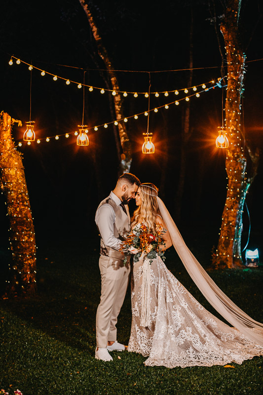 “Tivemos que fazer a cerimônia na parte coberta que diga-se de passagem é linda, mas aproveitamos o bosque todo decorado e arrasamos nas fotos ele estava realmente incrível”.
