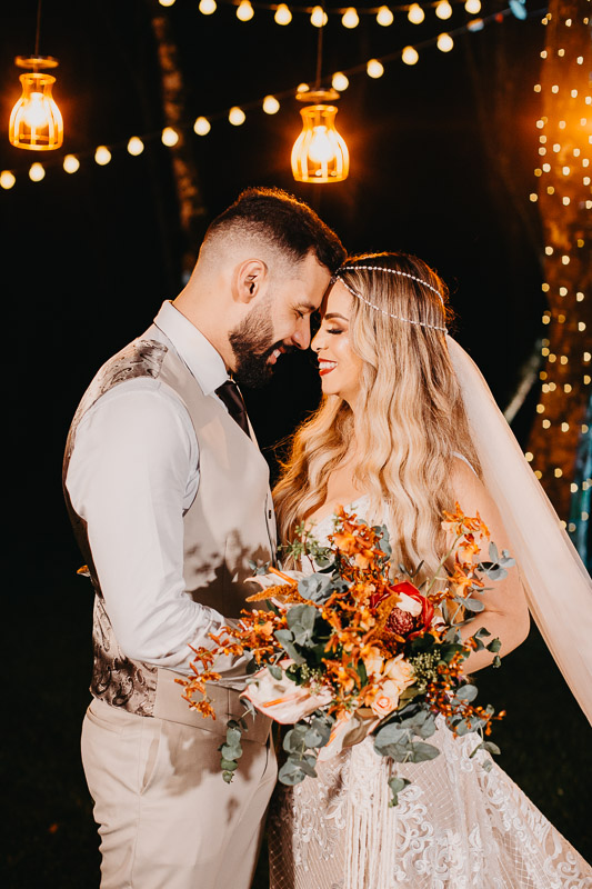 A decoração contou com uma vibe boho chic, com detalhes que amamos como cadeira pavão, macramê e, claro, as luzinhas no bosque. Tudo isso numa paleta de cores bem colorida e alegre com tons terra, muito verde e pêssego.