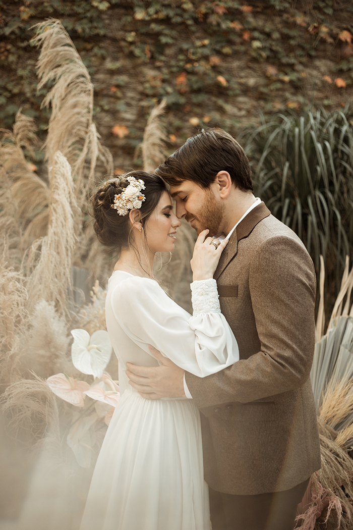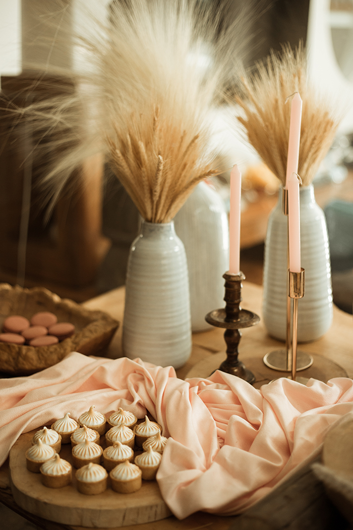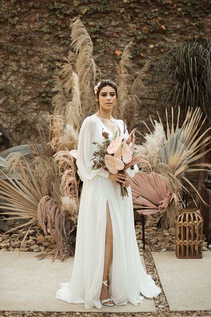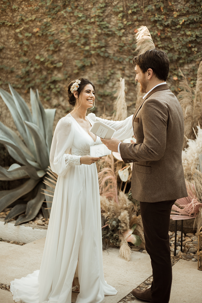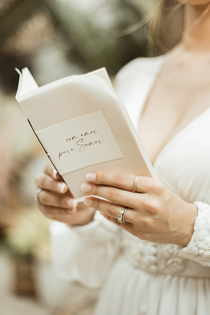 A decoração da Roberta Gouvea estava super alinhada com a papelaria do Estúdio Calla. Ambos foram pensados para serem elegantes e sustentáveis ao mesmo tempo. Seguiram uma linha de folhagens secas – no caso da decor – e uma paleta de cores de rosa empoeirado e tons de bege e nude.