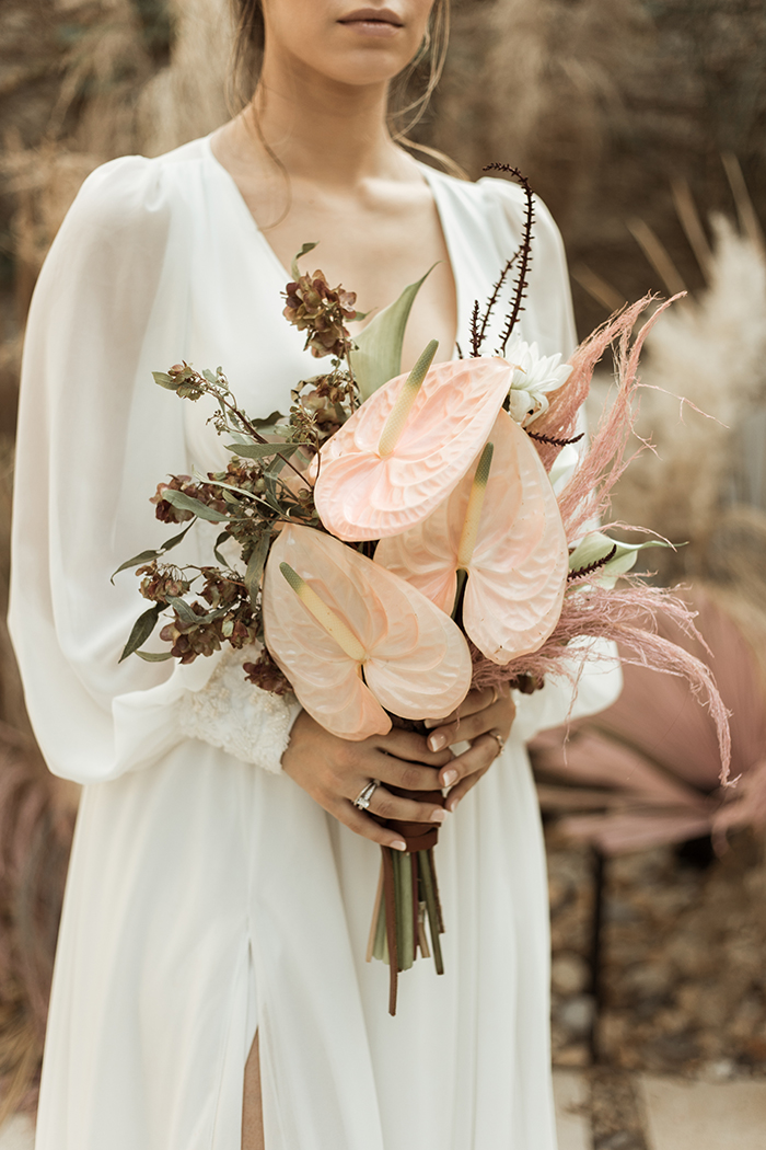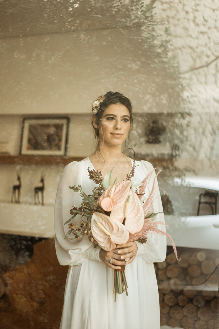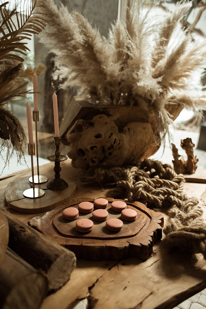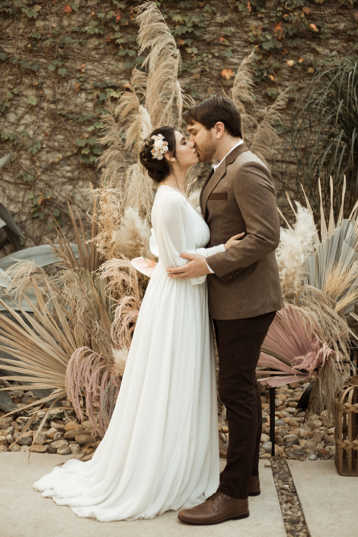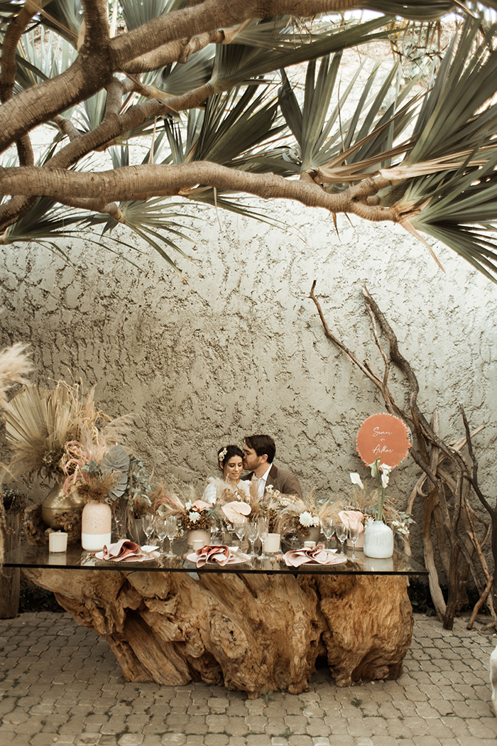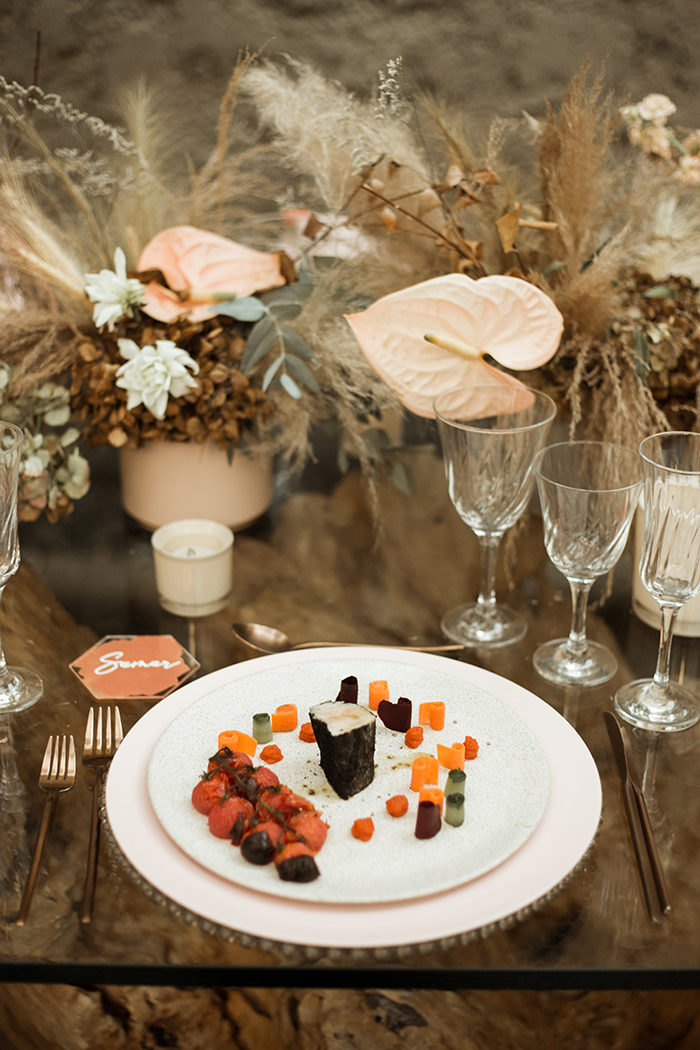 A decoração da Roberta Gouvea estava super alinhada com a papelaria do Estúdio Calla. Ambos foram pensados para serem elegantes e sustentáveis ao mesmo tempo. Seguiram uma linha de folhagens secas – no caso da decor – e uma paleta de cores de rosa empoeirado e tons de bege e nude.