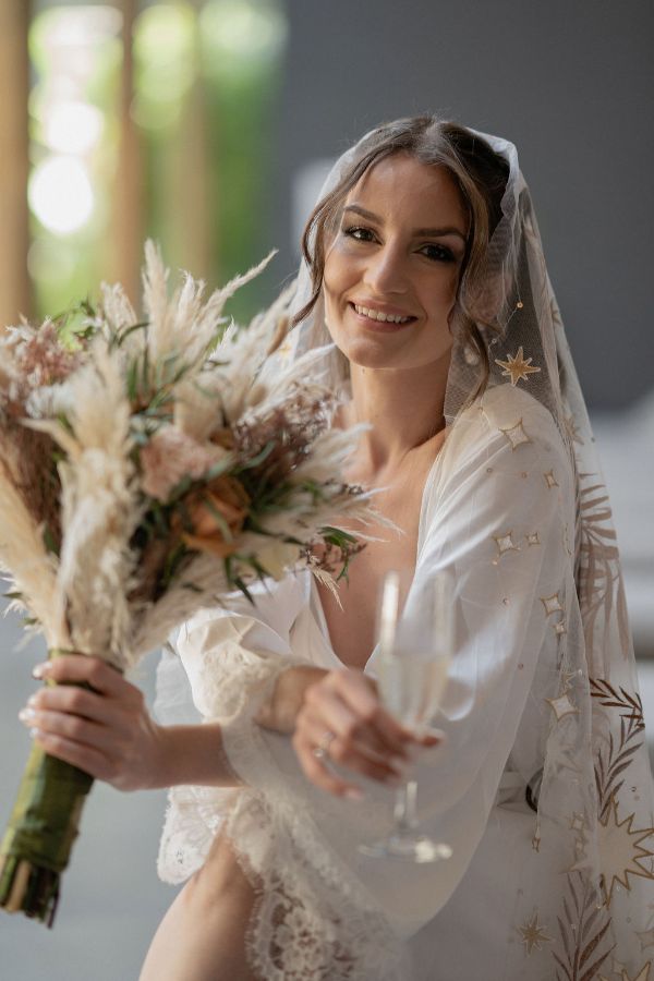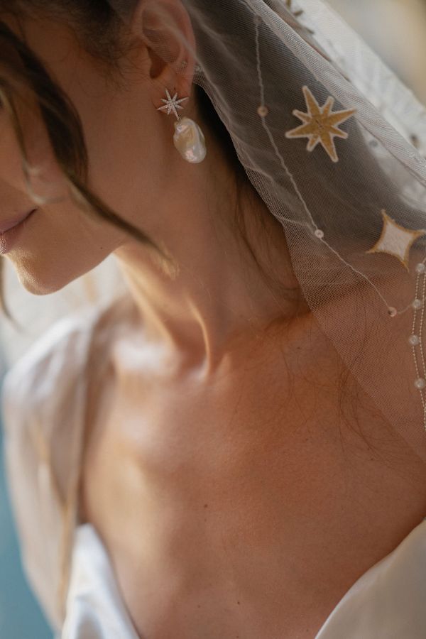 No casamento de Juliana, o véu bordado foi a peça-chave! Aliás, o buquê dela também foi pura inspiração com o relicário.
