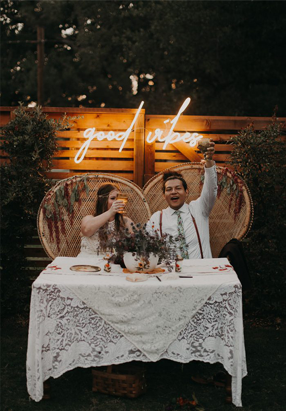 noivos sentados ao lado de decoração com letreiro iluminados