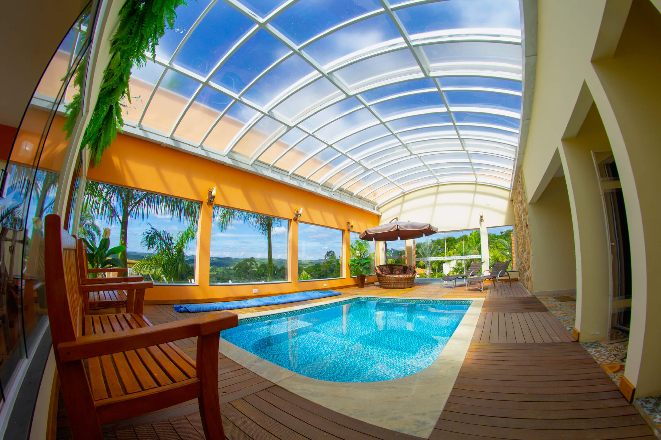 Sua estrutura metálica com cobertura transparente se harmoniza perfeitamente com a natureza ao redor, oferecendo uma iluminação natural indireta que garante fotografias espetaculares. Este cenário magnífico é ideal para casais que sonham com um casamento que une sofisticação e beleza natural.