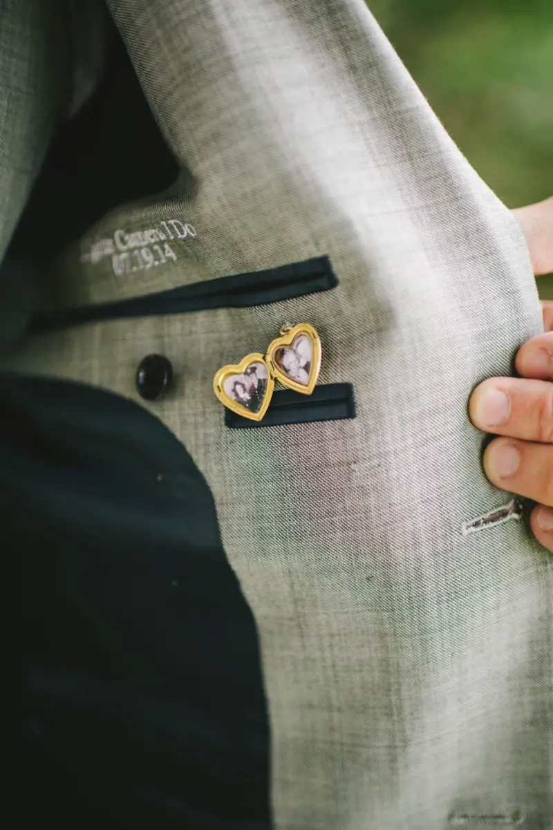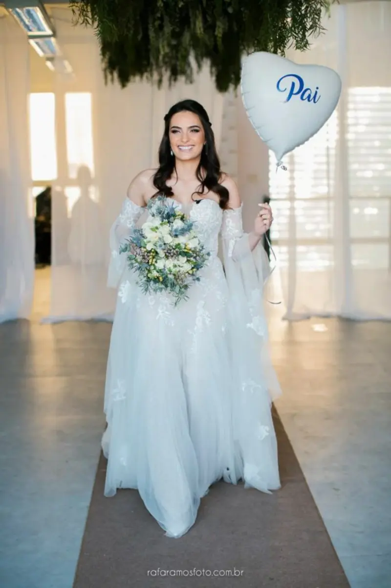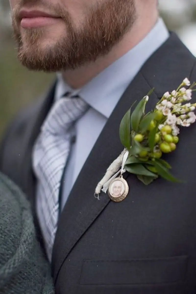 Entre eles pode ser a gravata ou um lenço que o pai costumava usar. Ainda podem ter um pin no bolso, a abotoadura favorita ou uma lapela do noivo com uma foto para honrar quem inspira os filhos.