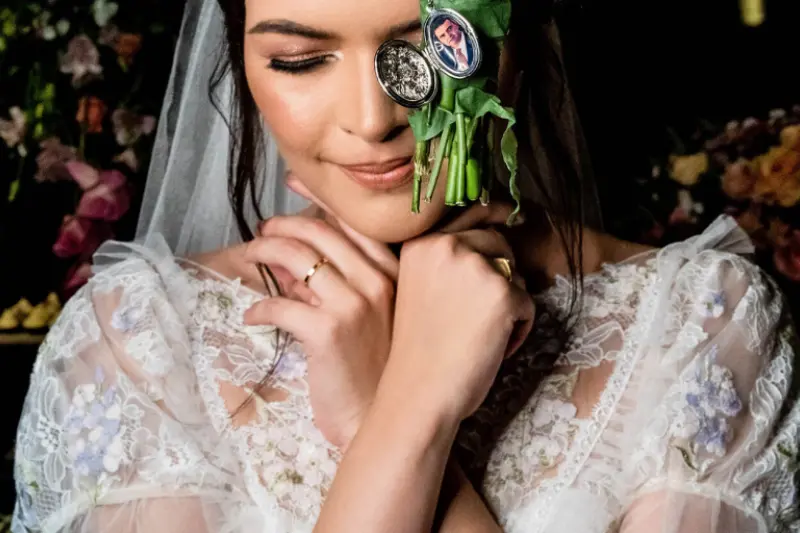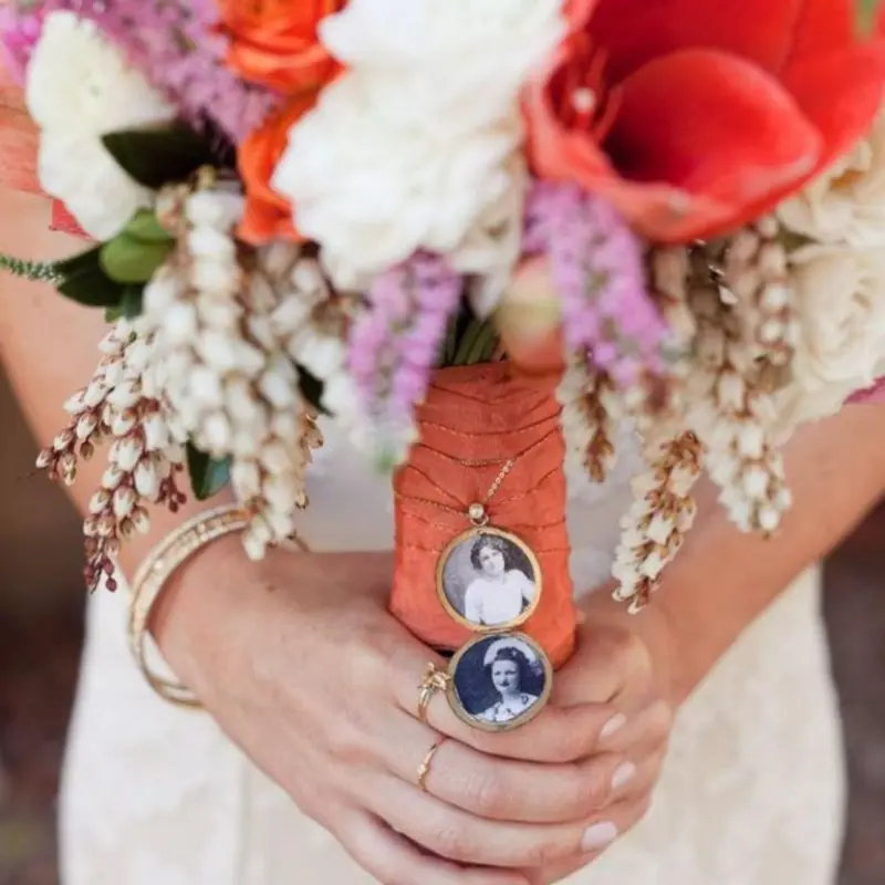 Outra maneira de homenagear um ente querido é o relicário no buquê com uma foto, sendo uma das formas mais delicadas de homenagem póstuma no casamento. Dessa forma, uma foto de alguém tão especial no buquê de noiva, pode ser a maior expressão de afeto e manter pertinho nesse dia único.