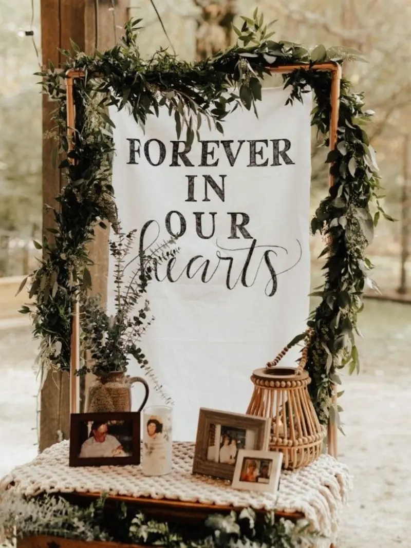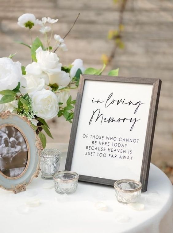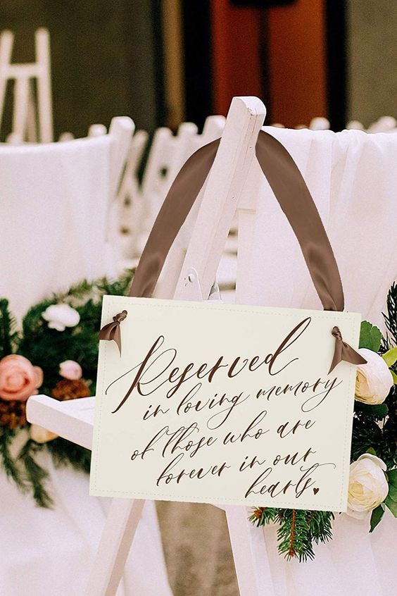 Uma linda maneira de homenagear no casamento é deixar um lugar reservado para a pessoa. Para sinalizar, pode ser colocada uma foto ou arranjo de flores, simbolizando a presença dela nesse dia único.