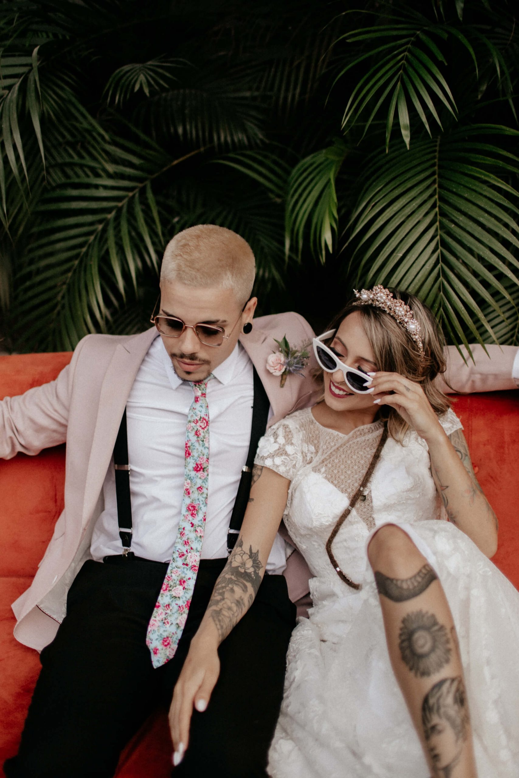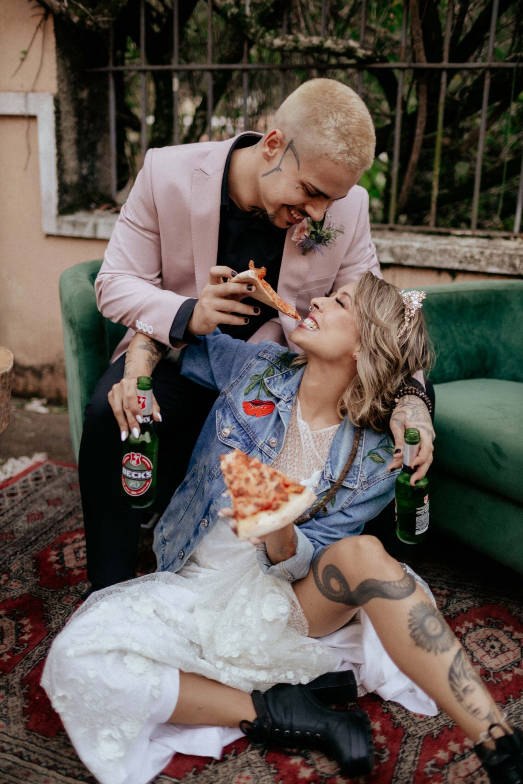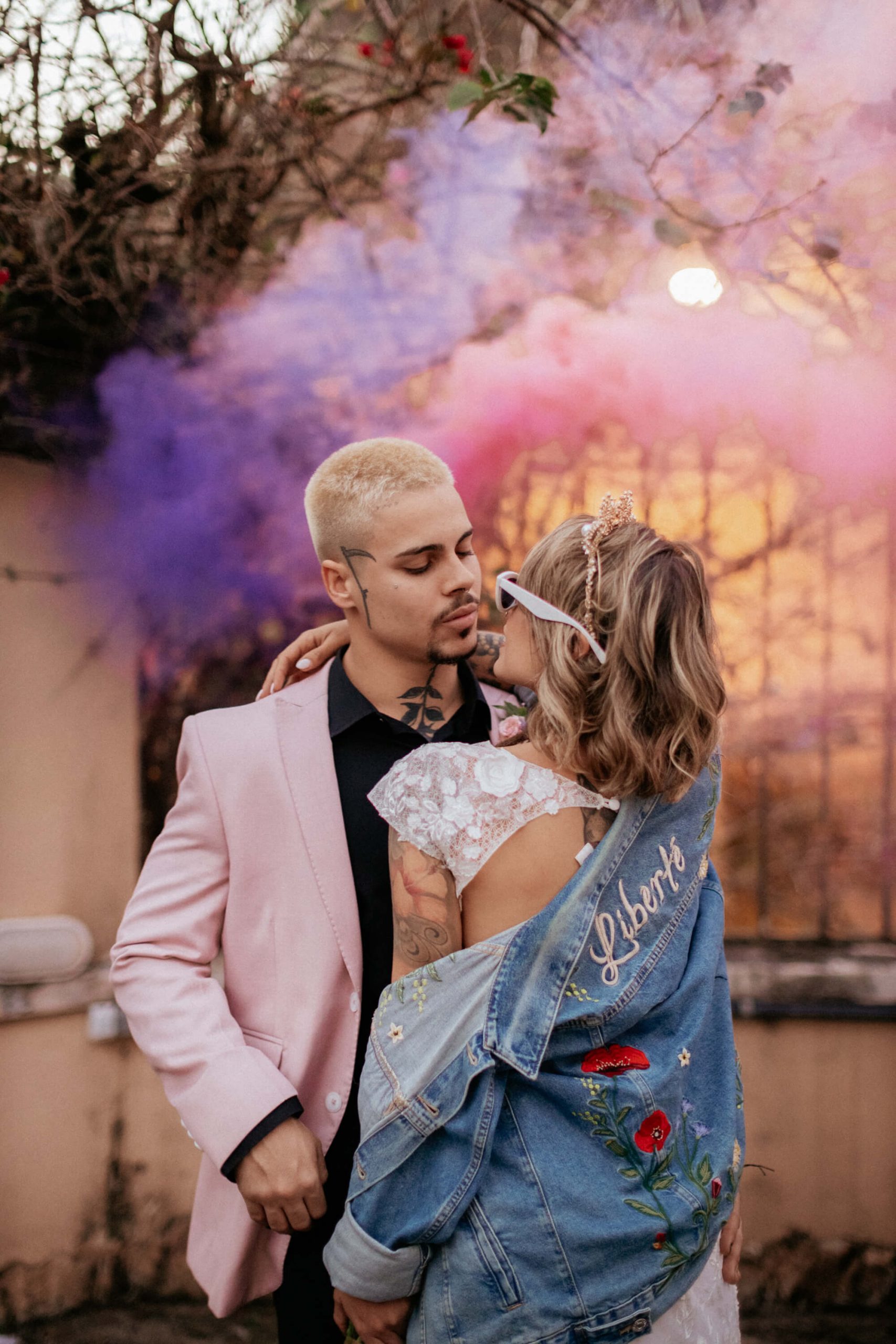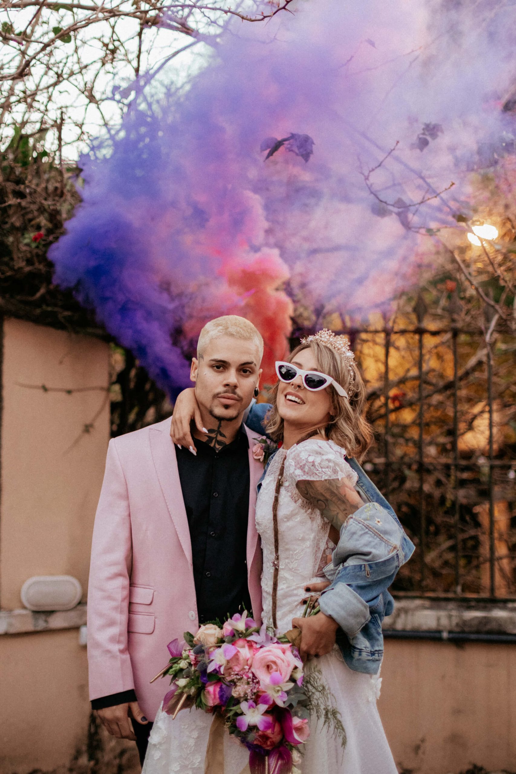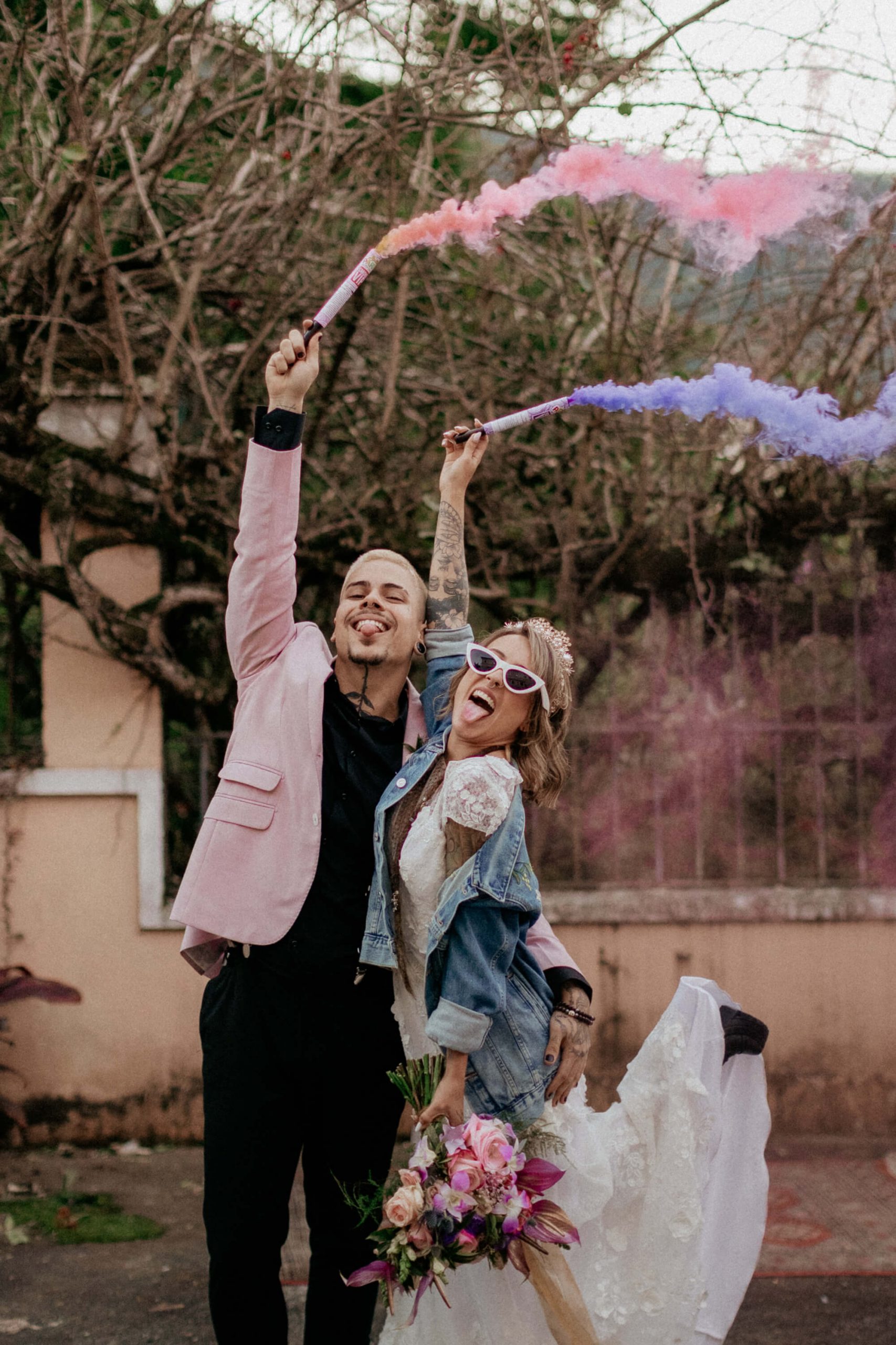 A ideia foi sair da caixinha e deixar mais ainda em evidencia o estilo dos noivos como pessoas. Usaram um terno rosa para o noivo, jaqueta jeans para a noiva, óculos escuro, tatuagens – tudo pensado para o melhor estilo de casamento alternativo sem medo de ser diferente.