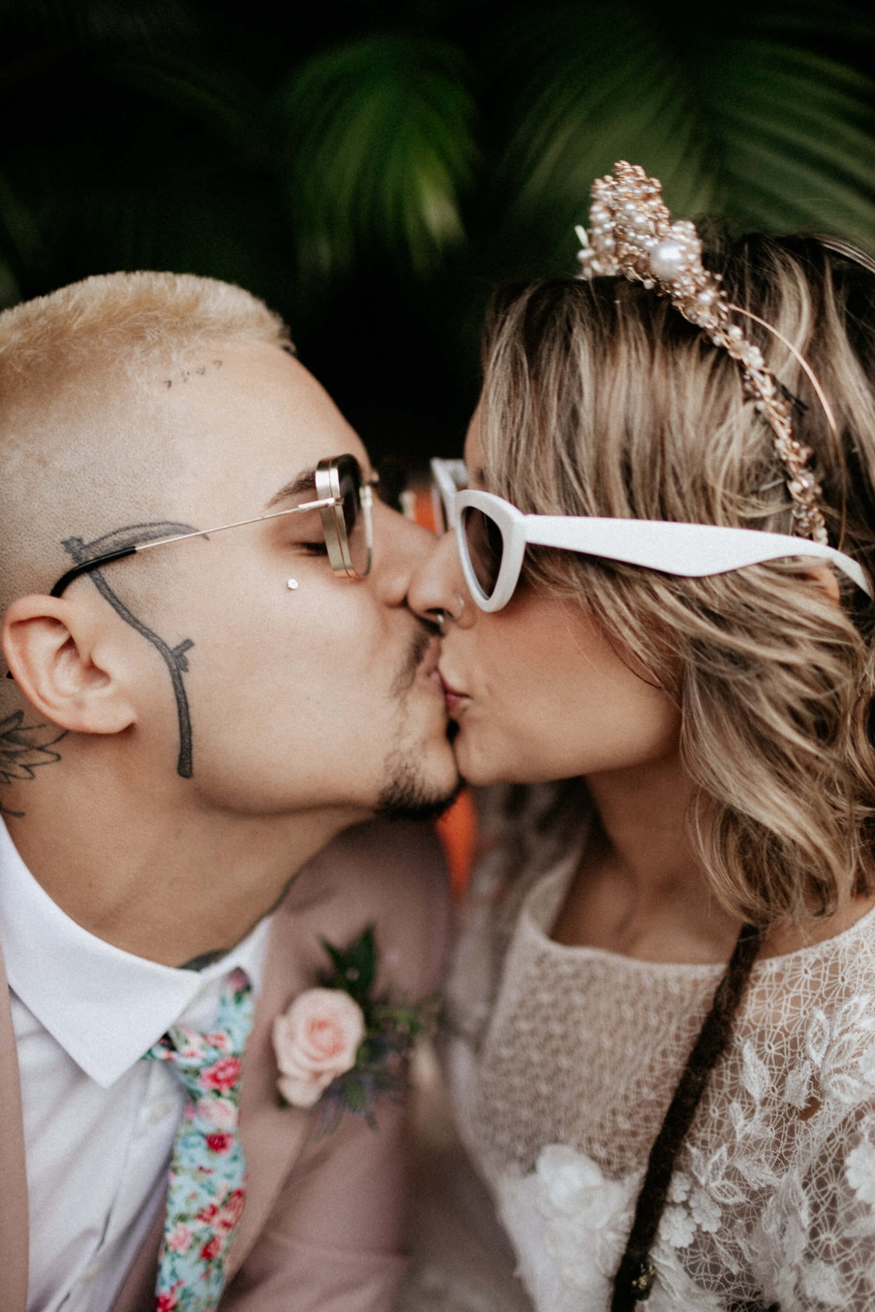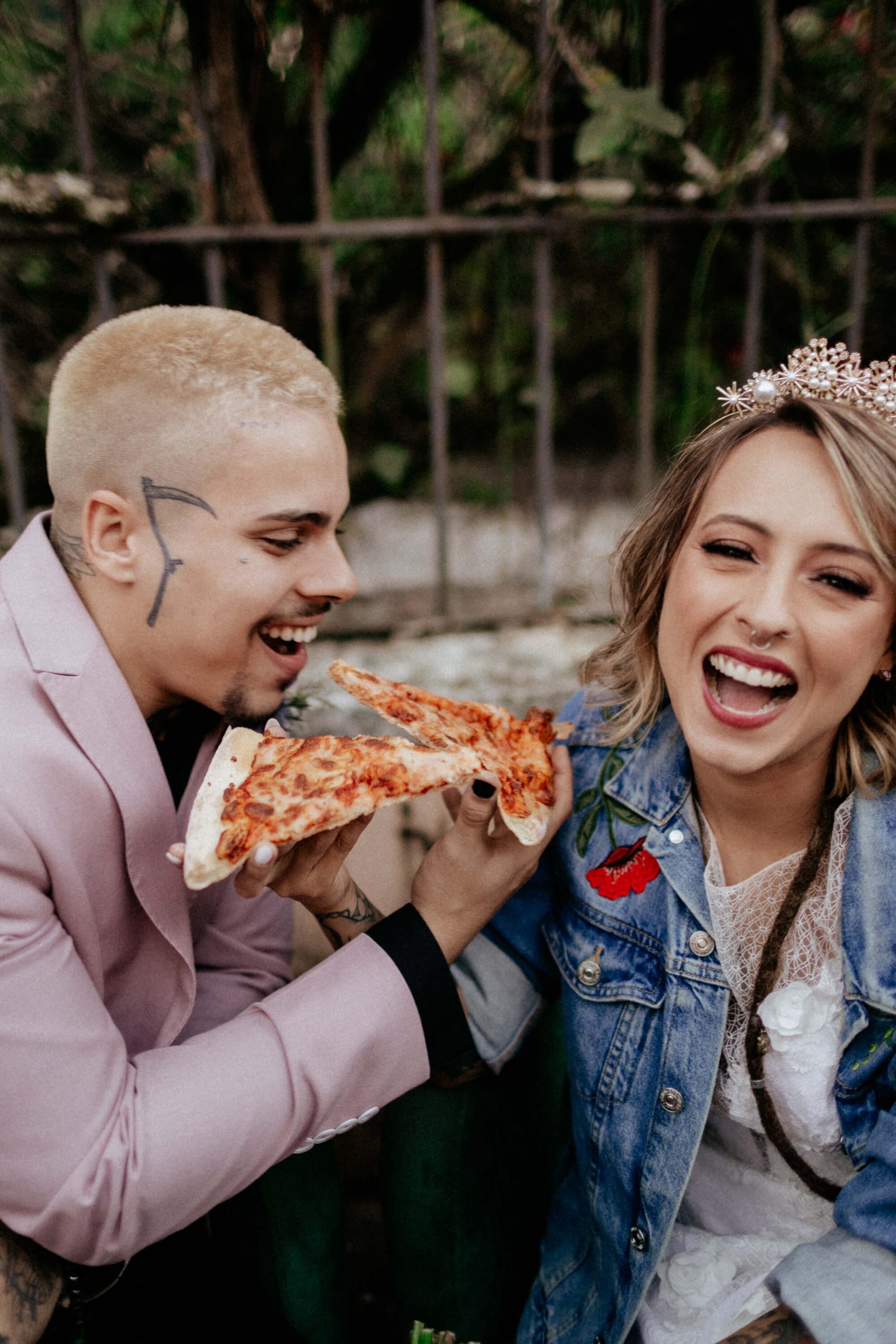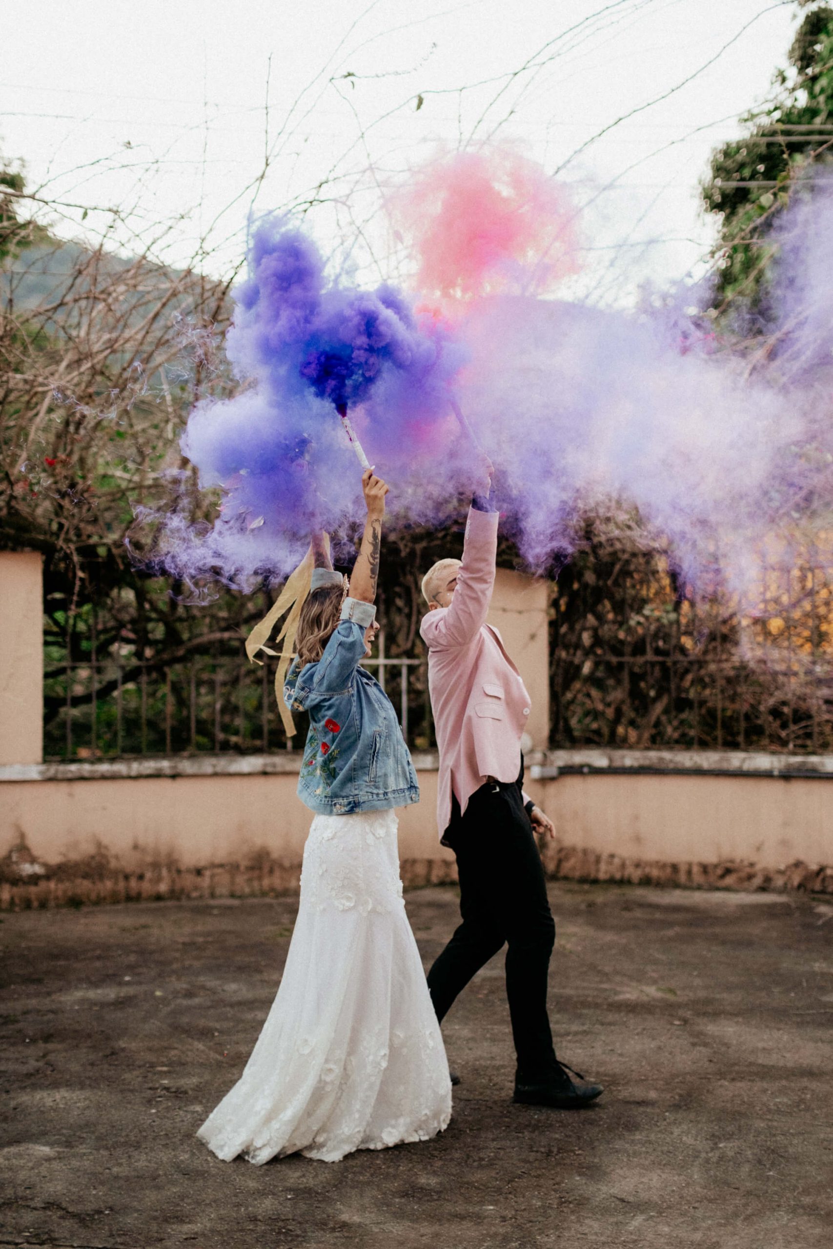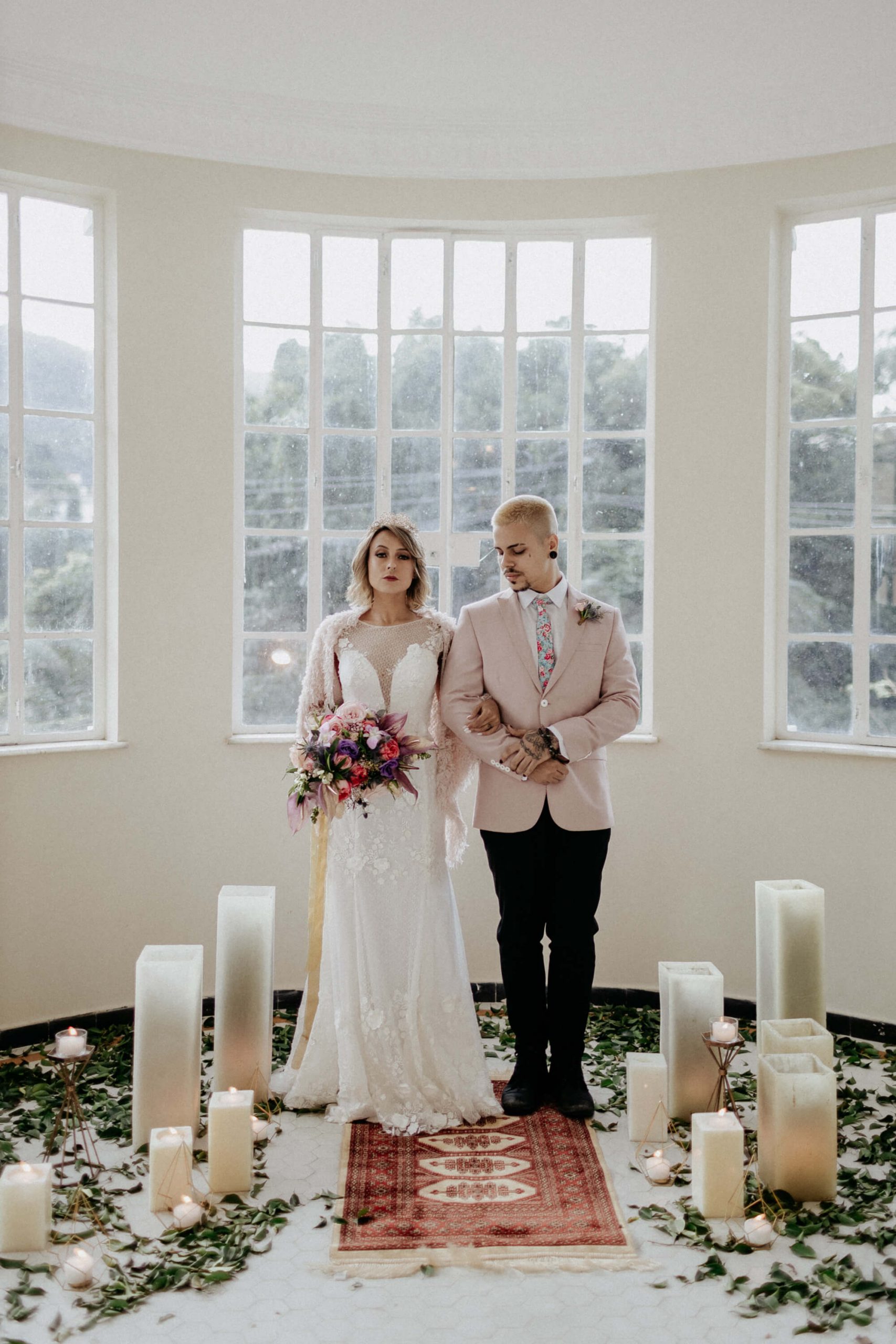 A ideia foi sair da caixinha e deixar mais ainda em evidencia o estilo dos noivos como pessoas. Usaram um terno rosa para o noivo, jaqueta jeans para a noiva, óculos escuro, tatuagens – tudo pensado para o melhor estilo de casamento alternativo sem medo de ser diferente.