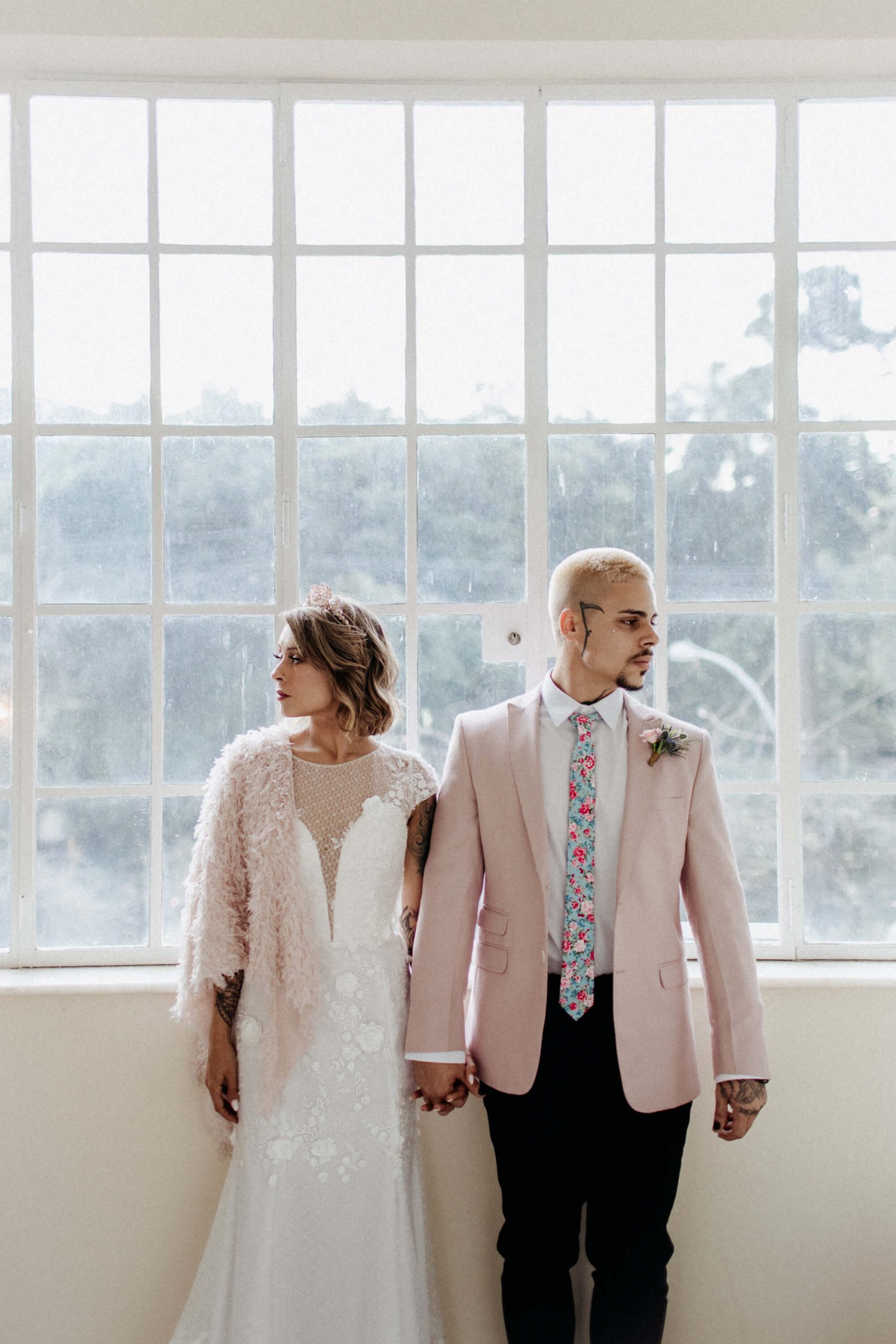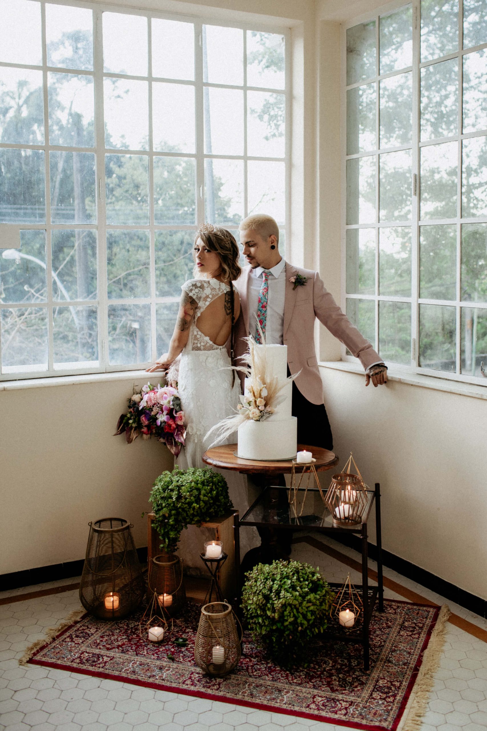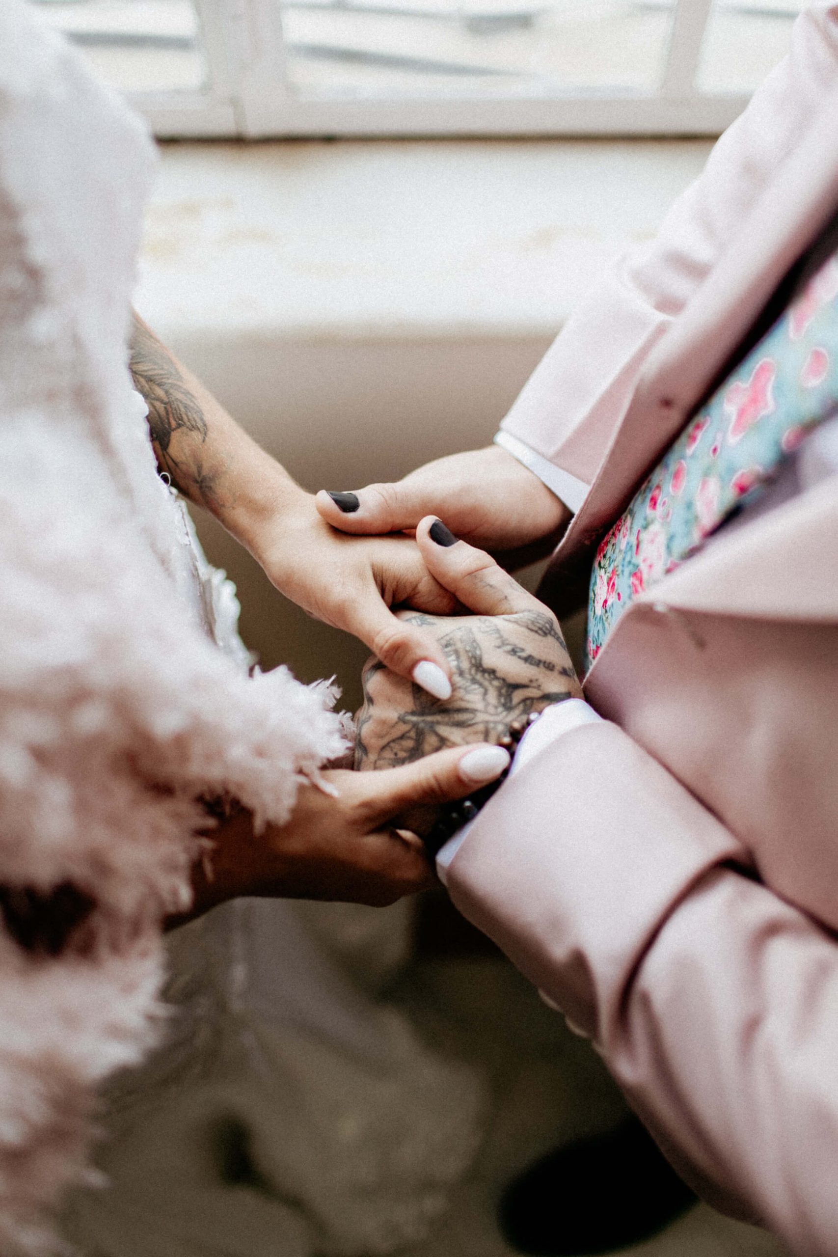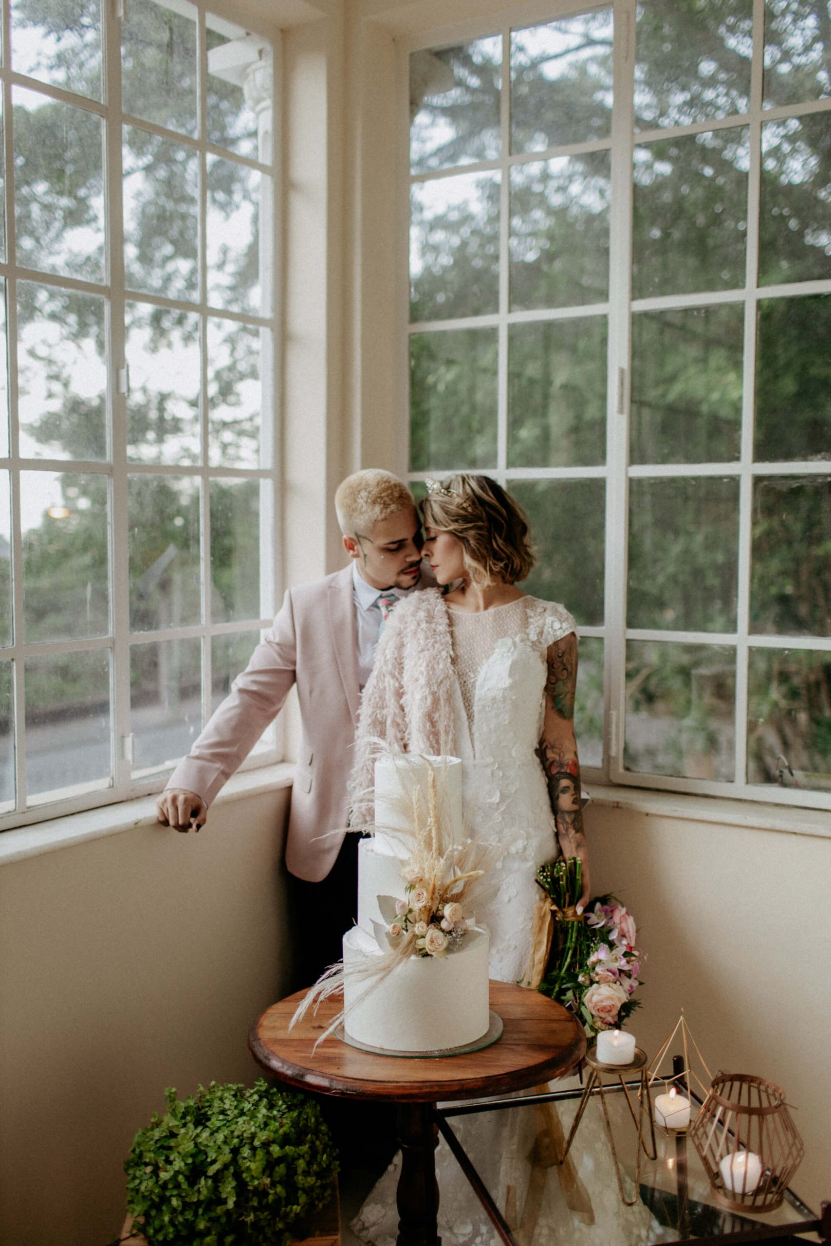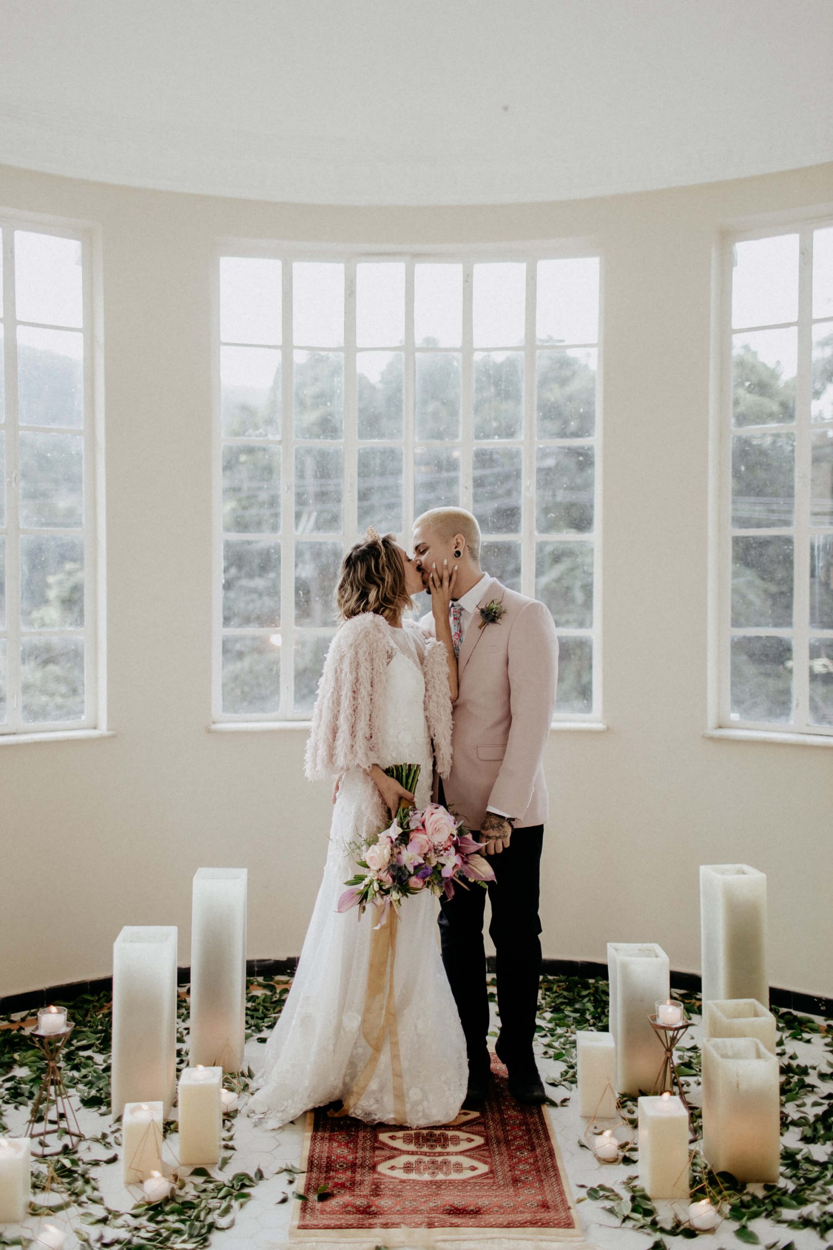 A ideia foi sair da caixinha e deixar mais ainda em evidencia o estilo dos noivos como pessoas. Usaram um terno rosa para o noivo, jaqueta jeans para a noiva, óculos escuro, tatuagens – tudo pensado para o melhor estilo de casamento alternativo sem medo de ser diferente.