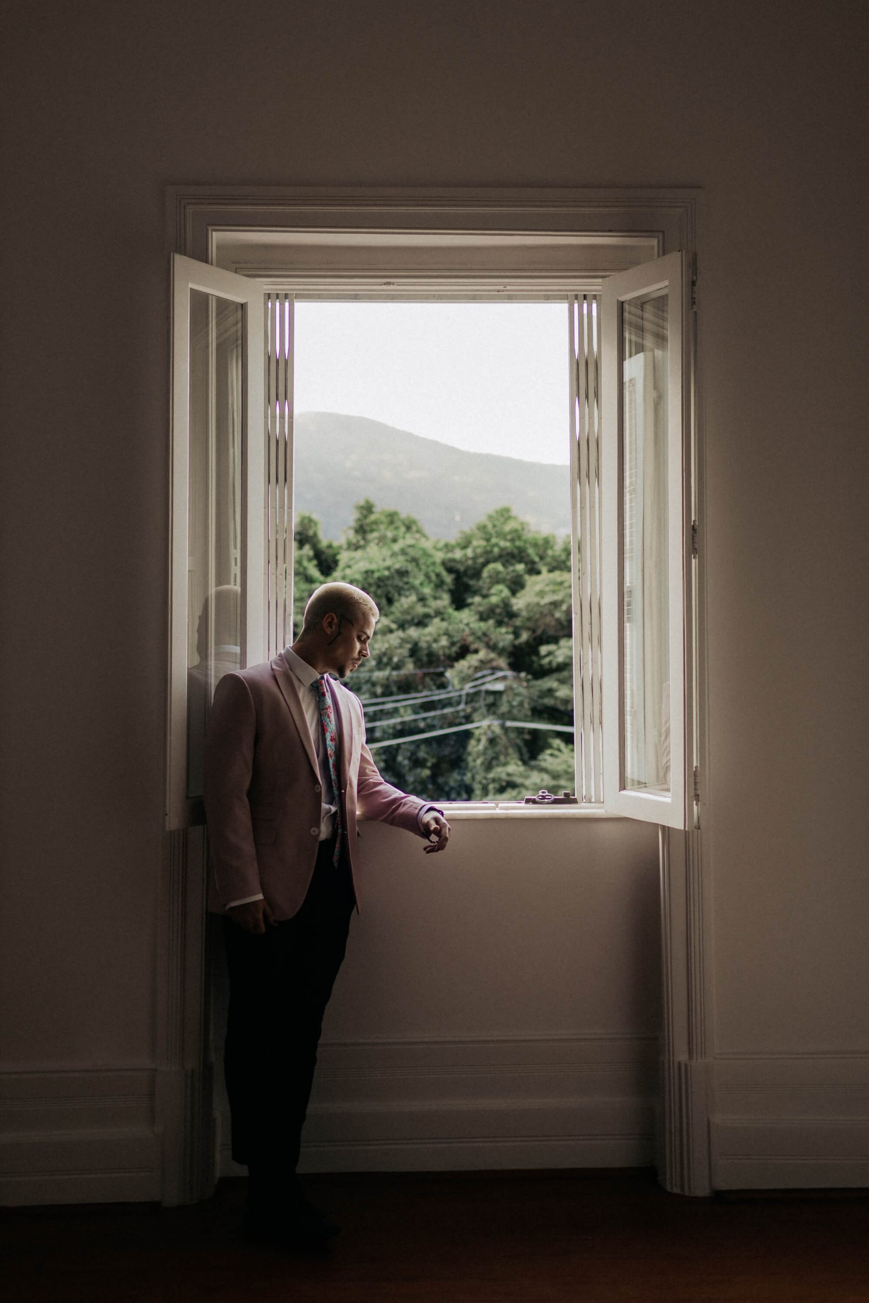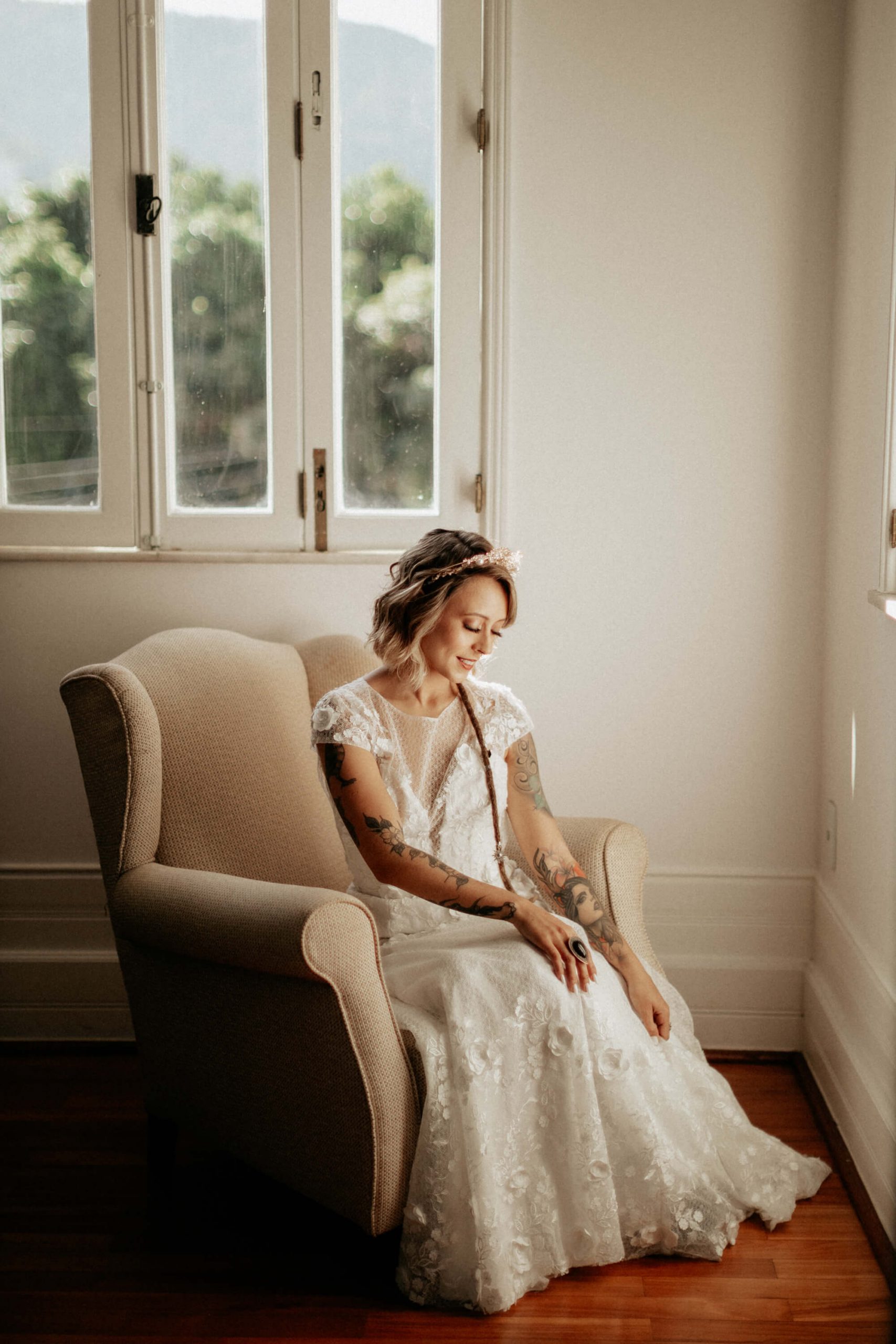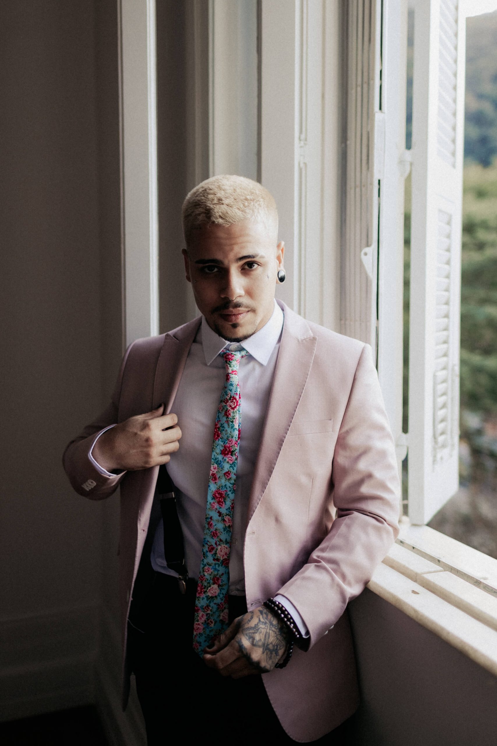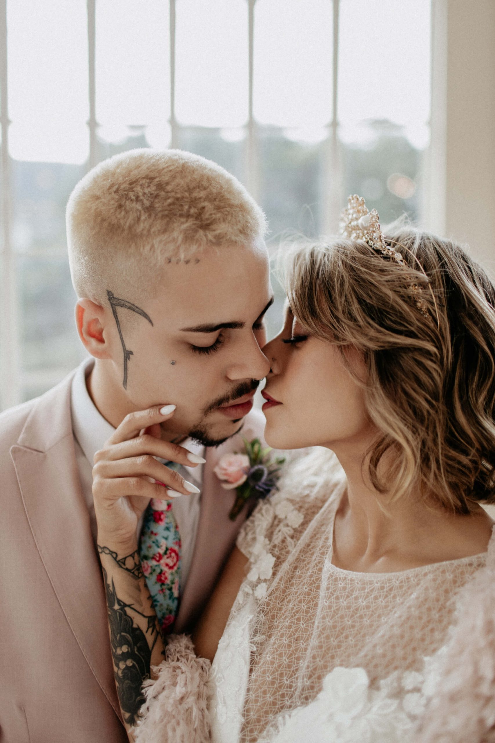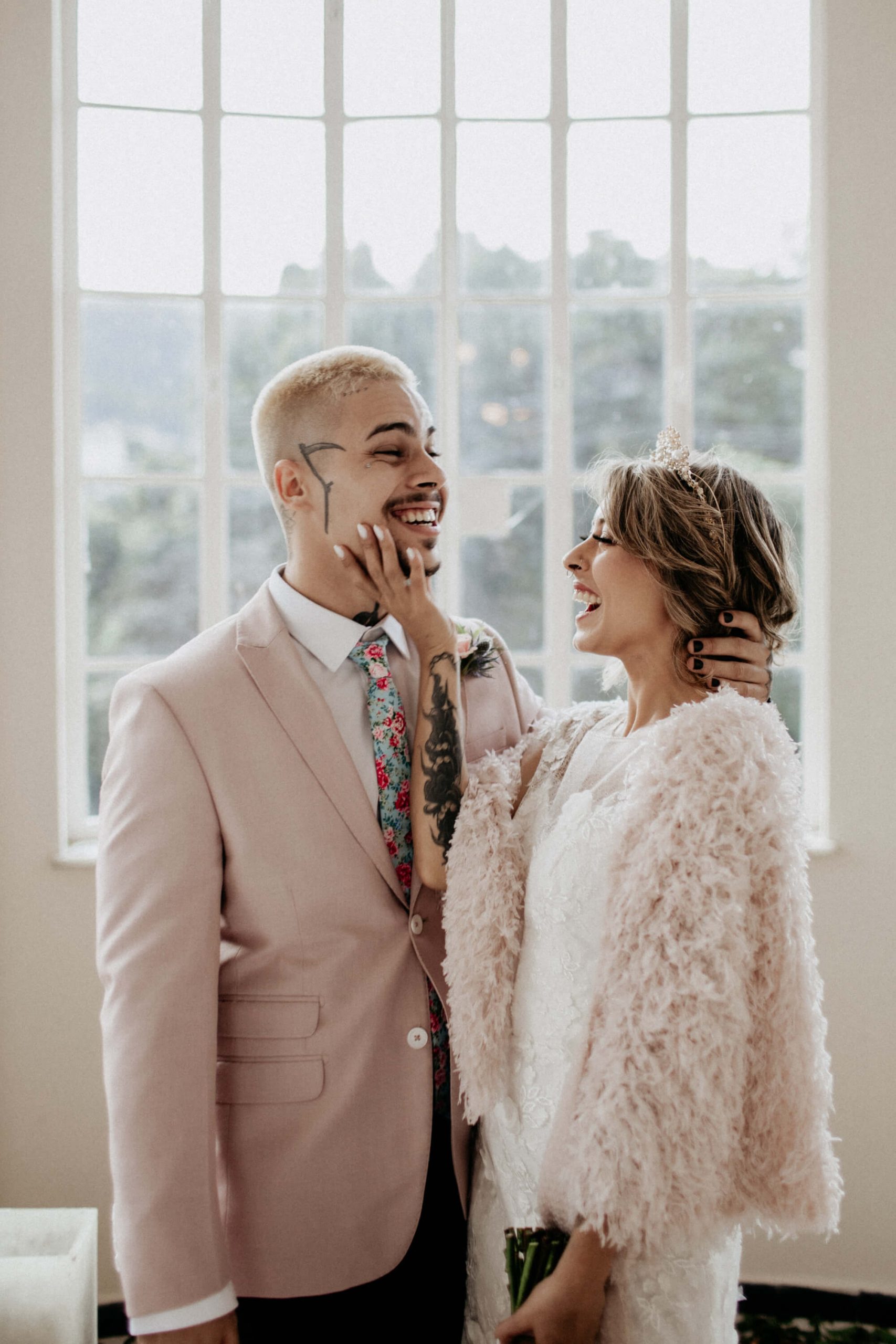A ideia foi sair da caixinha e deixar mais ainda em evidencia o estilo dos noivos como pessoas. Usaram um terno rosa para o noivo, jaqueta jeans para a noiva, óculos escuro, tatuagens – tudo pensado para o melhor estilo de casamento alternativo sem medo de ser diferente.