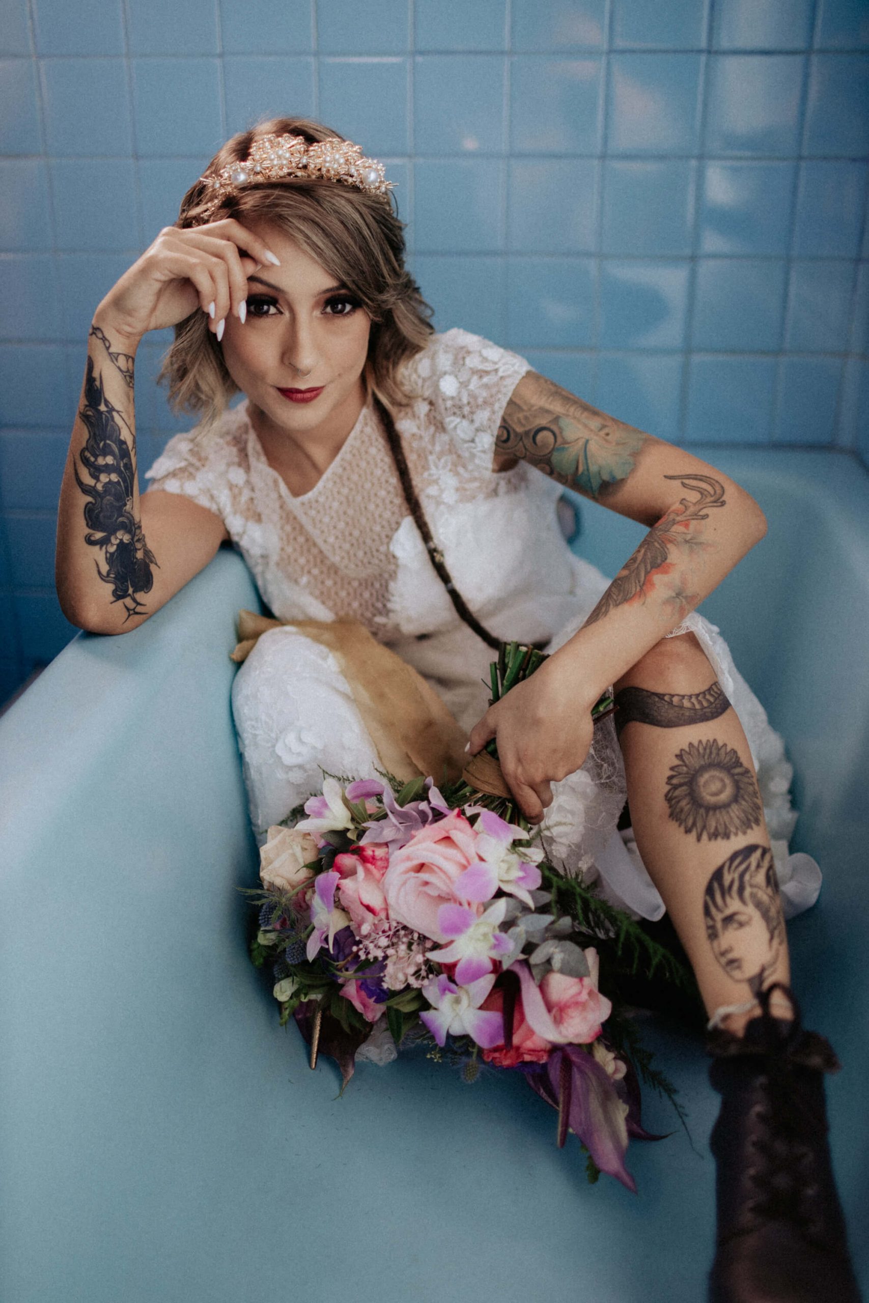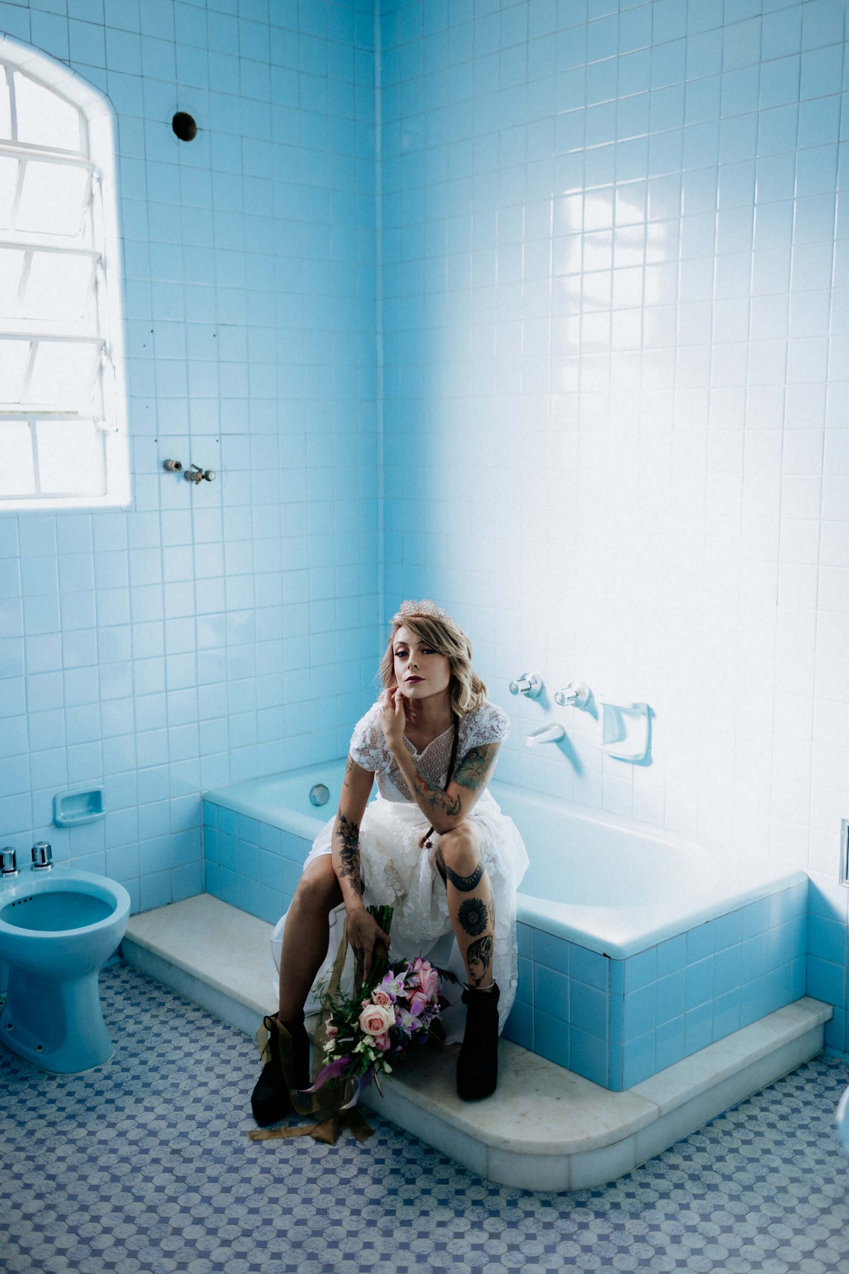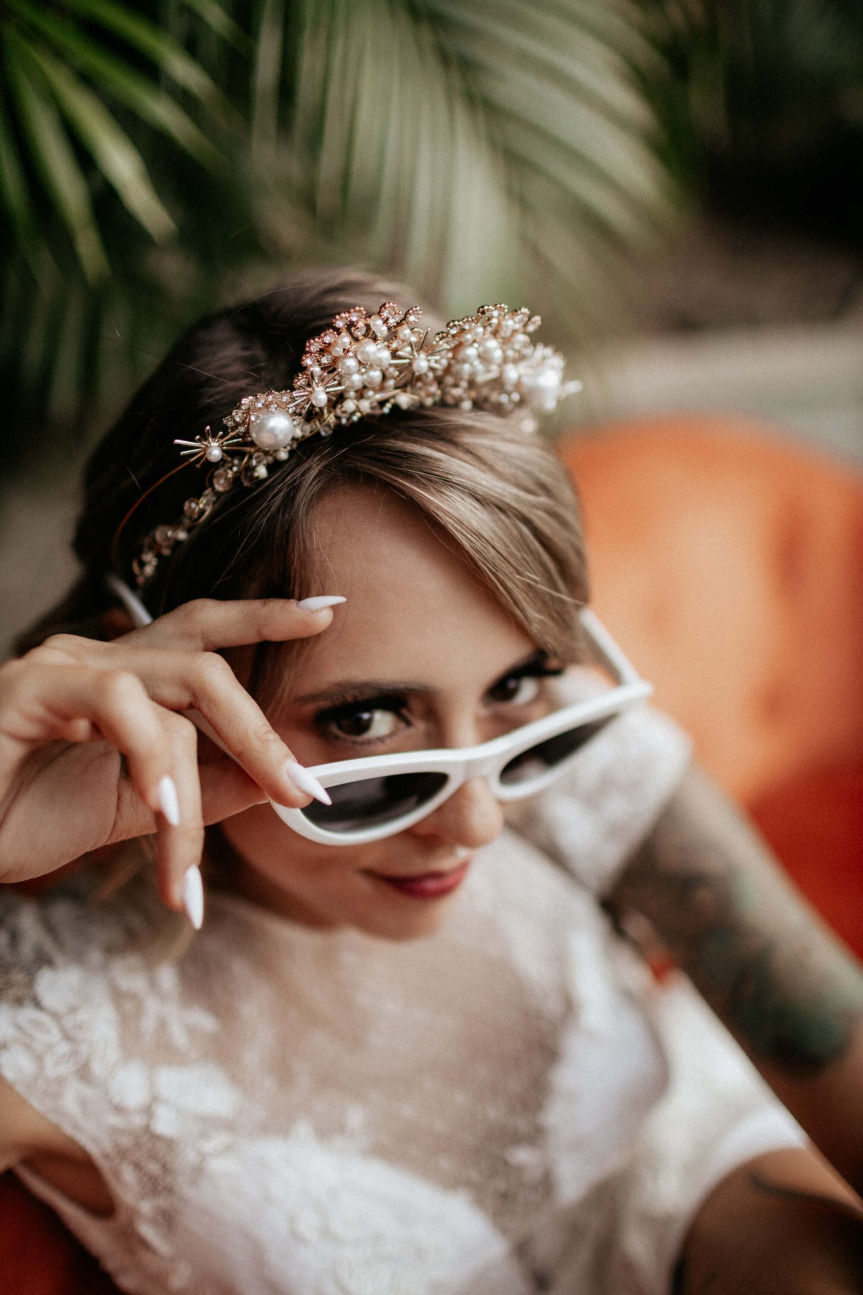 Nós adoramos a noiva (e o noivo) de óculos escuros, botas e uma tiara de pérolas delicada e brincos da Nat co. Bride, que criou um contraste no look da noiva super bacana.