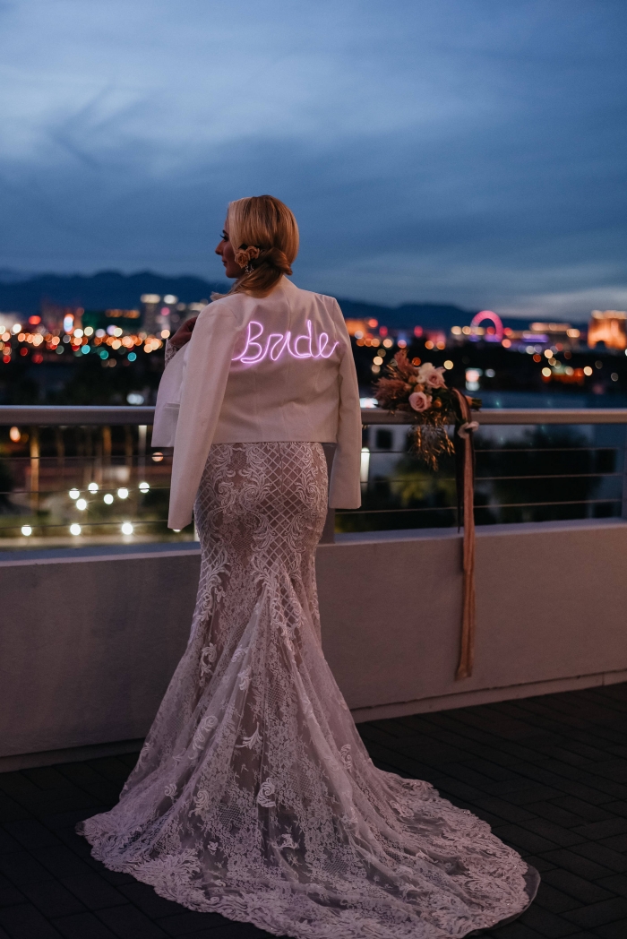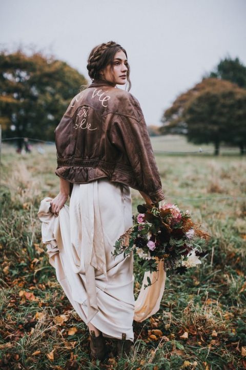 Para criar um contraste interessante, as jaquetas combinam perfeitamente com vestidos de noiva que possuem saias fluídas e volumosas.