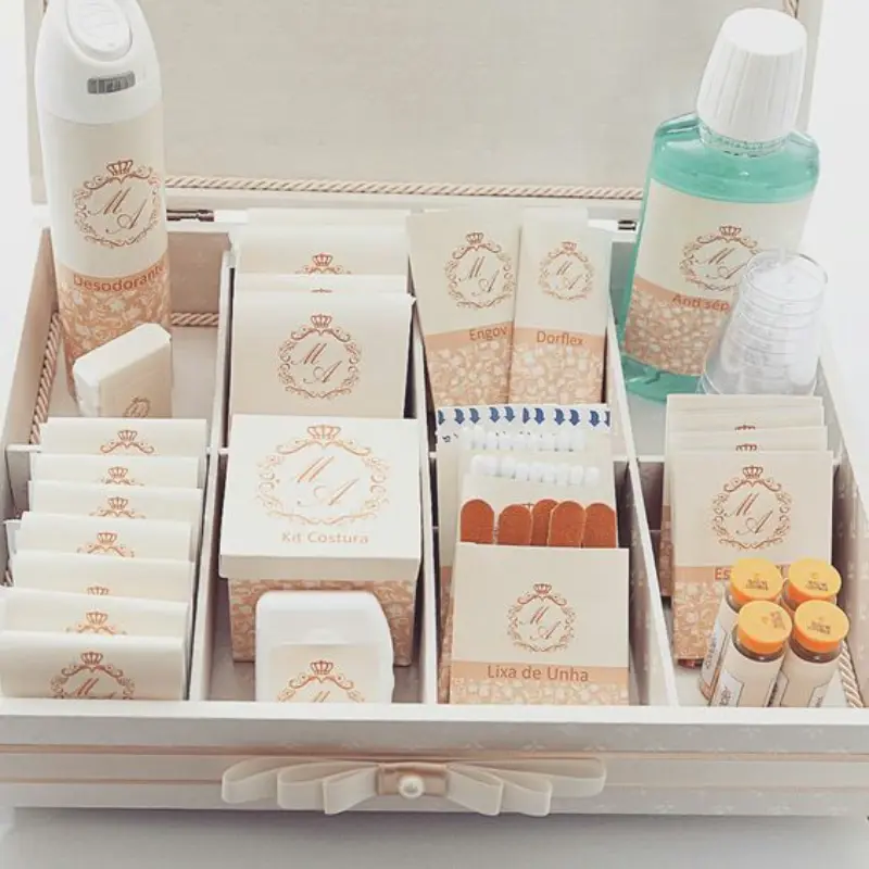 Kit toalete de casamento é sinônimo de gentileza, carinho e cuidado. É um gracejo para receber os convidados na festa do casamento, pensando na solução de imprevistos, como um botão que cai, uma costura desfeita ou um machucado no pé.