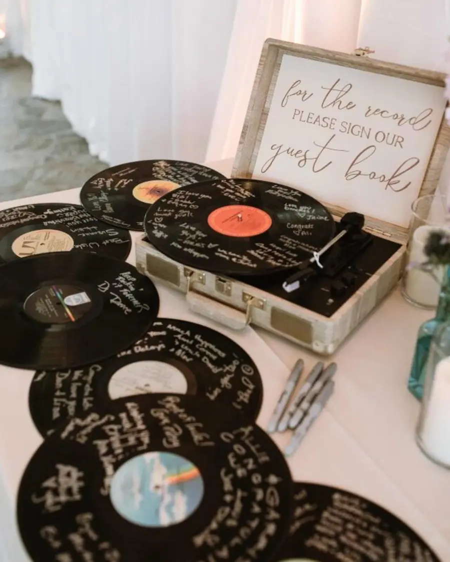 Outra opção vintage são os discos de vinil. Fazê-los como livro de assinatura é uma ideia criativa e que deixa um resultado bem bonito e autêntico.
