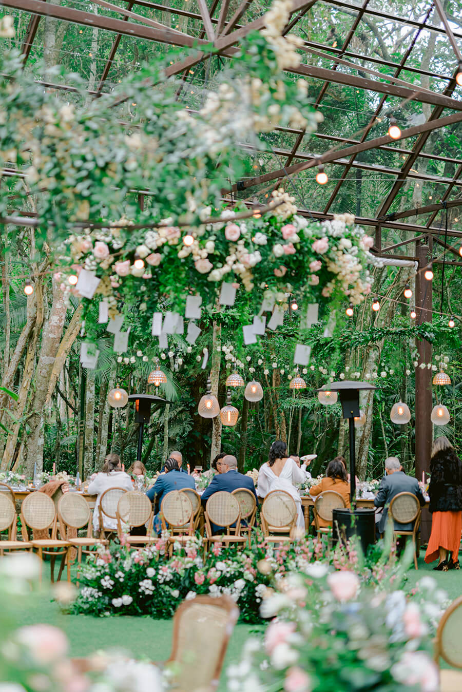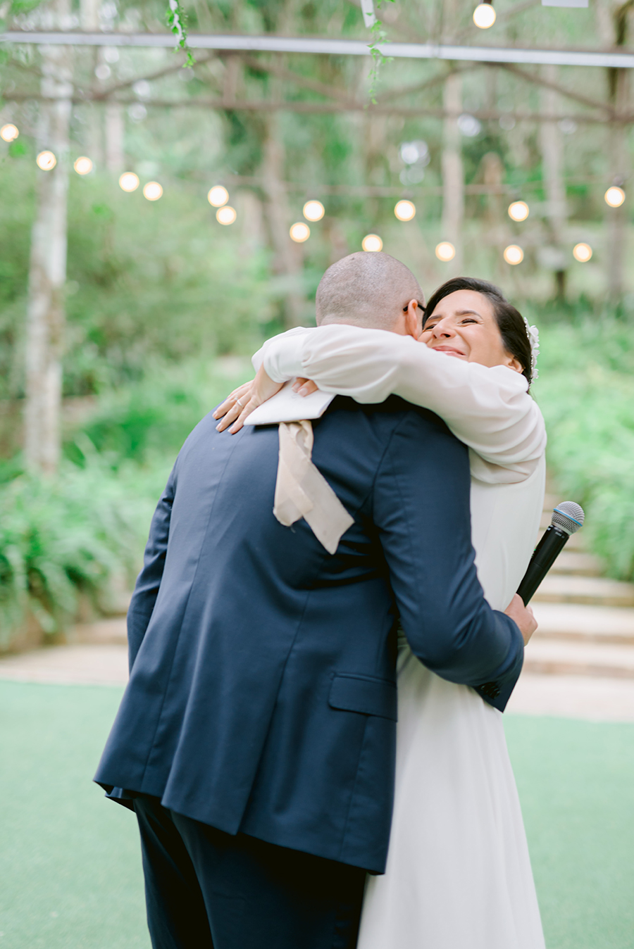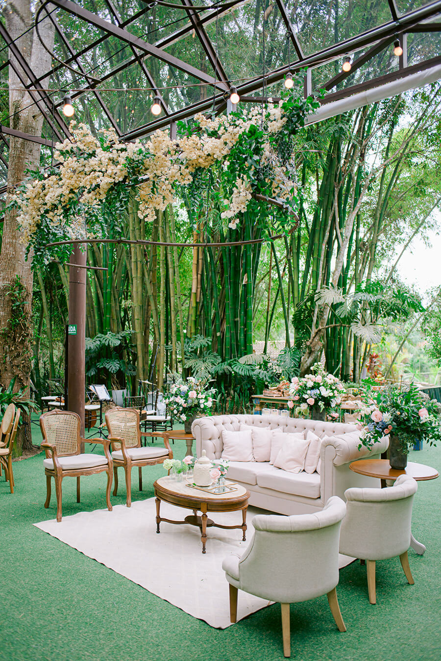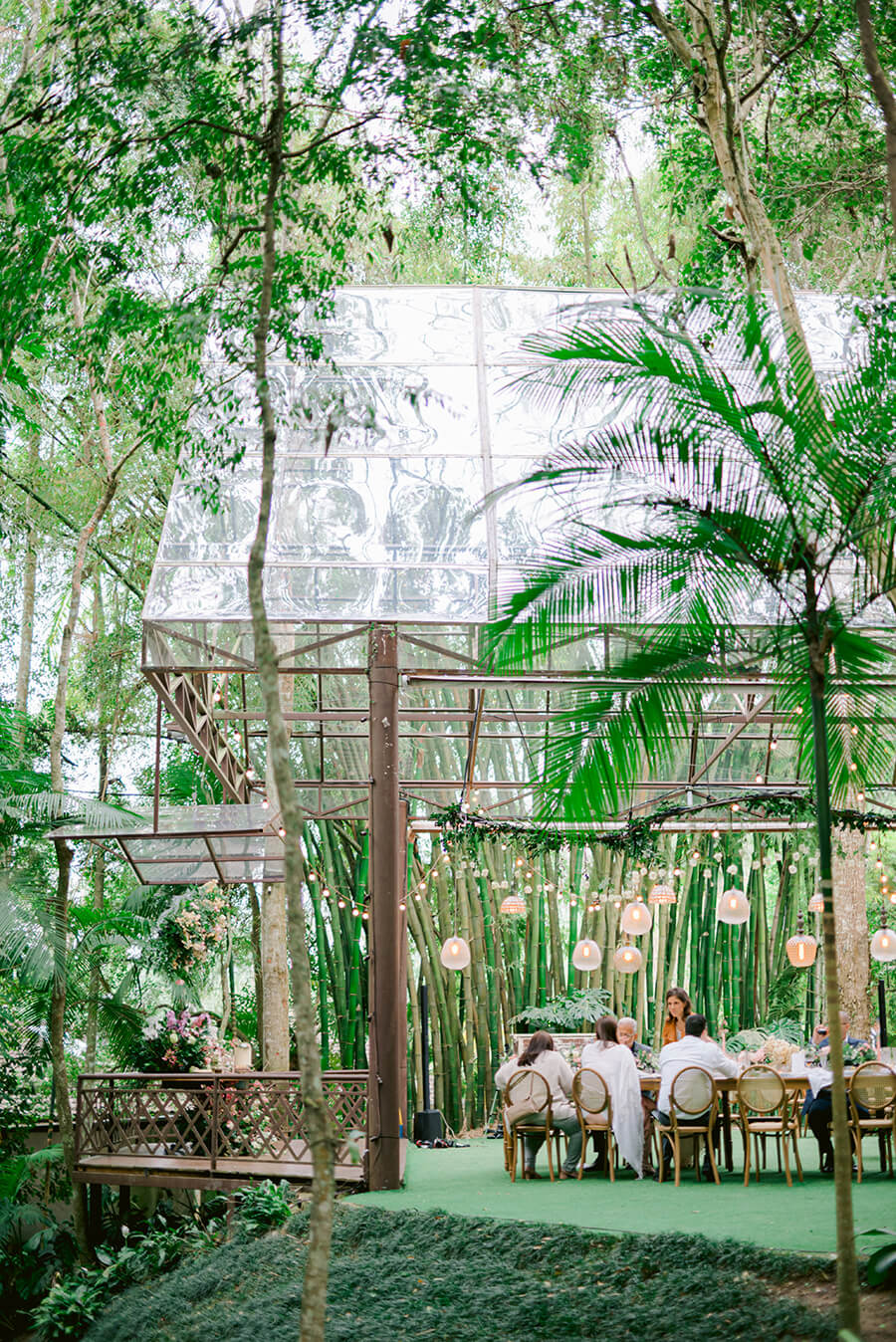 O local escolhido para a renovação de votos não poderia ser outro se não a Casa Giardino, que além de ser rodeada por muita vegetação tem um clima super mágico que parece que abraça a cada visita. Tanto a cerimônia quanto a recepção aconteceram na belíssima capela de vidro do espaço, que é 100% integrada com a natureza, proporciona muita luz natural e ainda cobertura em caso de chuva.