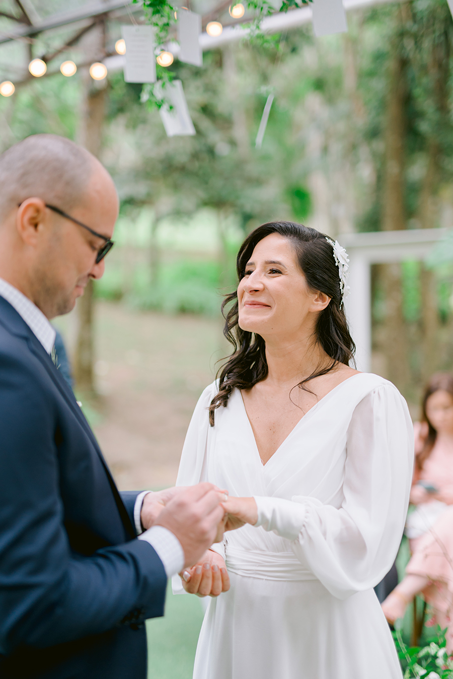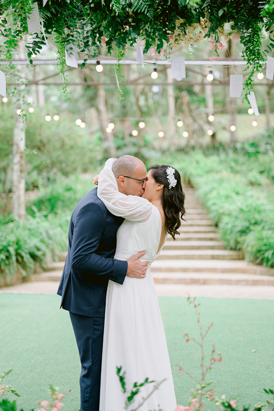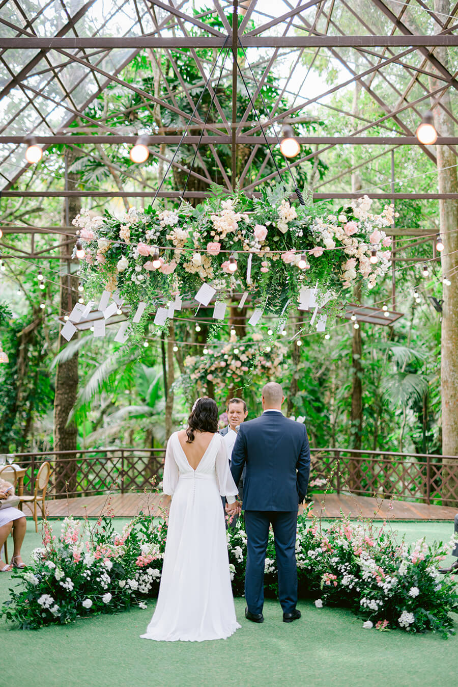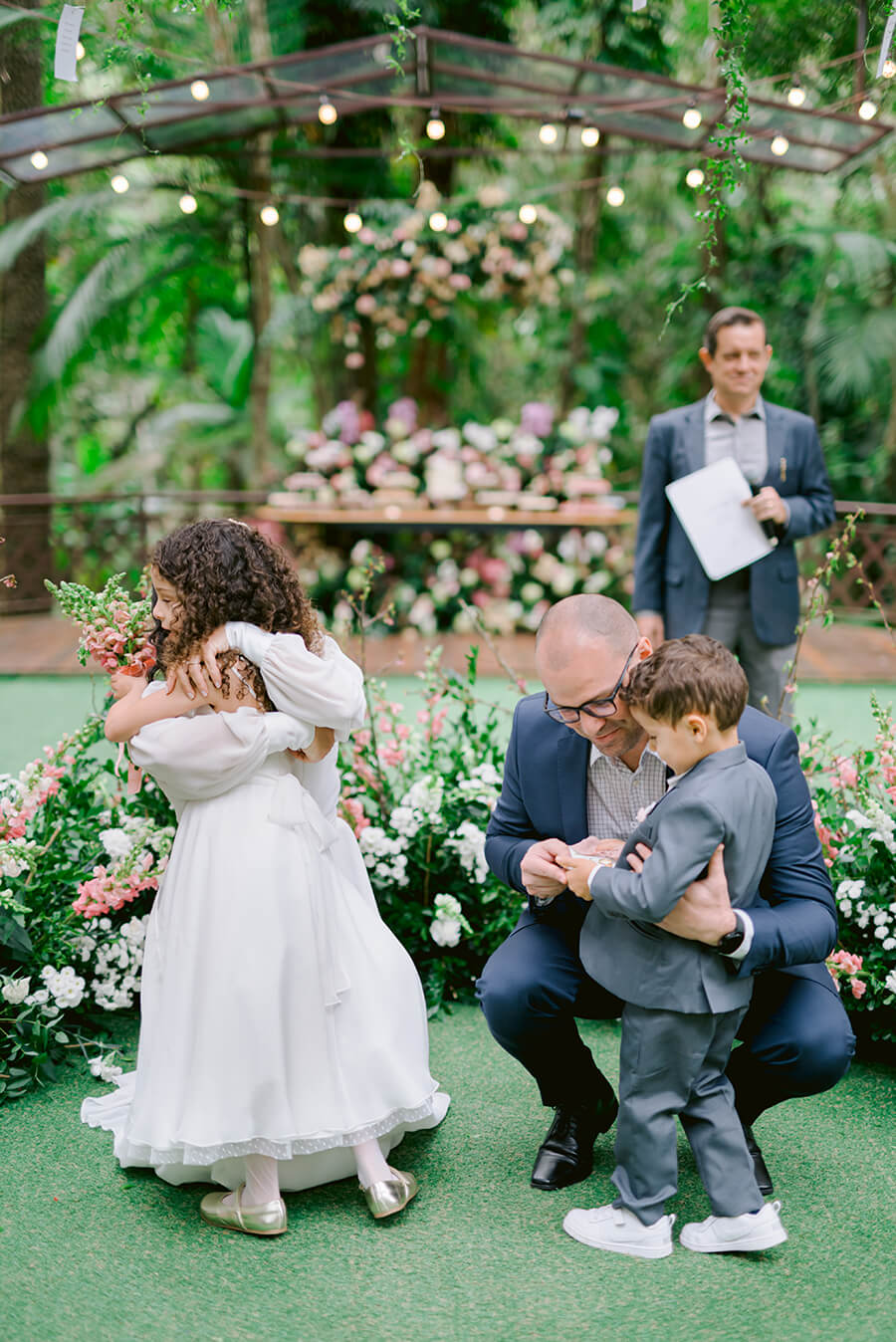 O local escolhido para a renovação de votos não poderia ser outro se não a Casa Giardino, que além de ser rodeada por muita vegetação tem um clima super mágico que parece que abraça a cada visita. Tanto a cerimônia quanto a recepção aconteceram na belíssima capela de vidro do espaço, que é 100% integrada com a natureza, proporciona muita luz natural e ainda cobertura em caso de chuva.