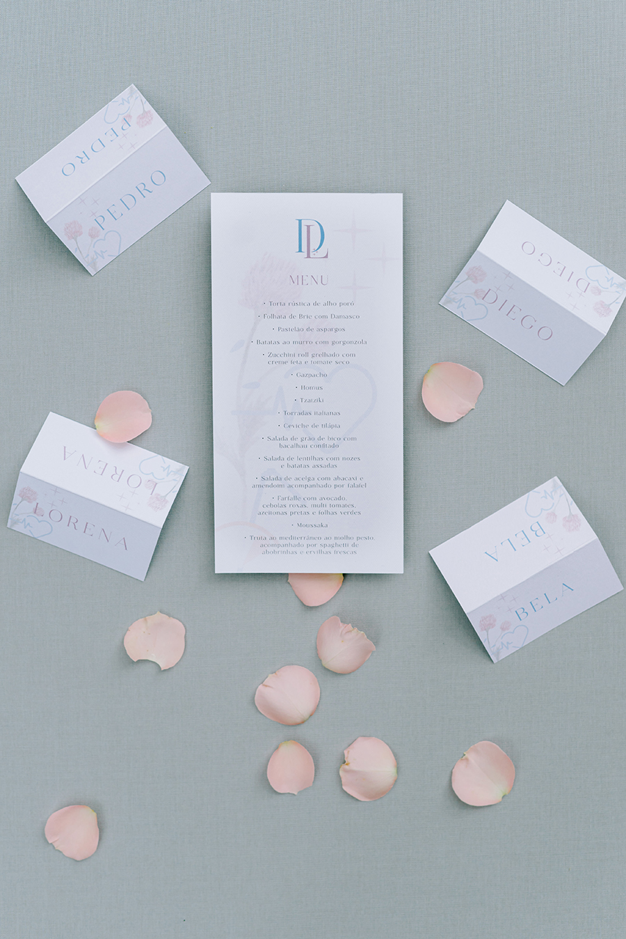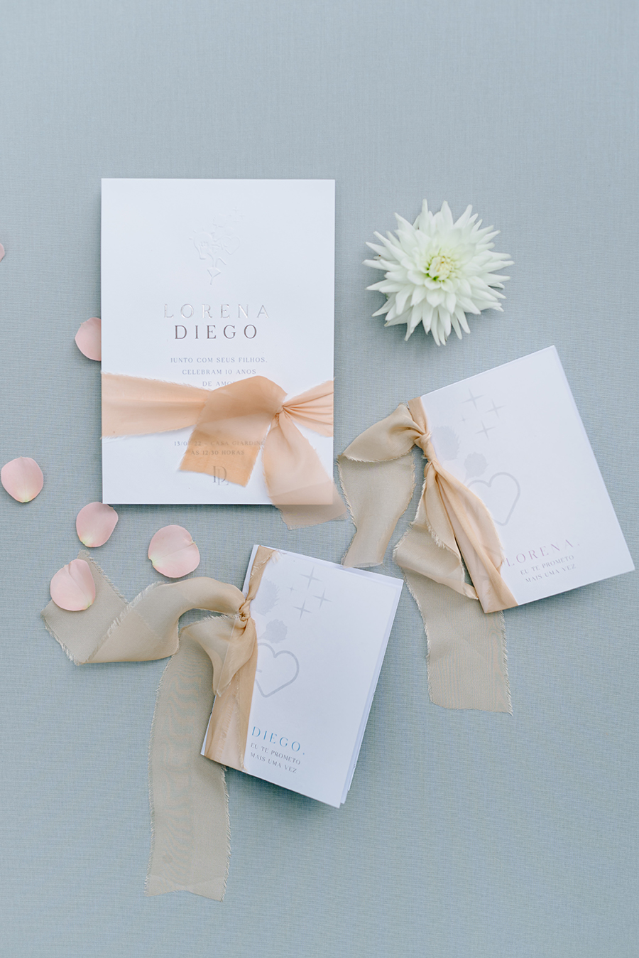 Se tem uma coisa que não faltou nessa renovação de votos foi muito significado em cada detalhe, em cada cantinho, em cada experiência. A identidade visual e papelaria criada pela Santo de Casa Design trouxe elementos da história de amor da Lorena e do Diego: