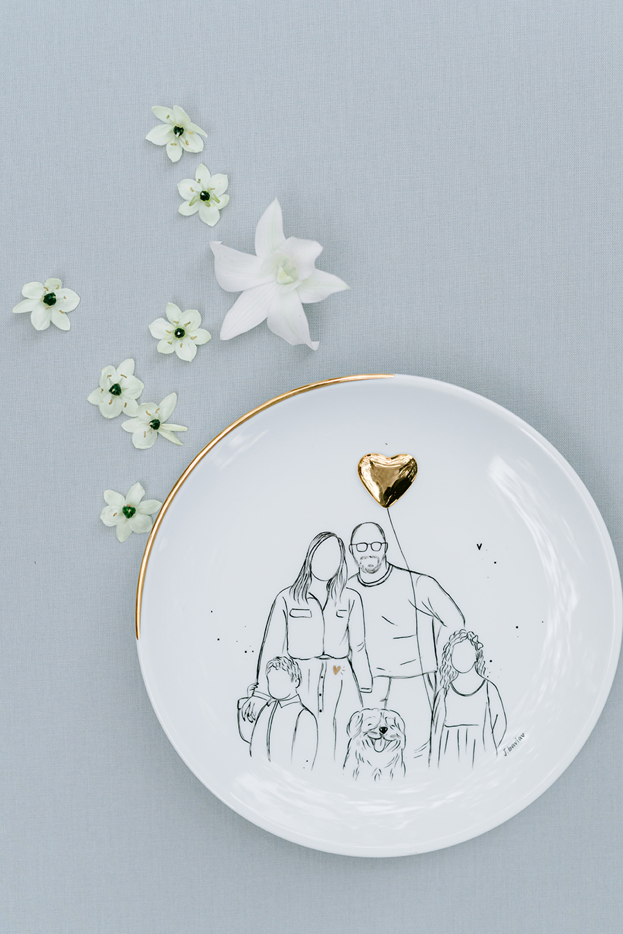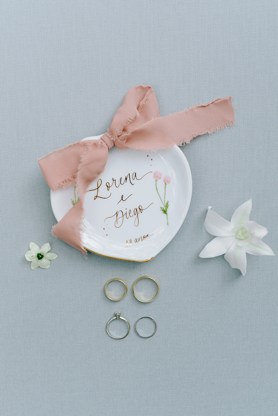 O mais bacana é que essa identidade visual foi gravada nas alianças personalizadas do Thiago Pessoa, e se tornaram uma joia única e cheia de sentimento! Nossos corações bateram mais forte ao ver o porta alianças – também personalizado – do Ateliê Affetivo, que ainda presenteou o casal com um prato de porcelana incrível com pintura da família completa (até a Ana na barriga) que arrancou lágrimas da Lorena.
