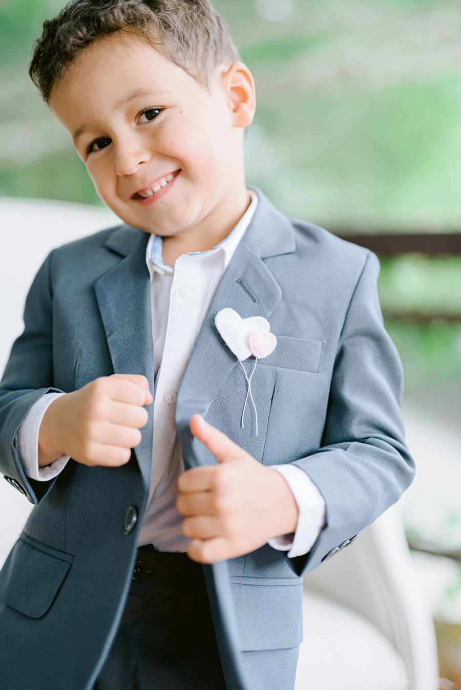 Uma das ideias mais legais que surgiram com a proposta da releitura, foi vestir os filhos do casal exatamente com o mesmo traje que eles oficializaram sua união lá em 2012. Pedro vestiu terninho cinza igual o papai, e repararam na lapela idêntica a que foi usada pelo Diego no casamento? Muuuuito amor!