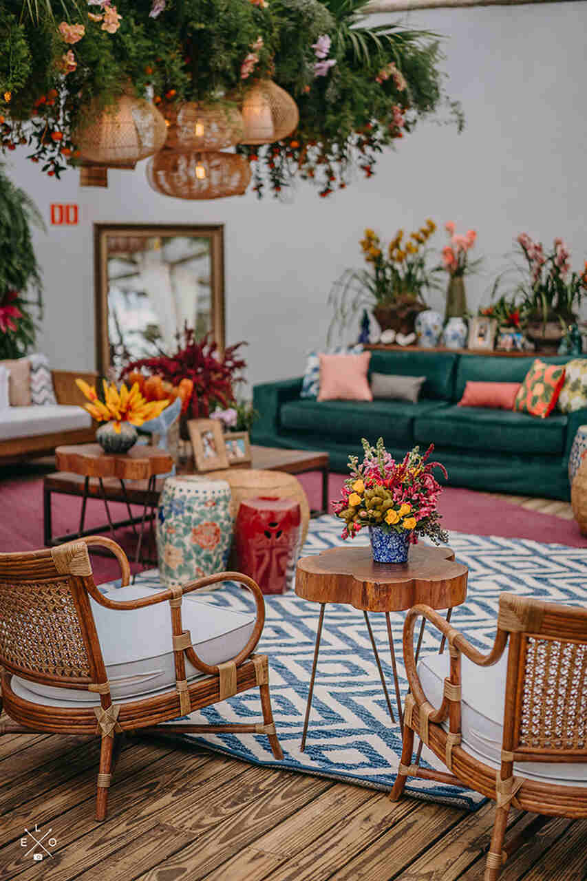 Quer um toque boho? Aposte em móveis de madeira rústica e almofadas estampadas, sofás em fibras, muitas plantas como samambaias e flores desidratadas.