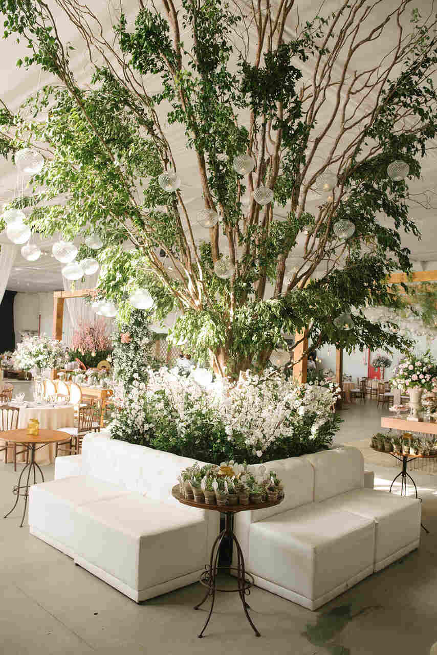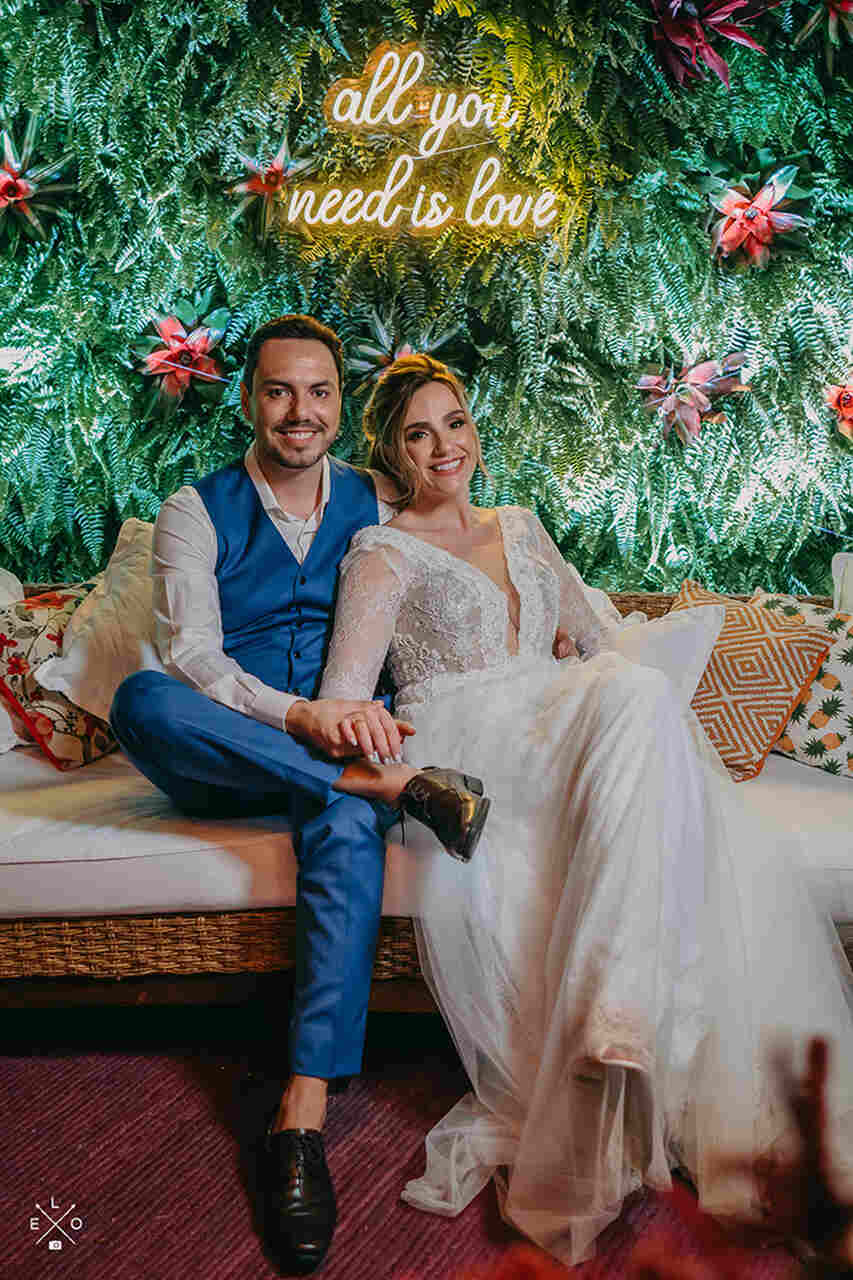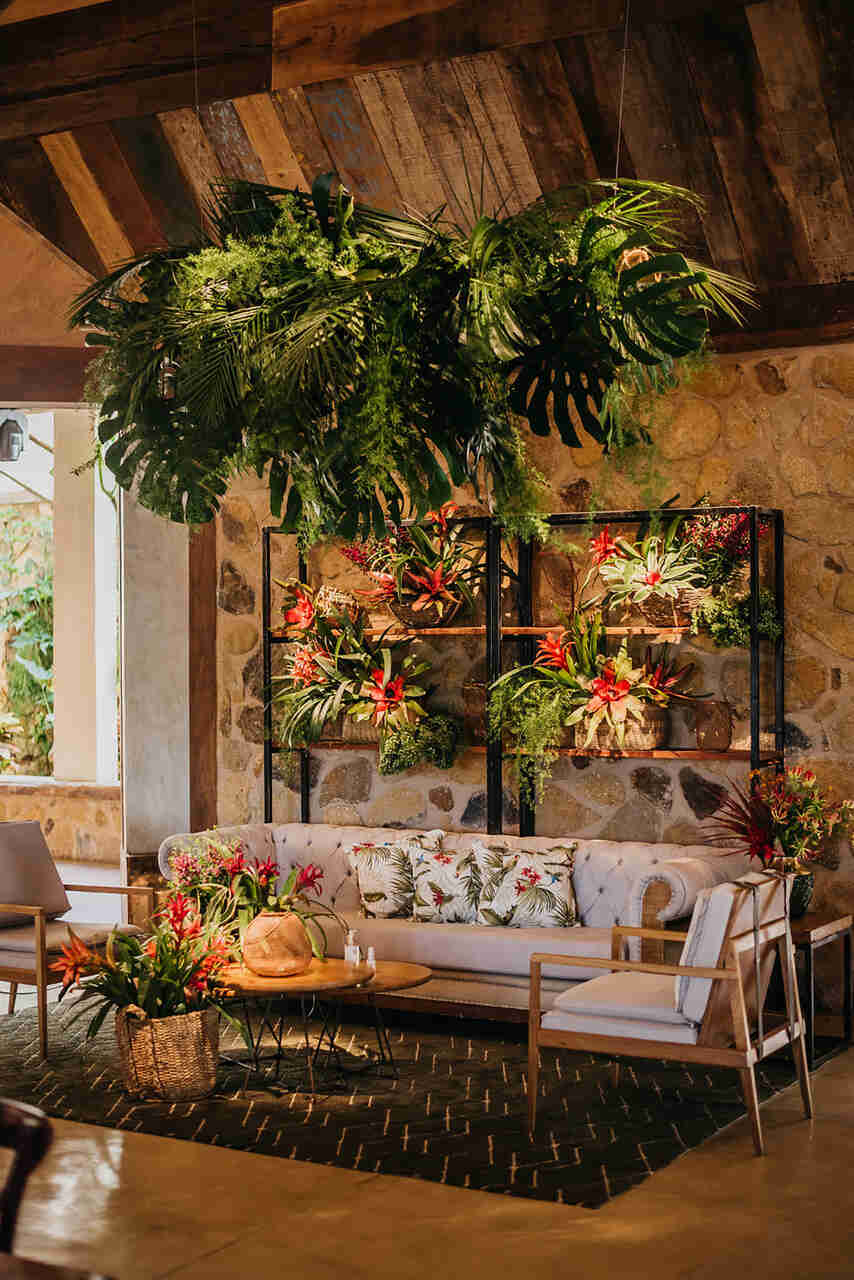 Prefere algo mais clássico? Um sofá de veludo em cor neutra, com arranjos florais delicados, tapete e elementos em vidro é um dos caminhos. Mas se a ideia é combinar com um casamento tropical móveis de bambu ou rattan, almofadas com estampas tropicais, iluminação natural e arranjos com folhagens verdes são uma boa pedida.