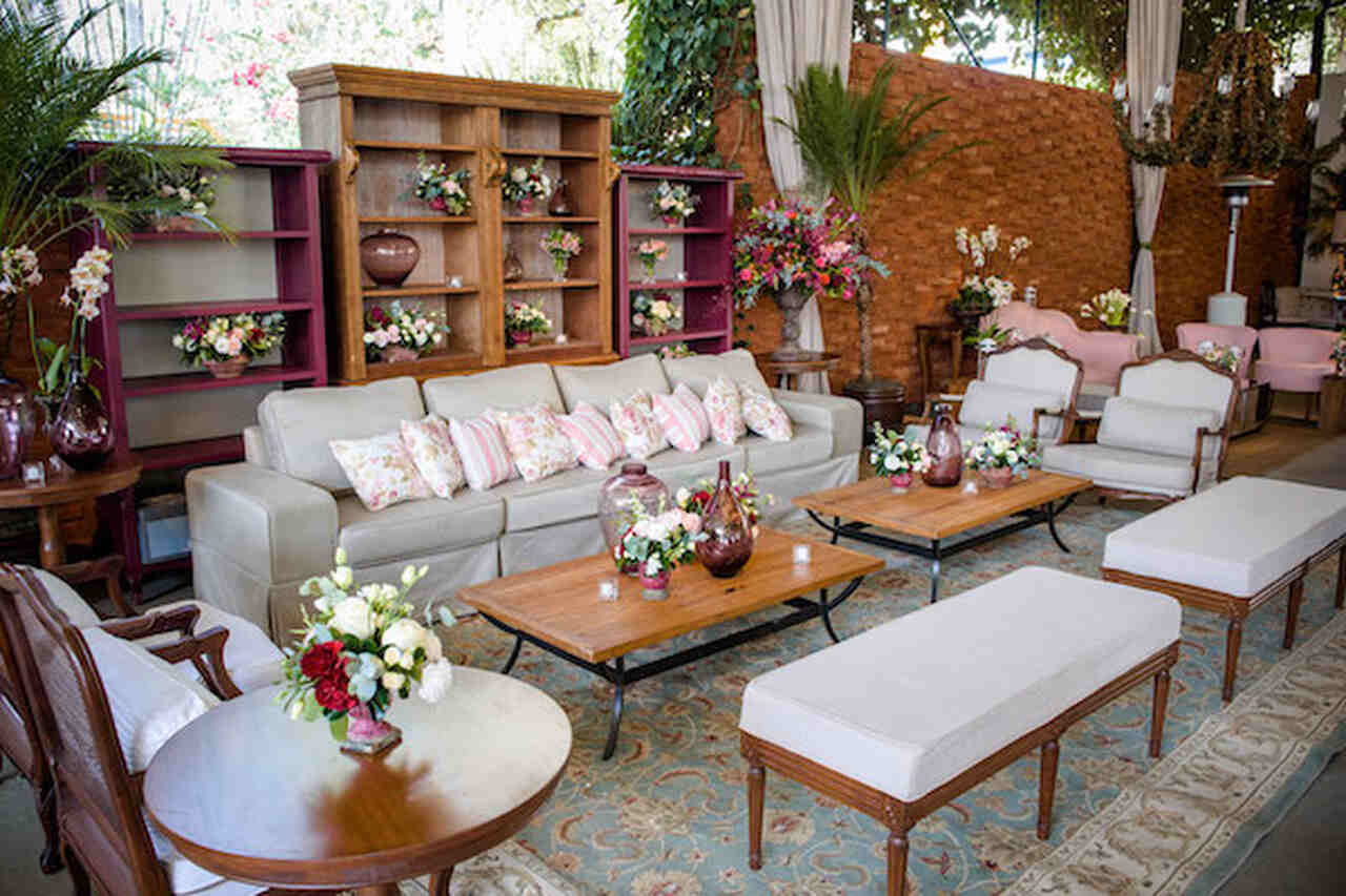 Mais do que bonito, o lounge para casamento é funcional, oferecendo diferentes utilidades. Ele serve como uma pausa para o conforto, sendo o local ideal para relaxar após horas na pista de dança ou longos momentos em pé durante a festa.